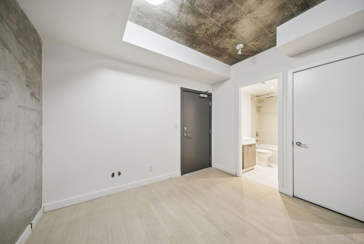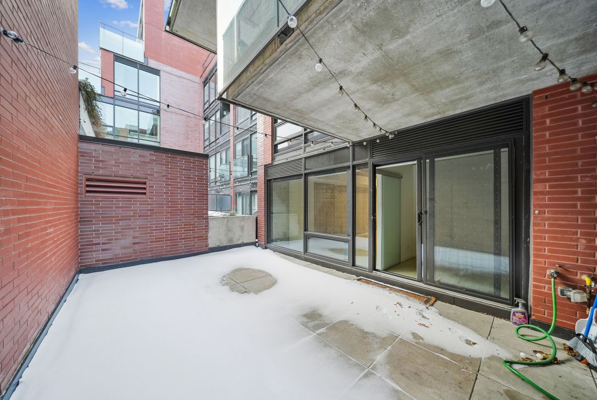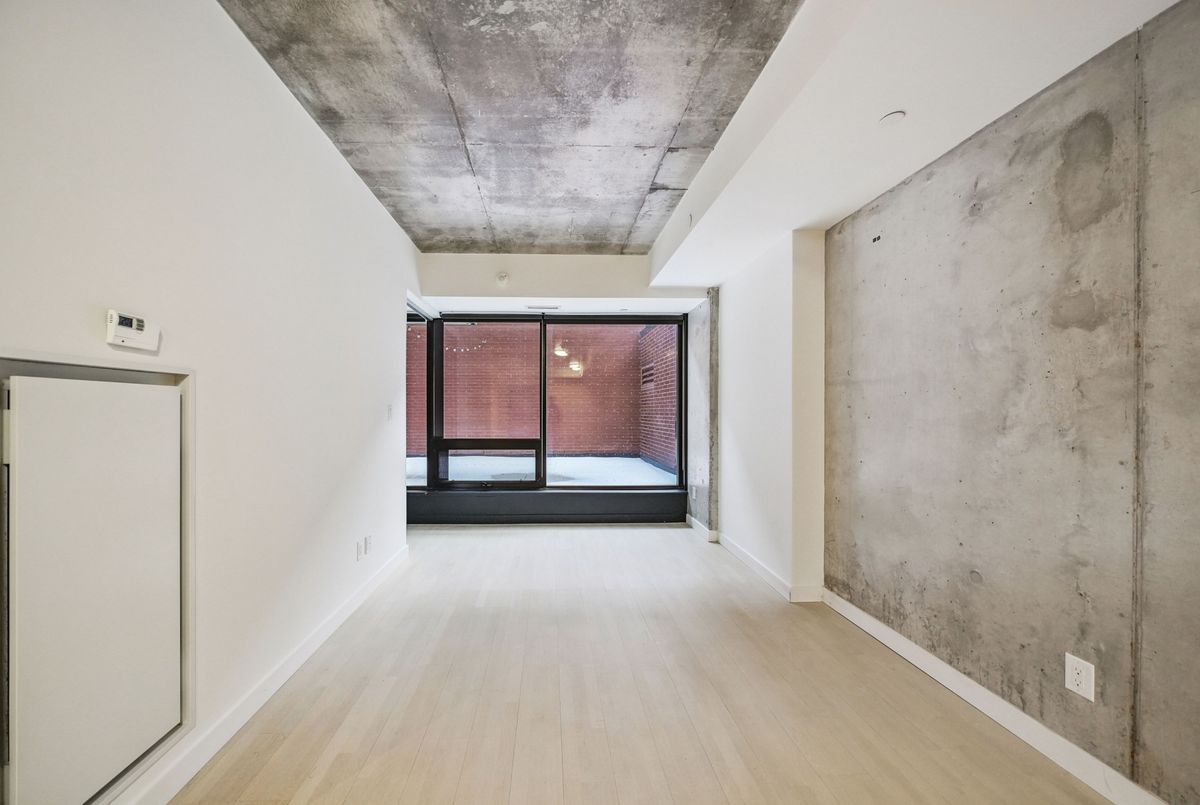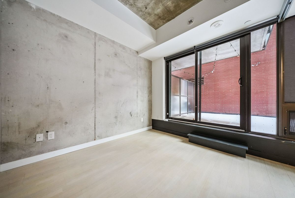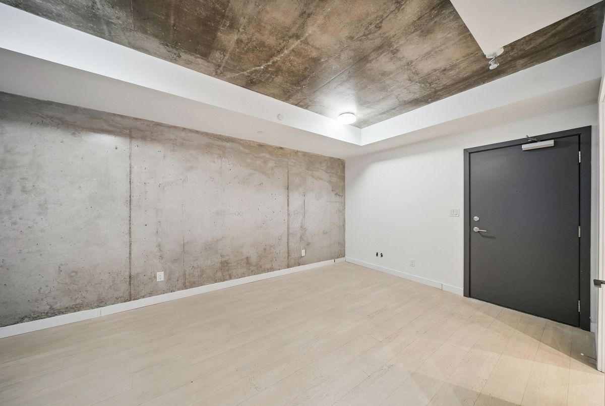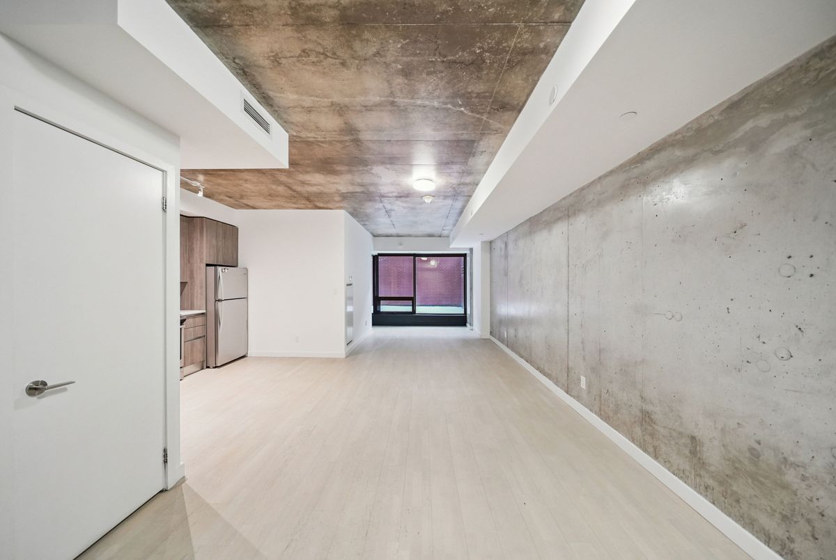 Stylish loft living! This thoughtfully designed suite offers nearly 700 sq ft of interior living space complemented by a rare 200+ sq ft private terrace, perfect for outdoor dining, entertaining, or creating your own urban oasis.The open-concept layout features exposed concrete ceilings and walls, wide-plank light flooring, and floor-to-ceiling windows. A sleek, modern kitchen is equipped with stainless steel appliances, ample storage, and enclosed in suite laundry. The private bedroom offers clean lines and a modern aesthetic. A four piece bath completes the space. Step outside to your oversized, terrace, an extension of your living area rarely found in the city. Additional features include a bike locker for extra storage. Located in steps to transit, cafes, restaurants, and shops, with easy access to downtown.