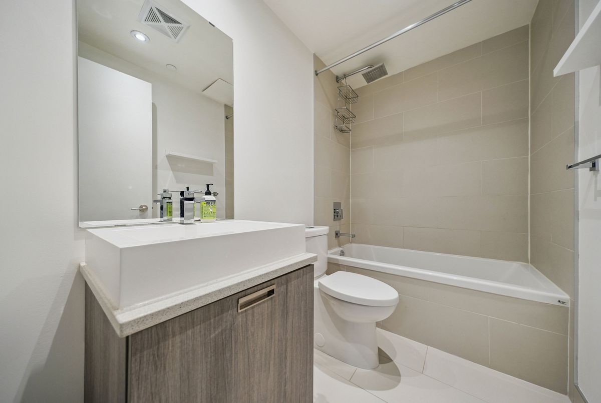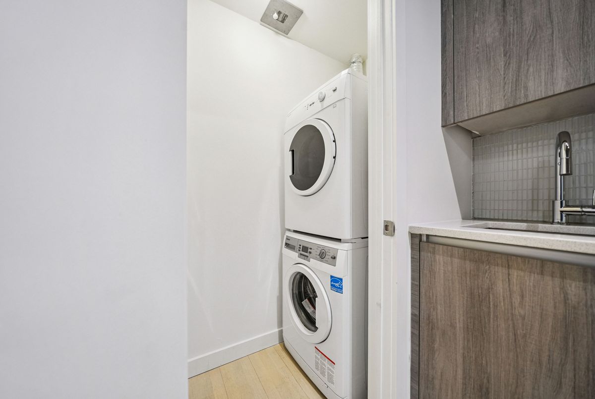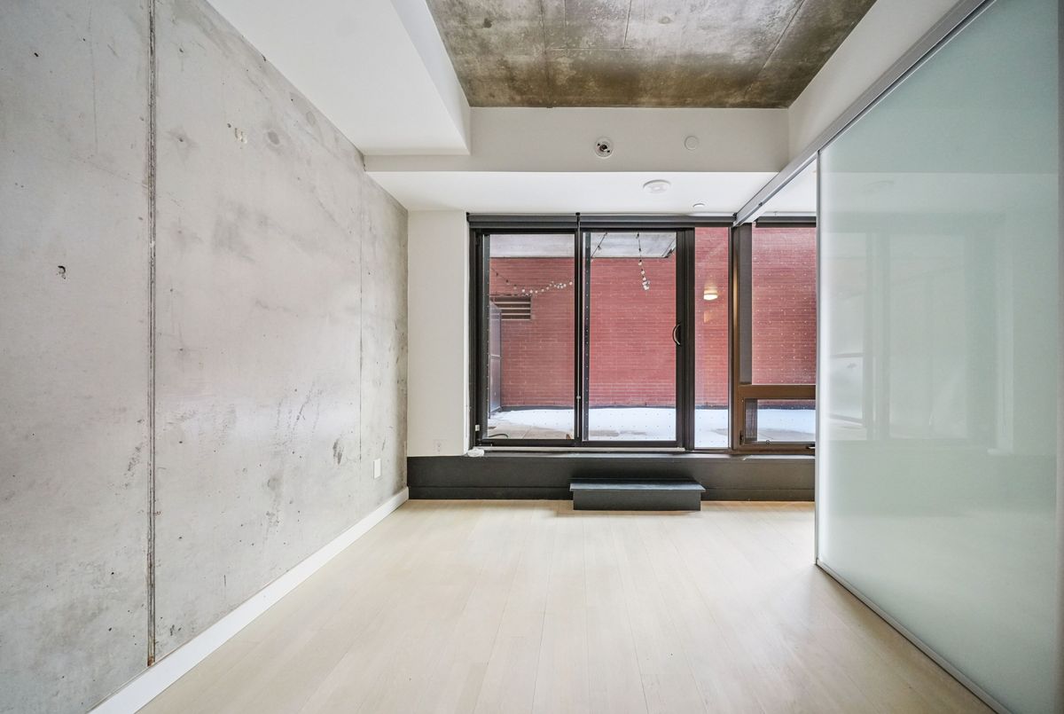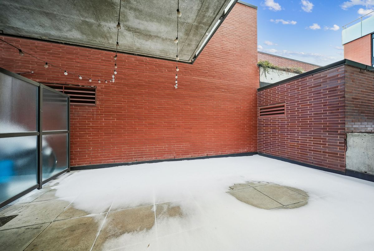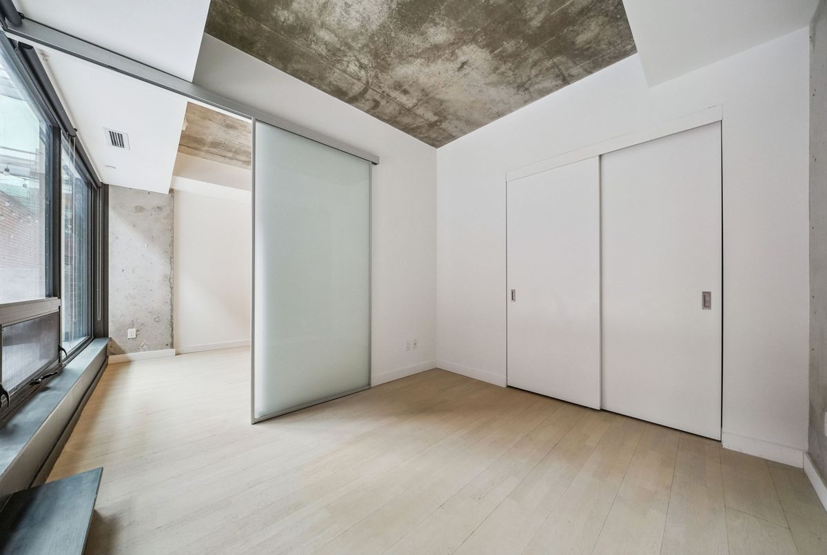 Stylish loft living! This thoughtfully designed suite offers nearly 700 sq ft of interior living space complemented by a rare 200+ sq ft private terrace, perfect for outdoor dining, entertaining, or creating your own urban oasis.The open-concept layout features exposed concrete ceilings and walls, wide-plank light flooring, and floor-to-ceiling windows. A sleek, modern kitchen is equipped with stainless steel appliances, ample storage, and enclosed in suite laundry. The private bedroom offers clean lines and a modern aesthetic. A four piece bath completes the space. Step outside to your oversized, terrace, an extension of your living area rarely found in the city. Additional features include a bike locker for extra storage. Located in steps to transit, cafes, restaurants, and shops, with easy access to downtown.