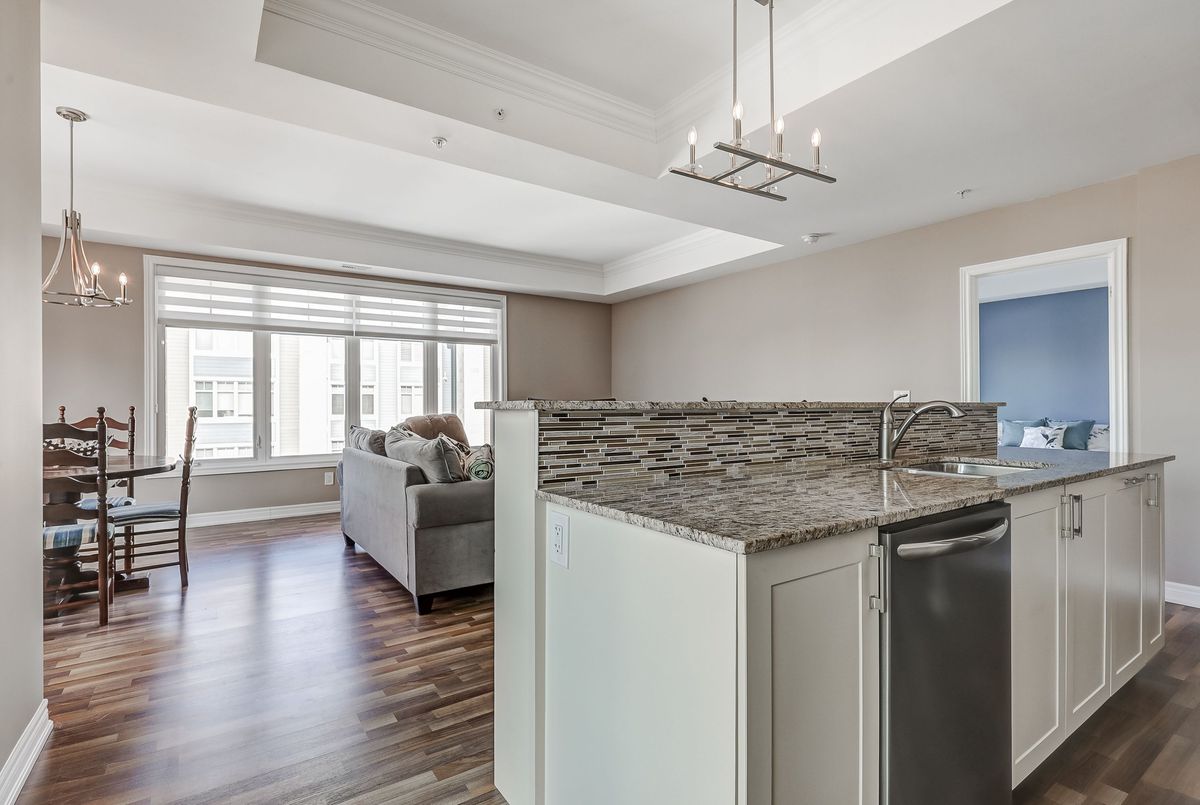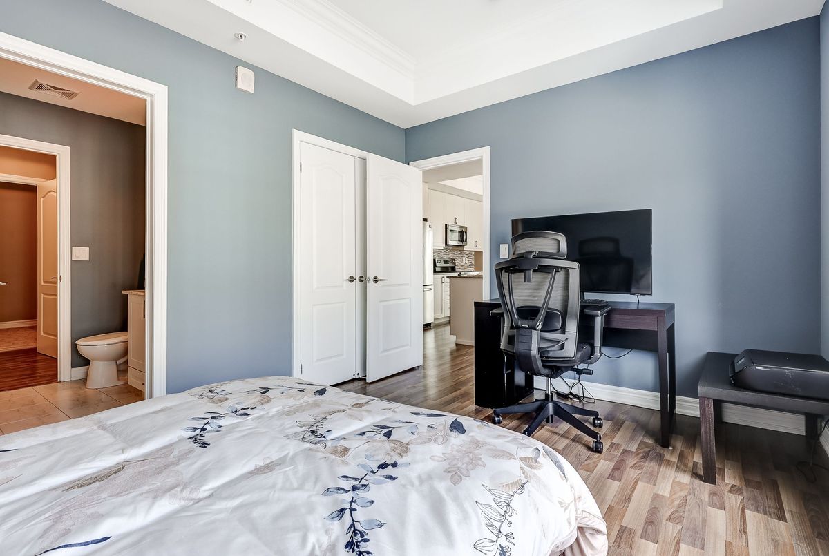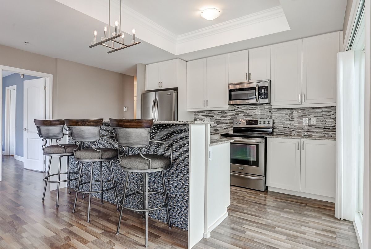 Elevate Your Lifestyle at Harbourside Condos in Whitby Shores, where this meticulously maintained 2+1 bedroom residence awaits. Spanning an impressive 1,322 square feet and featuring 9' coffered smooth ceilings with crown moulding and custom zebra window blinds. This spacious unit offers a thoughtfully designed layout ideal for modern living. The open-concept living and dining area creates an inviting flow, perfect for relaxation or entertaining. The gourmet kitchen boasts stainless steel appliances, elegant granite countertops, under-cabinet lighting, and a contemporary tile backsplash. The central island, complete with a breakfast bar, is perfect for casual dining. Step out onto your private balcony to savour morning coffee or bask in the beauty of evening sunsets. Retreat to your private primary bedroom featuring a walk-in closet and a luxurious 3-piece ensuite bath with a walk-in shower. This split bedroom floor plan offers a second bedroom equipped with a large double closet and a convenient semi-ensuite 4-piece bath. The versatile den is perfect as a home office, private study, or guest suite, enhancing the functionality of this exceptional living space. Enjoy the convenience of underground parking ideally located near the entrance, alongside a private locker for additional storage. As a resident of Harbourside Condos, enjoy exclusive access to the Pavilion Clubhouse, which features event spaces, full kitchens, a rooftop patio with stunning lake views, and inviting outdoor BBQ areas-ideal for gatherings. Located steps from scenic waterfront trails, the Whitby Yacht Club, Iroquois Park Sports Centre, accessible public transit, restaurants, and local amenities,. Commuting to downtown or around the GTA is made easy with close proximity to Whitby GO Station and Highway 401. Make Harbourside Condos your new home and embrace the vibrant lifestyle that Whitby Shores has to offer.