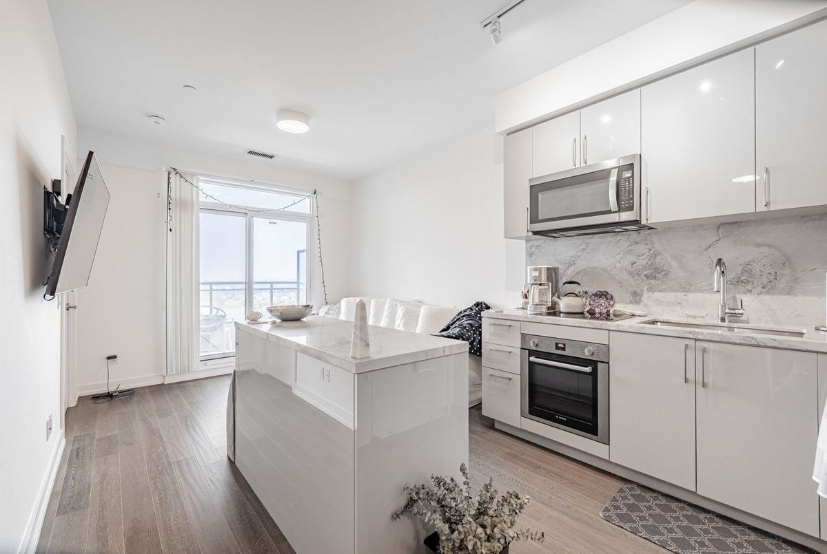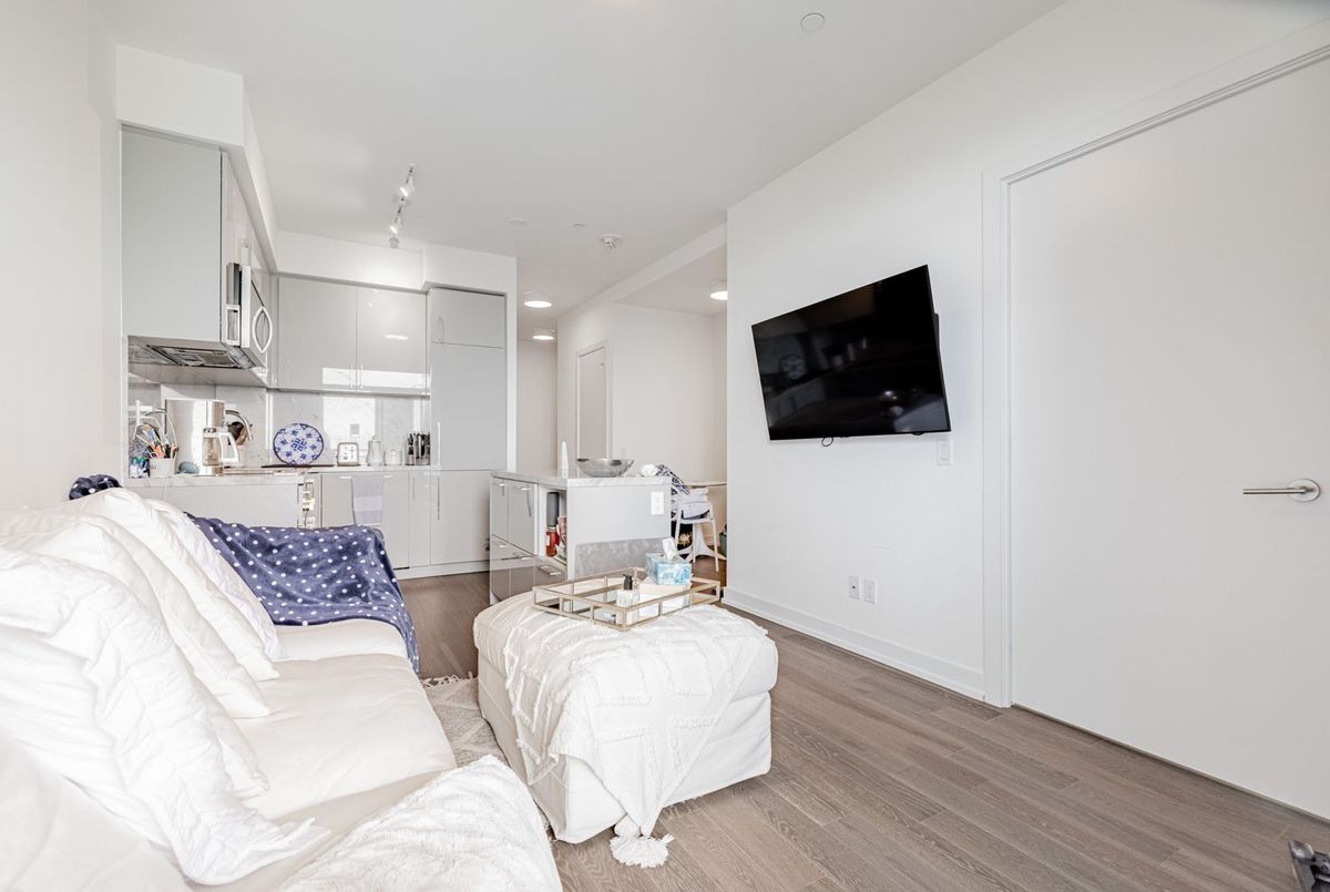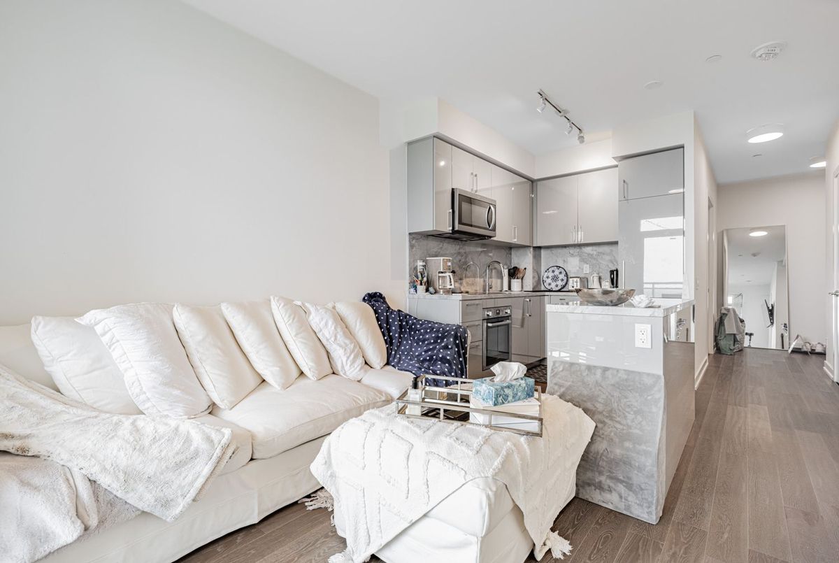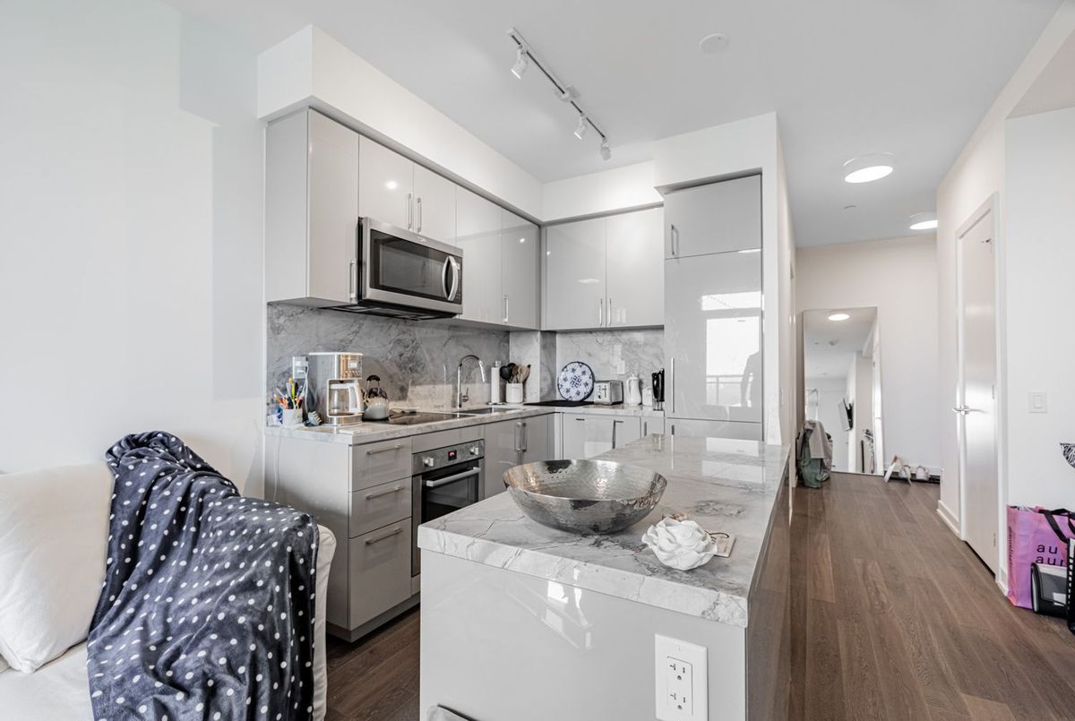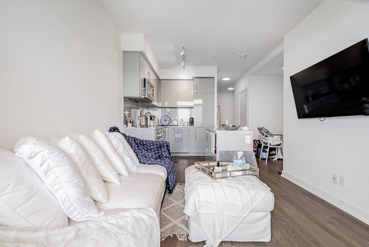 Step into this stunning 1 Bed + Den, 1 Bath condo that perfectly blends style, sophistication, and practicality. Boasting soaring 9-foot smooth ceilings and warm hardwood floors, this bright and inviting residence is filled with natural light from its large east-facing windows and open balcony, offering breathtaking unobstructed sunrise views facing the park! The custom-upgraded kitchen is a standout feature, showcasing sleek cabinetry, stainless steel appliances, granite countertops, and a stylish backsplash, all centered around a functional island ideal for casual meals or entertaining. The spacious den serves perfectly as a home office or dining area. With generous closet space and a thoughtfully designed layout, every detail enhances everyday living. Enjoy premium building amenities including a concierge, fully equipped gym, and a cozy media room. Located just steps to highways, public transit, top-rated schools, shopping, and more!  This condo truly has it all!
