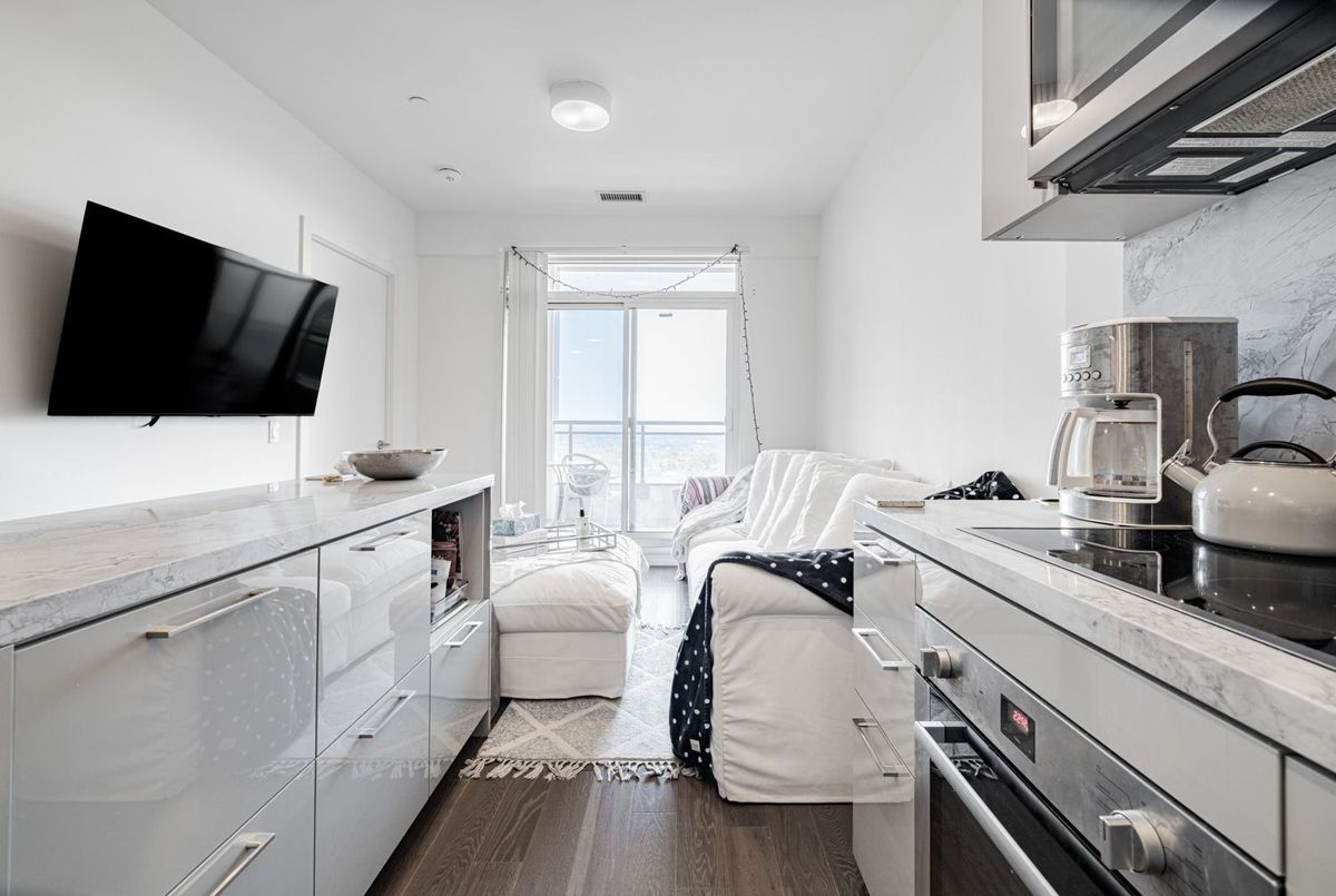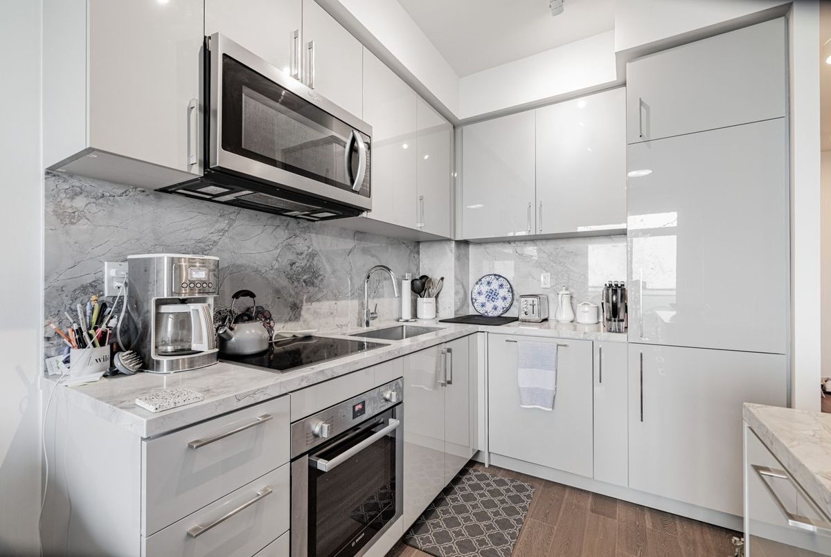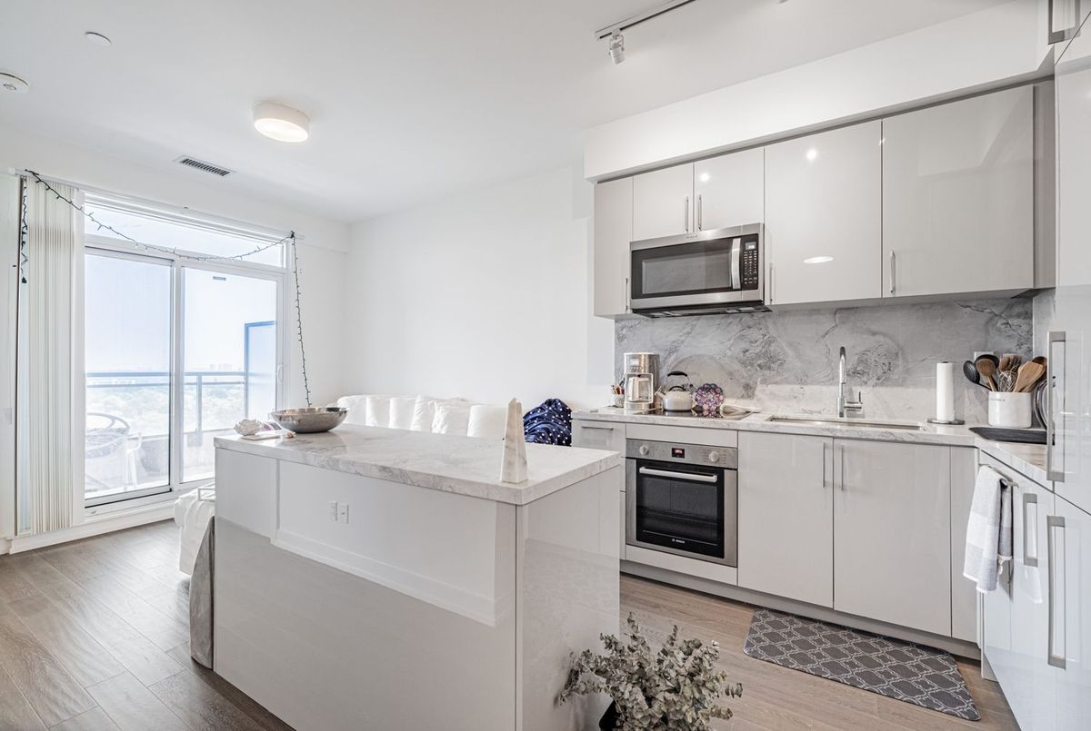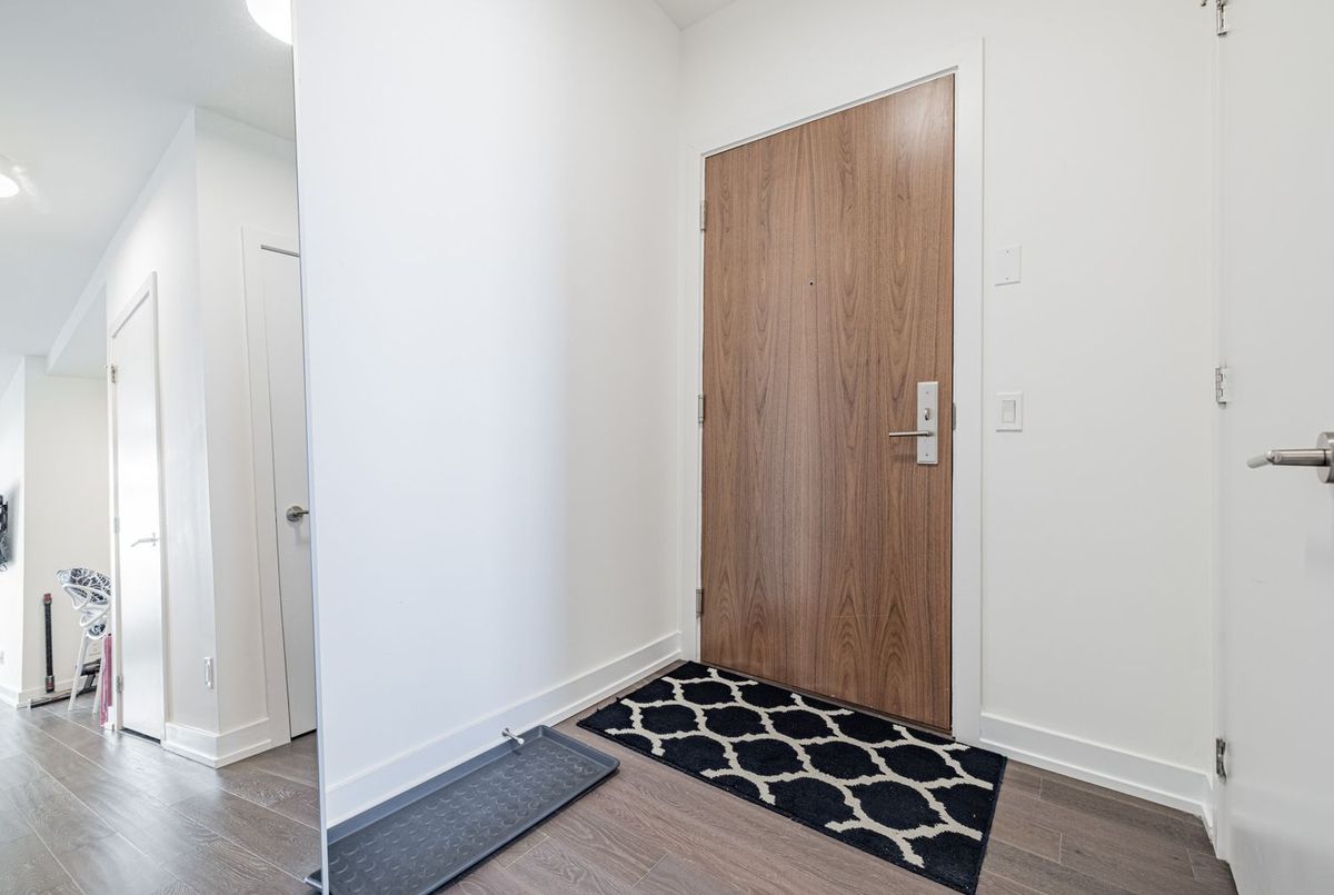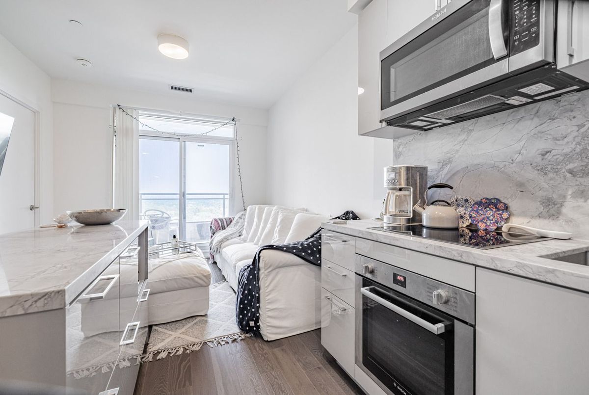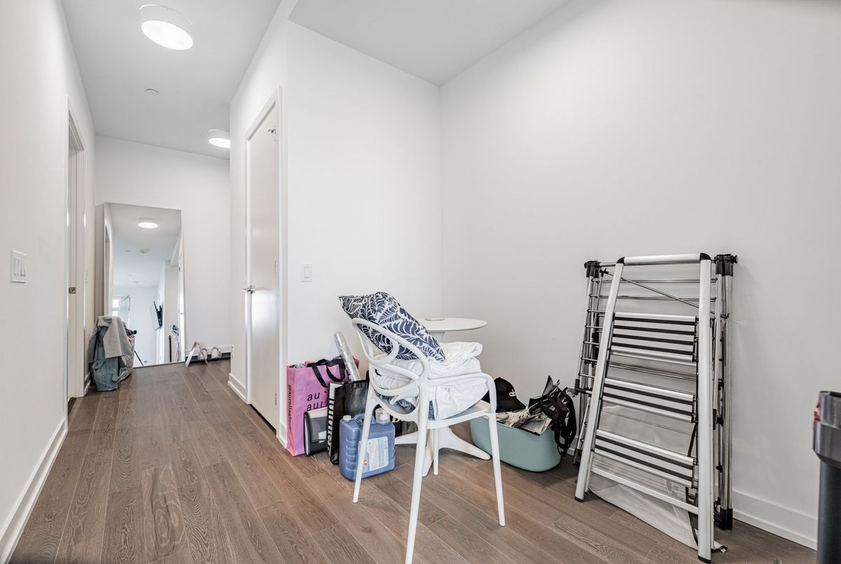 Step into this stunning 1 Bed + Den, 1 Bath condo that perfectly blends style, sophistication, and practicality. Boasting soaring 9-foot smooth ceilings and warm hardwood floors, this bright and inviting residence is filled with natural light from its large east-facing windows and open balcony, offering breathtaking unobstructed sunrise views facing the park! The custom-upgraded kitchen is a standout feature, showcasing sleek cabinetry, stainless steel appliances, granite countertops, and a stylish backsplash, all centered around a functional island ideal for casual meals or entertaining. The spacious den serves perfectly as a home office or dining area. With generous closet space and a thoughtfully designed layout, every detail enhances everyday living. Enjoy premium building amenities including a concierge, fully equipped gym, and a cozy media room. Located just steps to highways, public transit, top-rated schools, shopping, and more!  This condo truly has it all!