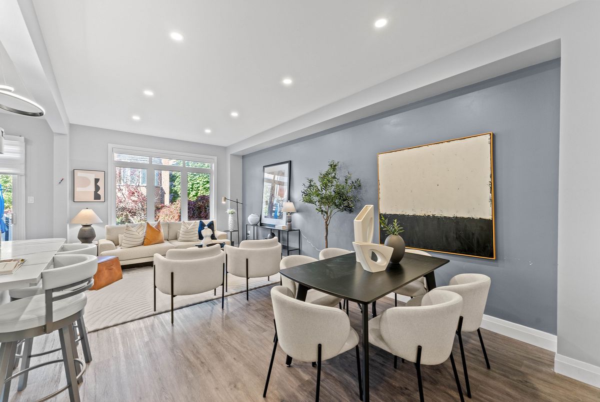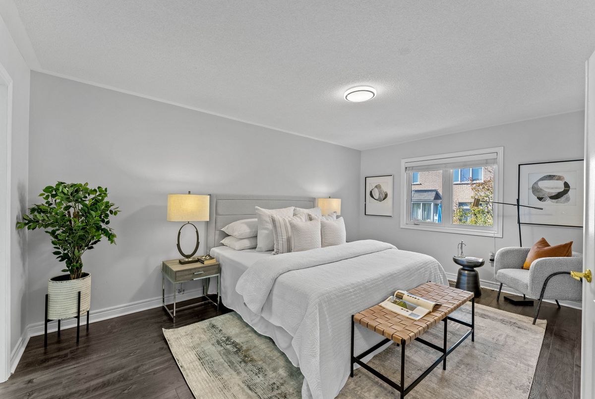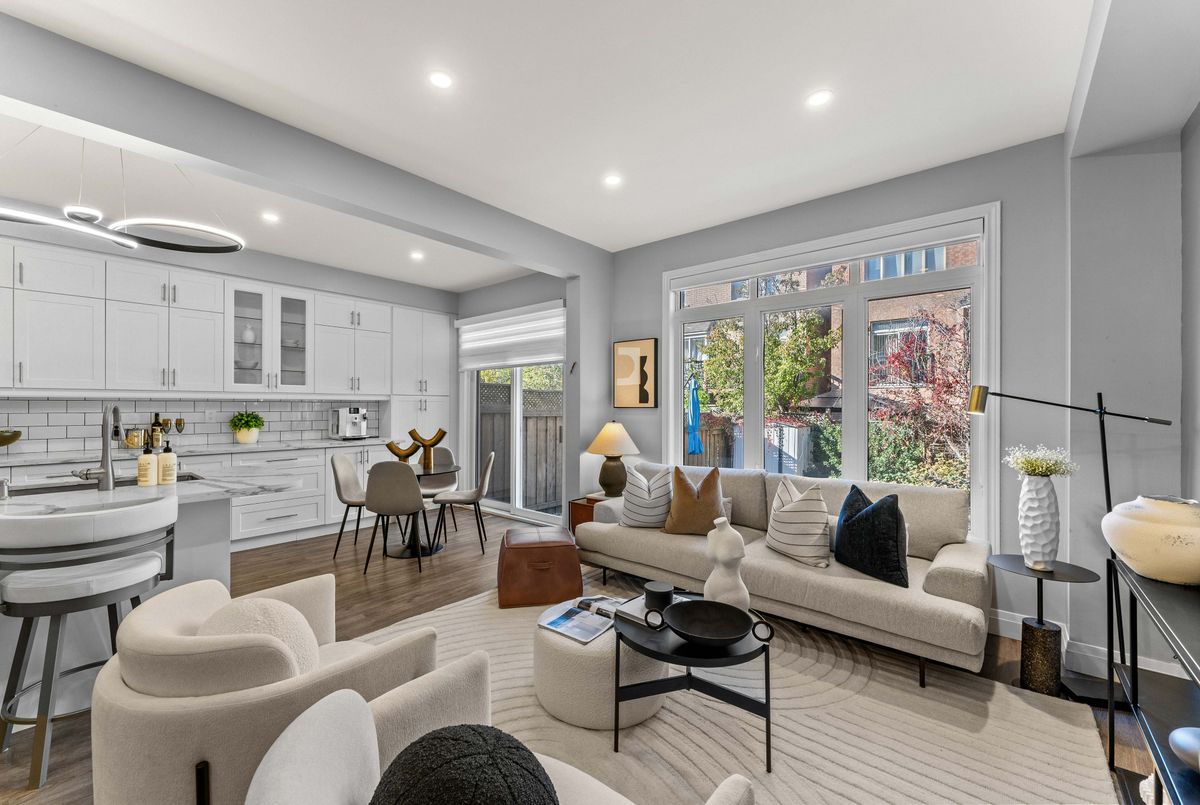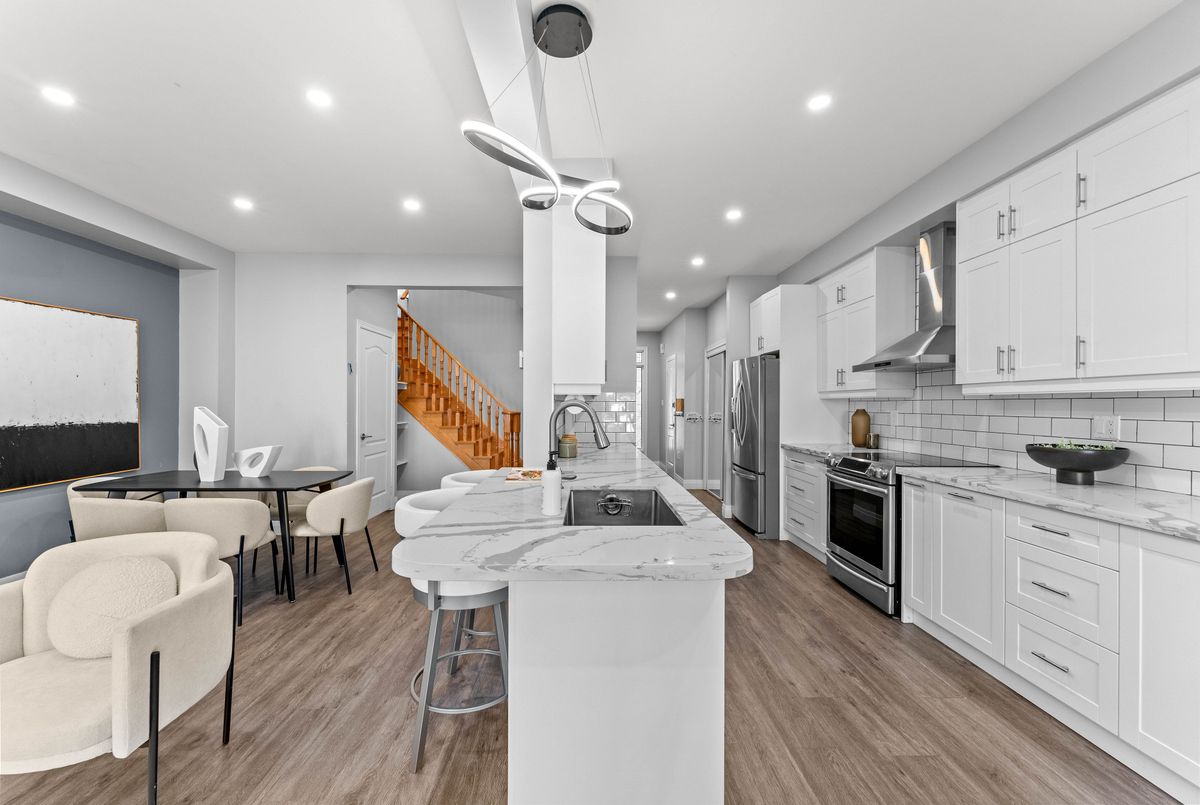 This stunning 3-bedroom, 3-bath townhouse is tucked away on one of the quietest streets in highly sought-after Thornhill Woods. Enjoy 9-foot ceilings on the main floor and a fully renovated kitchen (2022) featuring sleek stainless steel appliances, quartz countertops, a breakfast bar, and an abundance of cabinetry - perfect for storage and style. The inviting eat-in dining area opens to a private backyard, ideal for entertaining or relaxing with family. The open-concept living and dining rooms create a natural flow for gatherings, while the split-level family room, filled with natural light, offers the flexibility to serve as a 4th bedroom, a home office, or a cozy retreat. Upstairs, unwind in the freshly renovated (2025), spa-inspired primary ensuite - your personal sanctuary after a long day. Located close to top-rated schools, parks, community centers, shops, restaurants, and public transit, this home perfectly blends comfort, style, and convenience. A truly must-see property that's dangerously move-in ready - where every detail feels just right.
