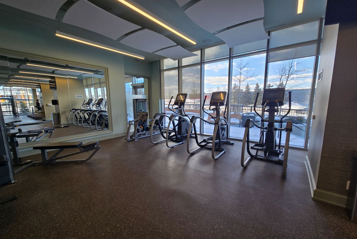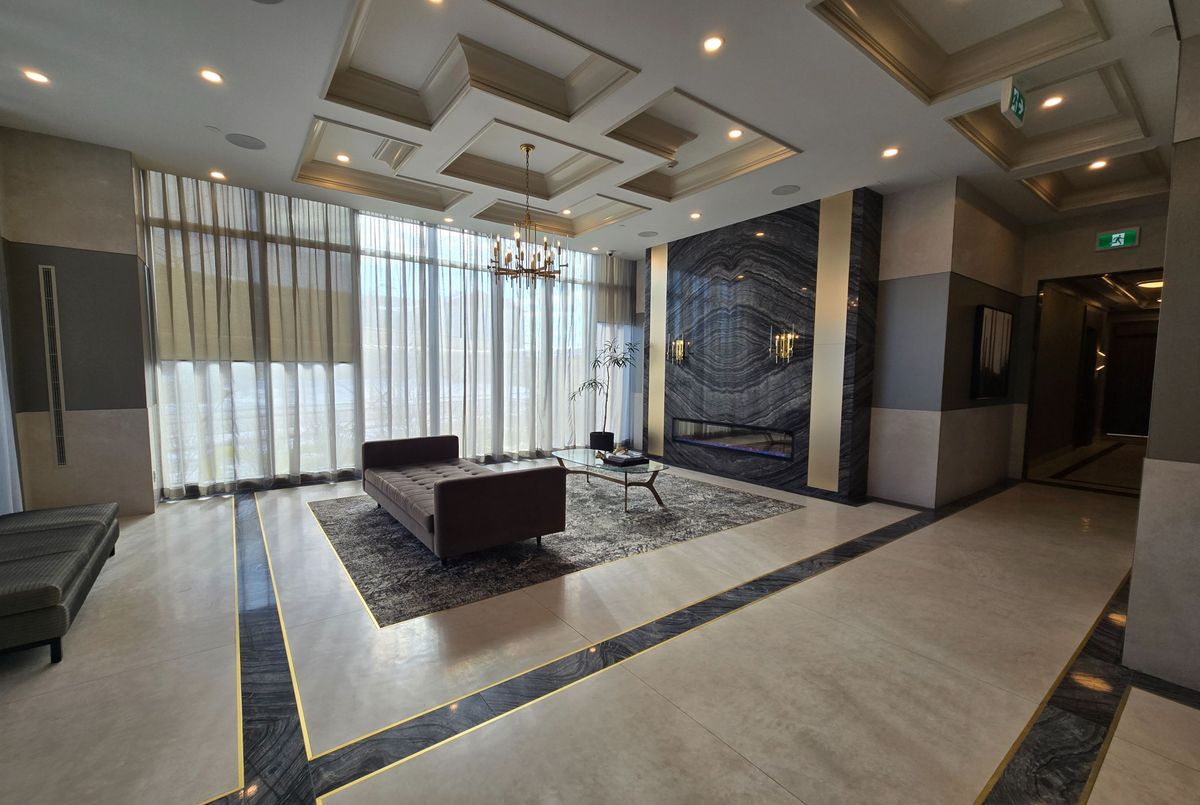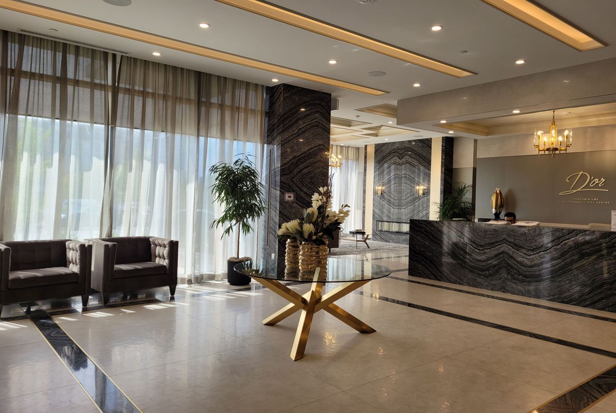 Welcome to the fabulous D'or Condos in the heart of Thornhill! This bright and spacious 1 bedroom plus den, 2-bathroom suite boasts an ideal 709 sq ft layout with lofty 9 ft ceilings, modern finishes, floor-to-ceiling windows, and no wasted space. The open-concept living area easily accommodates a sectional and dining table, while the generous primary bedroom comfortably fits a king-size bed. The modern kitchen features stylish white shaker cabinets, granite countertops, and stainless steel appliances. Enjoy two walkouts to your private balcony with a sunny, south-facing exposure and unobstructed views. The den works perfectly as a home office. This unit includes underground parking, a storage locker, and VIP access to resort-style amenities, including an indoor/outdoor pool, fitness centre, yoga studio, party room with chef's kitchen, lounge, theatre, sun deck with gazebos, hot tub, sauna, guest suites, dog spa, and 24-hour concierge. Conveniently located near Promenade Mall, transit, shopping, dining, Hwy 7/407, parks, trails, and so much more. Book your tour today.
