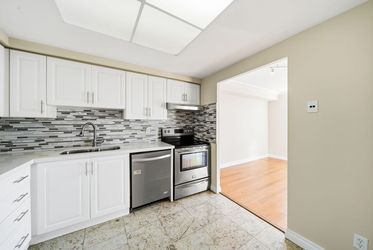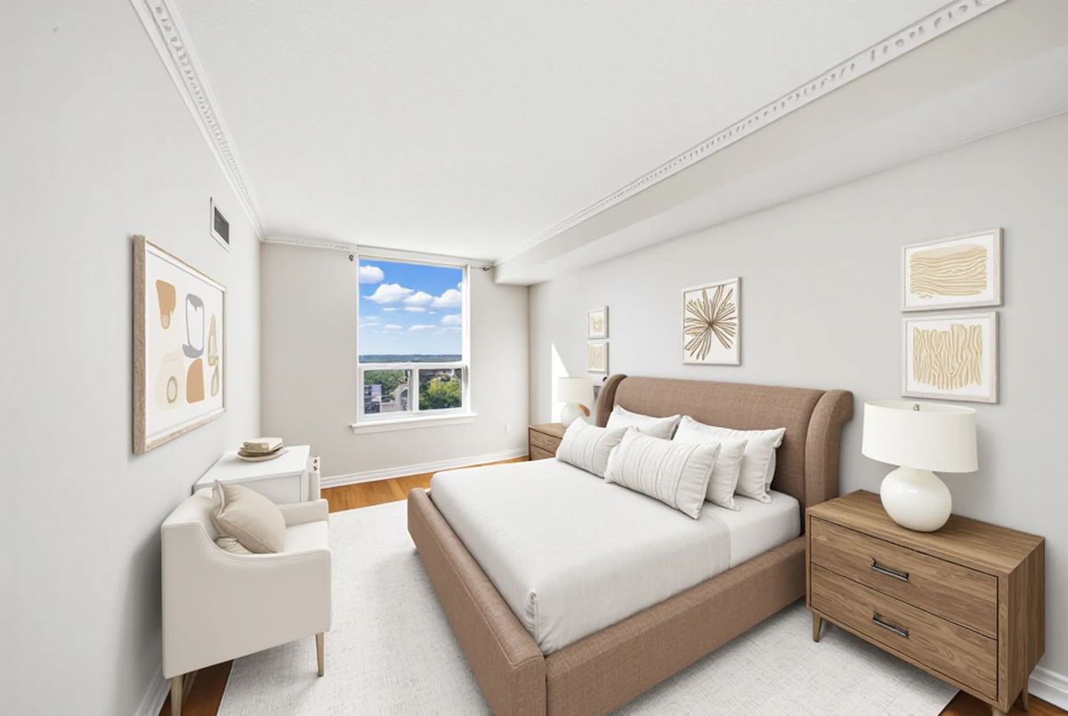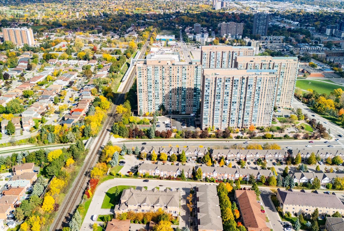 Welcome to this beautifully designed, freshly painted, large 1 bedroom + solarium + separate dining room condo offering incredible natural light and breathtaking southwest facing views. This 844 sq ft open-concept gem features, crown moulding, a versatile sun-drenched solarium ideal as a home office, flex space, or playroom. Enjoy a spacious primary bedroom with a large walk-in closet, ensuite laundry, hardwood flooring, and stainless-steel appliances in a tastefully renovated kitchen. With one parking space included, this move-in-ready unit is ideal for professionals, couples, or small families. Perfectly located just steps from Cooksville GO Station, top-rated schools, and minutes from Square One, offering every convenience of vibrant Mississauga living. The building also offers 24-hour security, a gym, squash/tennis courts, and ample visitor parking. ( Some photos have been virtually staged )