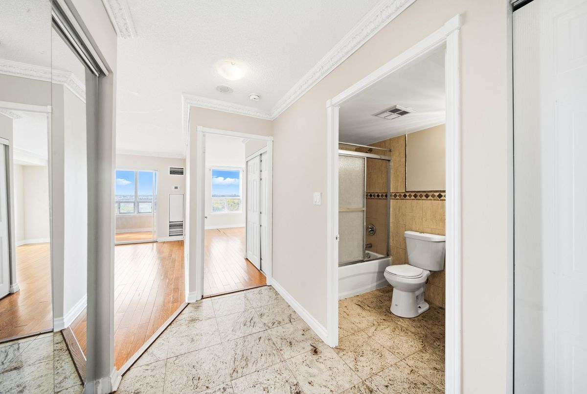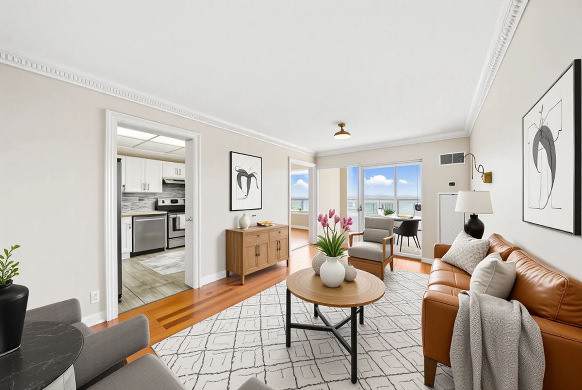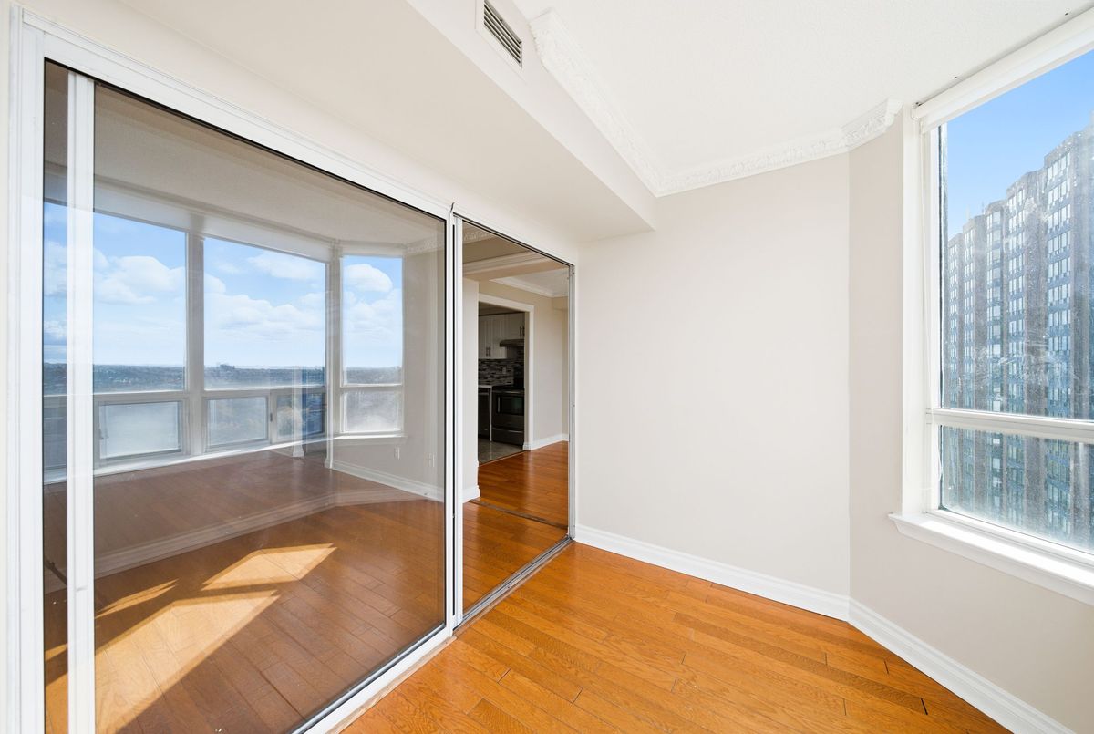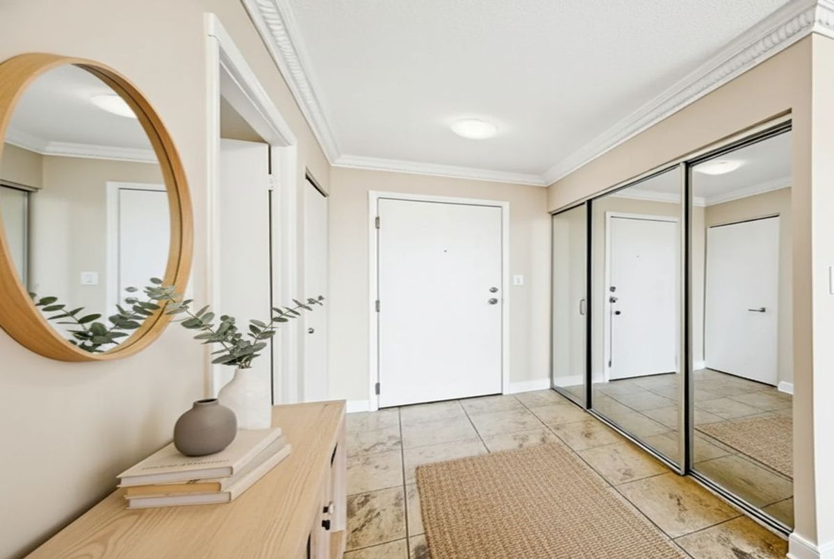 Welcome to this beautifully designed, freshly painted, large 1 bedroom + solarium + separate dining room condo offering incredible natural light and breathtaking southwest facing views. This 844 sq ft open-concept gem features, crown moulding, a versatile sun-drenched solarium ideal as a home office, flex space, or playroom. Enjoy a spacious primary bedroom with a large walk-in closet, ensuite laundry, hardwood flooring, and stainless-steel appliances in a tastefully renovated kitchen. With one parking space included, this move-in-ready unit is ideal for professionals, couples, or small families. Perfectly located just steps from Cooksville GO Station, top-rated schools, and minutes from Square One, offering every convenience of vibrant Mississauga living. The building also offers 24-hour security, a gym, squash/tennis courts, and ample visitor parking. ( Some photos have been virtually staged )