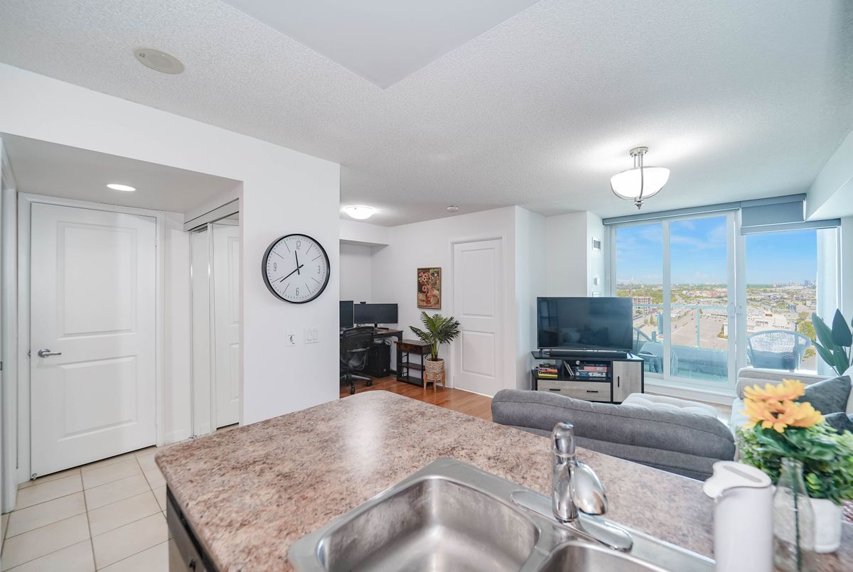 Welcome to One Sherway Tower 1, where modern design, comfort, and everyday convenience come together. This beautifully maintained 1 Bedroom plus Den suite features floor to ceiling windows, hardwood flooring, and a bright open concept layout that feels both spacious and inviting. The contemporary kitchen is designed for functionality and style, offering a breakfast bar, full size appliances, built in microwave, and dishwasher, perfect for daily living and entertaining. Enjoy the added convenience of ensuite laundry and step out onto your private balcony to take in serene north facing views. The primary bedroom is filled with natural light and offers a calm, comfortable retreat. The versatile den provides excellent flexibility and can be used as a home office, dining area, or guest space. This suite also includes parking and a storage locker, adding everyday practicality and long term value. Residents enjoy resort style amenities including an indoor pool, hot tub, fully equipped gym, theatre room, and party space. Ideally located just steps from Sherway Gardens, restaurants, cafes, transit, GO stations, and nearby trails, offering exceptional walkability and connectivity. An excellent opportunity for professionals, couples, or investors seeking a well cared for home in a highly desirable Etobicoke location. Book your private showing today