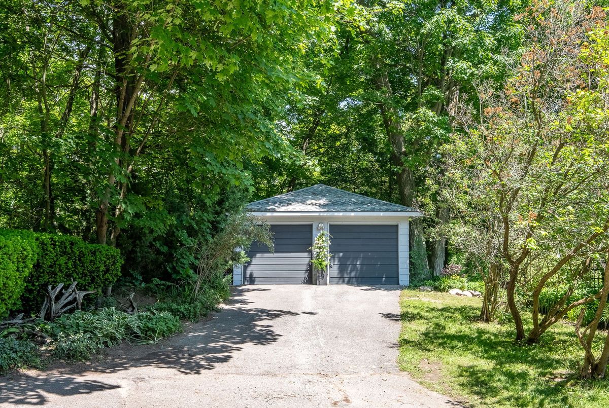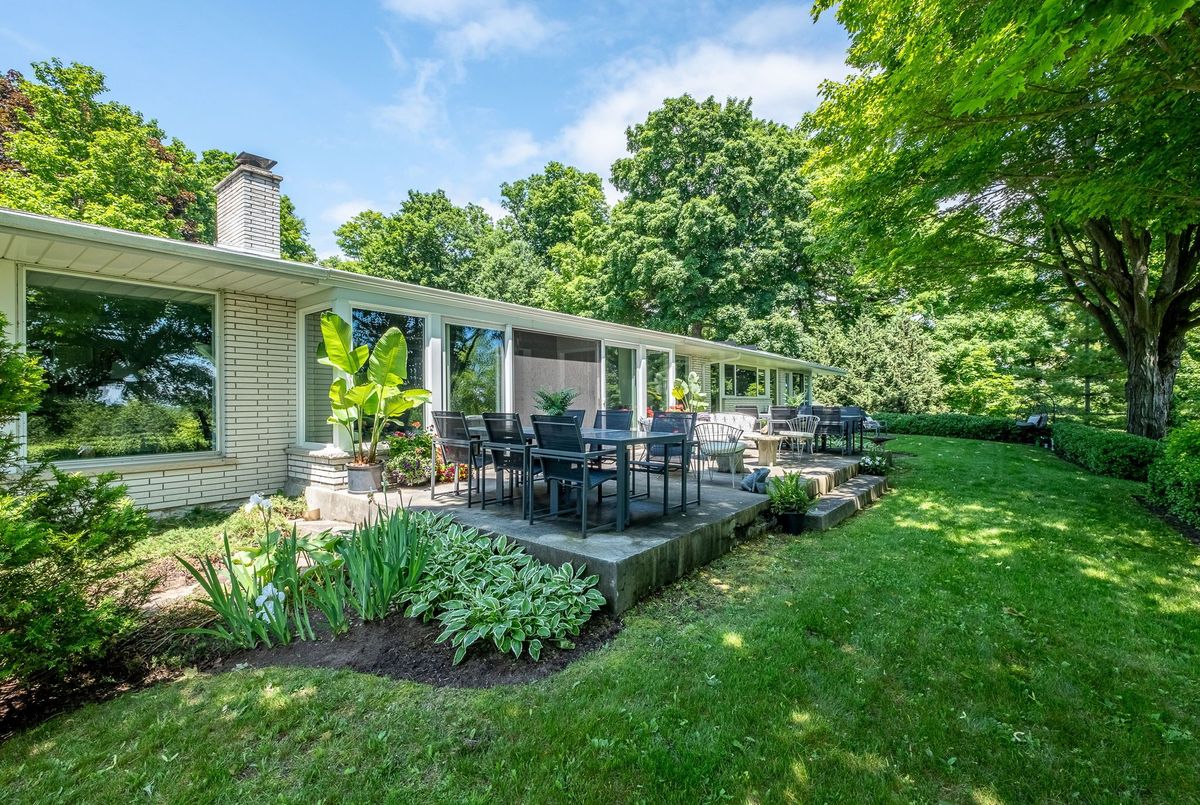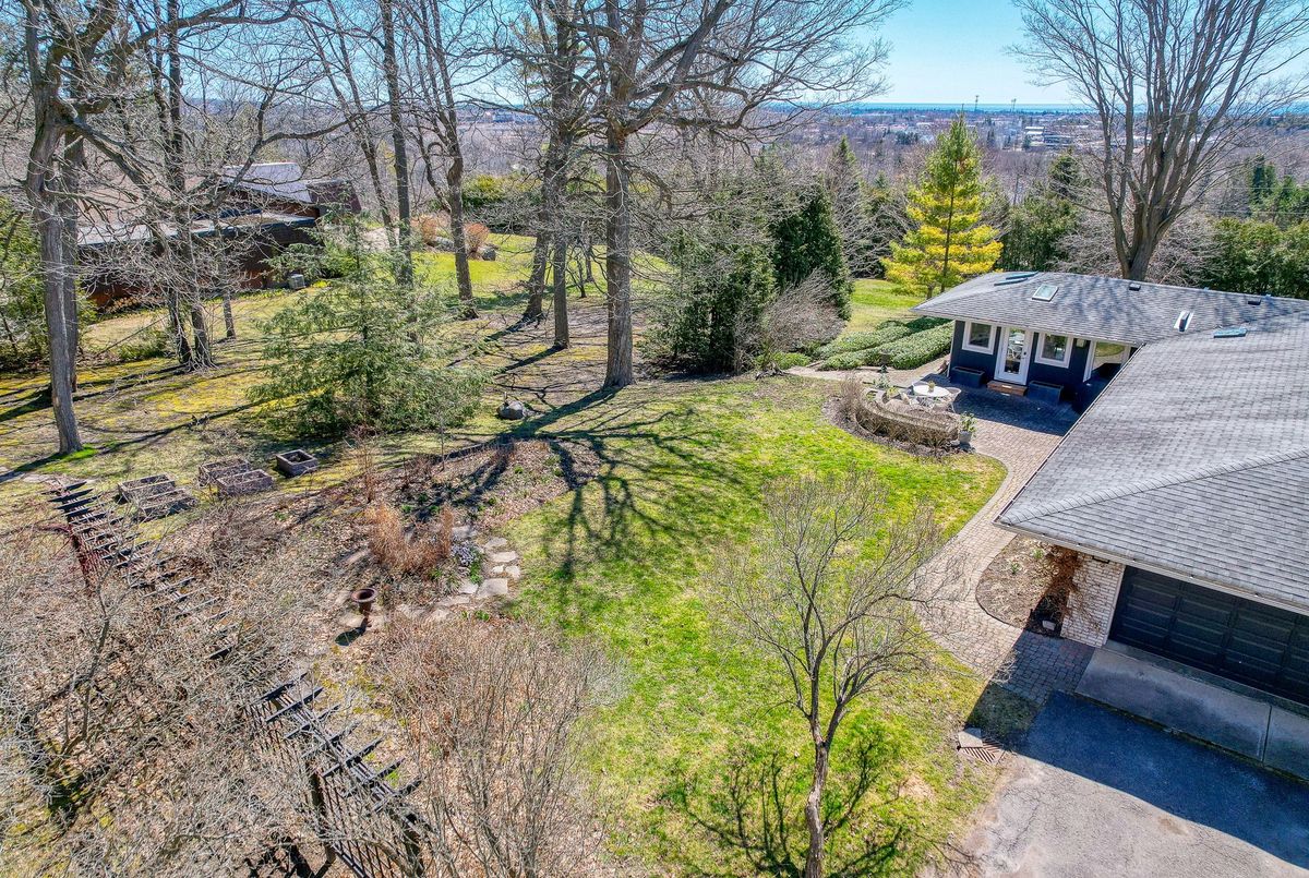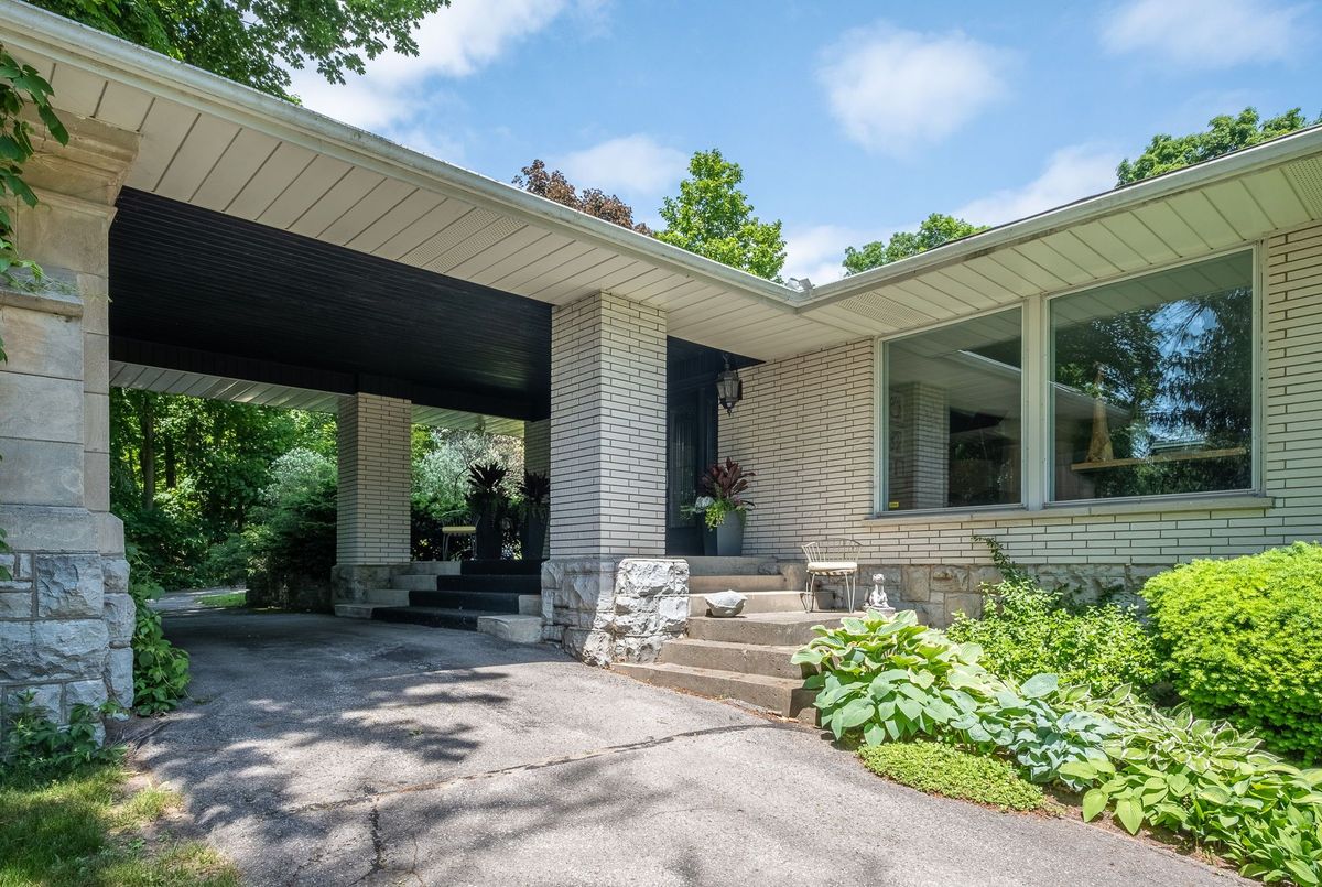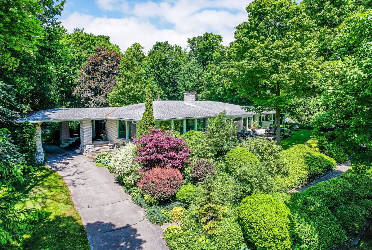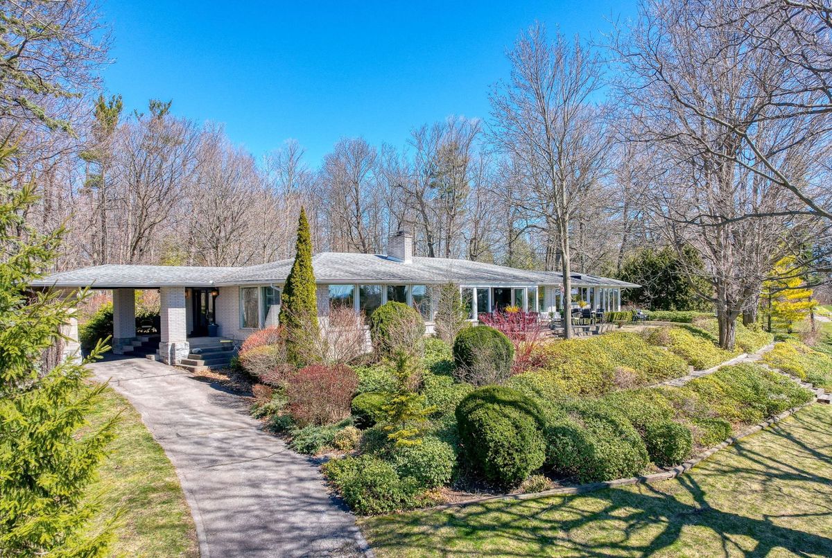 A Rare Mid-Century Retreat Tucked away on a tranquil 2-acre lot surrounded by towering mature trees, this classic mid-century bungalow offers a unique blend of timeless architecture and natural beauty. Every window provides a picturesque view of lush greenery, rolling terrain, and glimpses of the lake through the trees. The meticulously maintained gardens resemble a living arboretum, featuring rare native trees and perennial plantings that provide privacy and year-round low-maintenance charm.Originally built in 1969 on the historic Dungannon Estate, the home retains a piece of history with the original 1903 stone pillars gracing the porte-cochère at the end of a winding drive. Inside, an open-concept design bathed in natural light welcomes you, with floor-to-ceiling windows, hardwood floors, and a striking two-sided fireplace anchoring the main living area.The kitchen has been thoughtfully updated, blending modern functionality with sleek mid-century aesthetics. Warm wood accents clean architectural lines flow throughout, seamlessly connecting indoor and outdoor living. Multiple walkouts lead to expansive patios perfect for morning coffee or evening entertaining set against a backdrop of rolling hills and distant lake views.Since 2018, the home has undergone a custom-designed renovation featuring nearly 4,000 sq. ft. of refined main-floor living space. Highlights include radiant heated floors in the sunroom and primary bathroom, double furnaces, and a whole-home 22kW Generac generator for peace of mind.A private path winds through the trees to a charming guest houseideal as a visitor retreat, home office, or creative studio complete with heat, running water, and an attached double garage. The main residence also includes an oversized attached garage, providing ample storage and utility.Located just minutes from Highway 401, with convenient access to hospitals, shopping,, this property offers the rare combination of privacy, convenience, and architectural integrity. ...