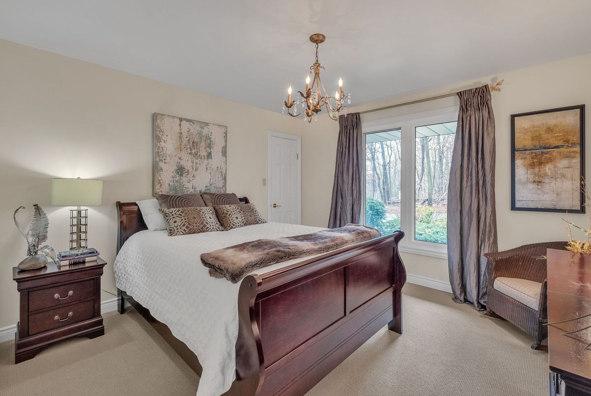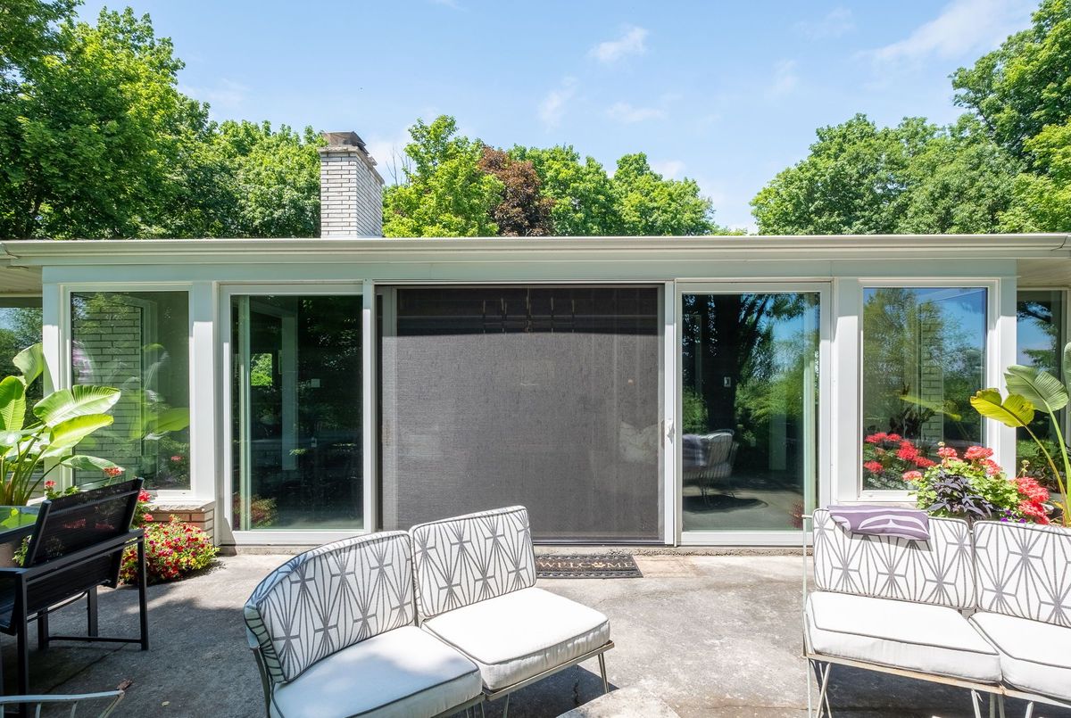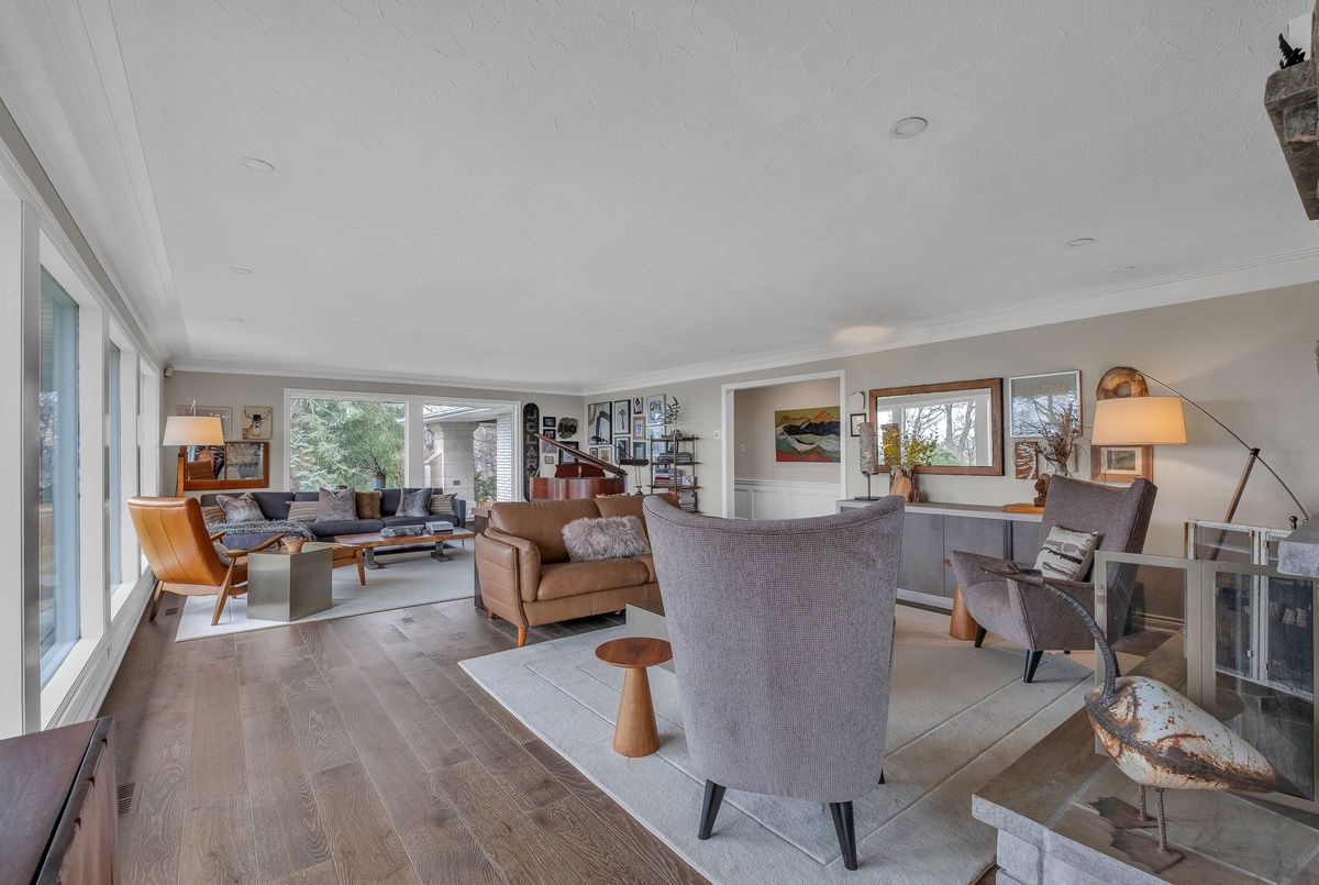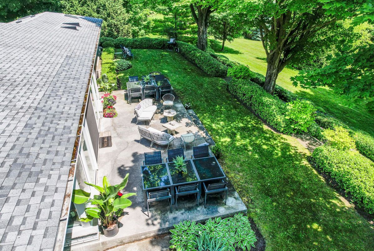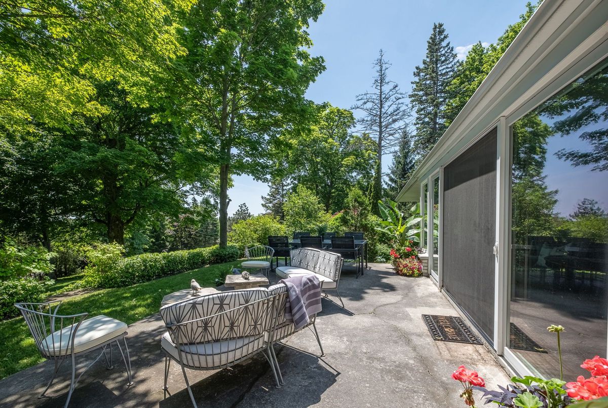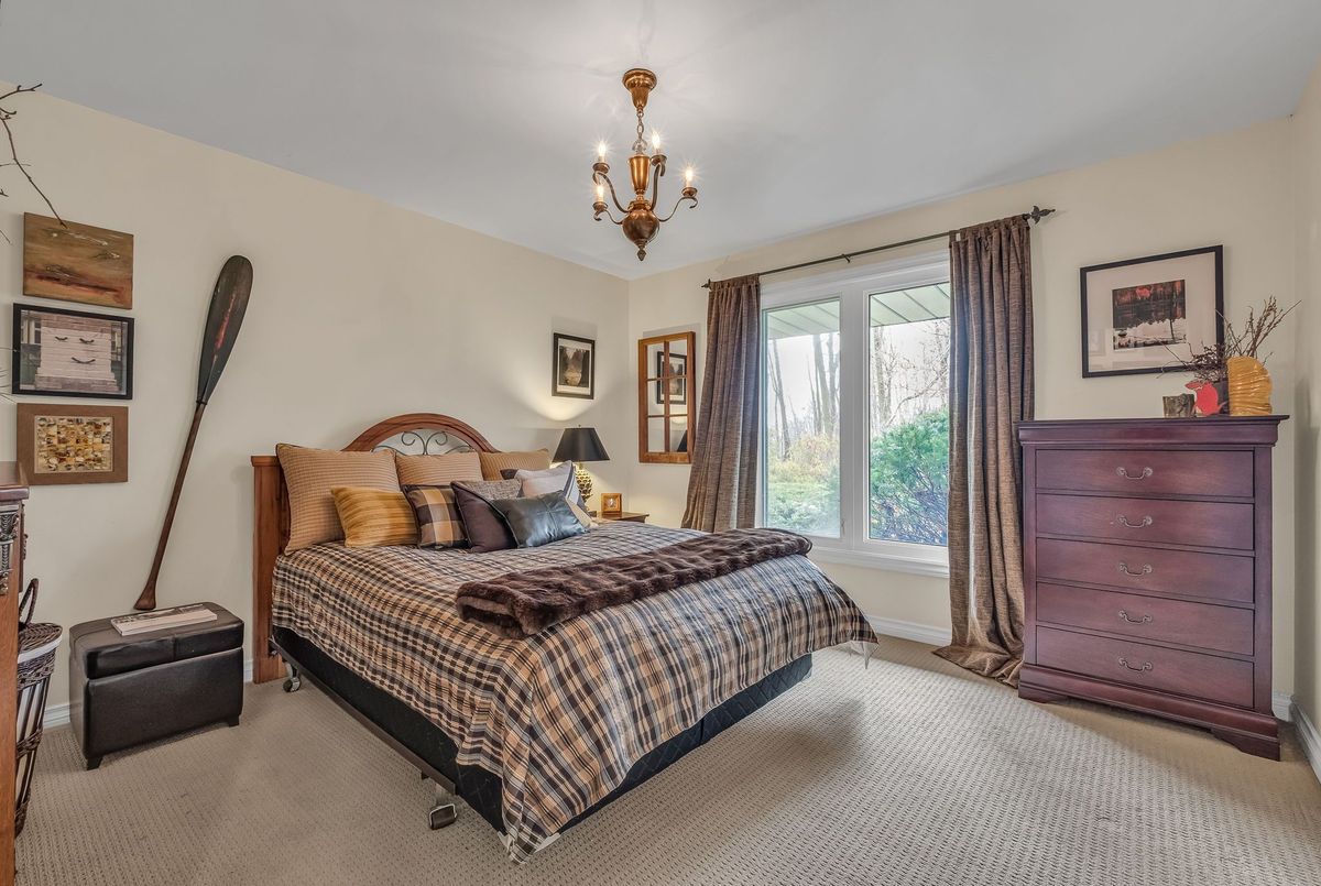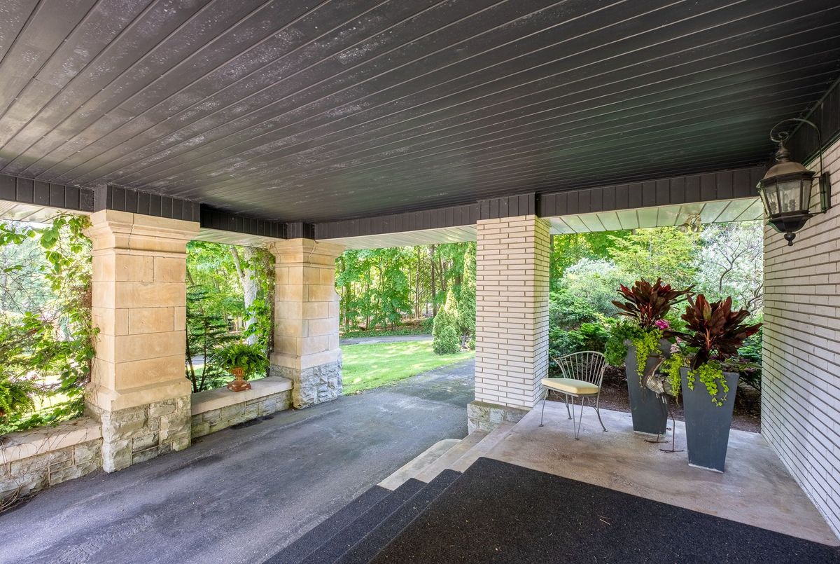 A Rare Mid-Century Retreat Tucked away on a tranquil 2-acre lot surrounded by towering mature trees, this classic mid-century bungalow offers a unique blend of timeless architecture and natural beauty. Every window provides a picturesque view of lush greenery, rolling terrain, and glimpses of the lake through the trees. The meticulously maintained gardens resemble a living arboretum, featuring rare native trees and perennial plantings that provide privacy and year-round low-maintenance charm.Originally built in 1969 on the historic Dungannon Estate, the home retains a piece of history with the original 1903 stone pillars gracing the porte-cochère at the end of a winding drive. Inside, an open-concept design bathed in natural light welcomes you, with floor-to-ceiling windows, hardwood floors, and a striking two-sided fireplace anchoring the main living area.The kitchen has been thoughtfully updated, blending modern functionality with sleek mid-century aesthetics. Warm wood accents clean architectural lines flow throughout, seamlessly connecting indoor and outdoor living. Multiple walkouts lead to expansive patios perfect for morning coffee or evening entertaining set against a backdrop of rolling hills and distant lake views.Since 2018, the home has undergone a custom-designed renovation featuring nearly 4,000 sq. ft. of refined main-floor living space. Highlights include radiant heated floors in the sunroom and primary bathroom, double furnaces, and a whole-home 22kW Generac generator for peace of mind.A private path winds through the trees to a charming guest houseideal as a visitor retreat, home office, or creative studio complete with heat, running water, and an attached double garage. The main residence also includes an oversized attached garage, providing ample storage and utility.Located just minutes from Highway 401, with convenient access to hospitals, shopping,, this property offers the rare combination of privacy, convenience, and architectural integrity. ...
