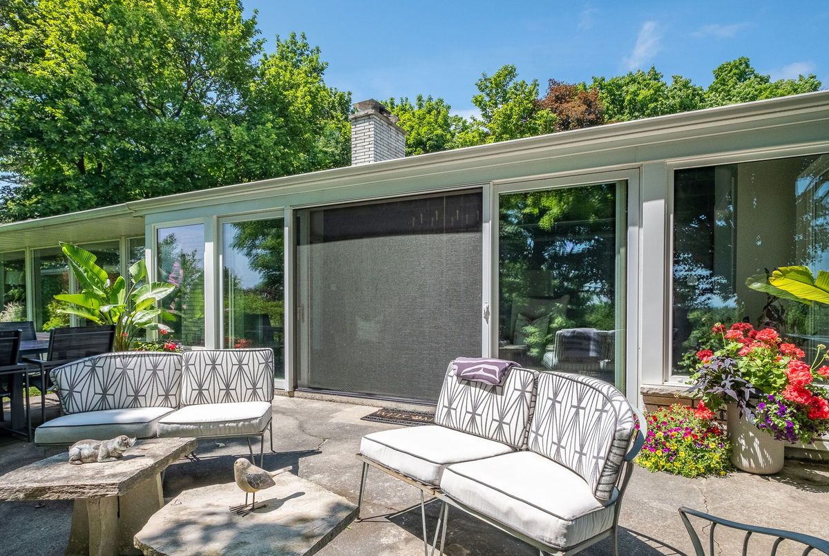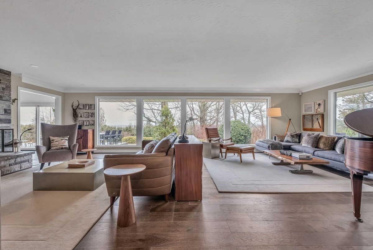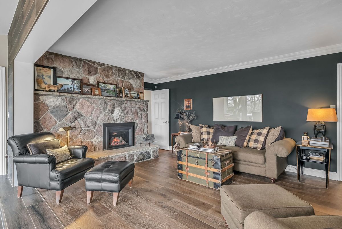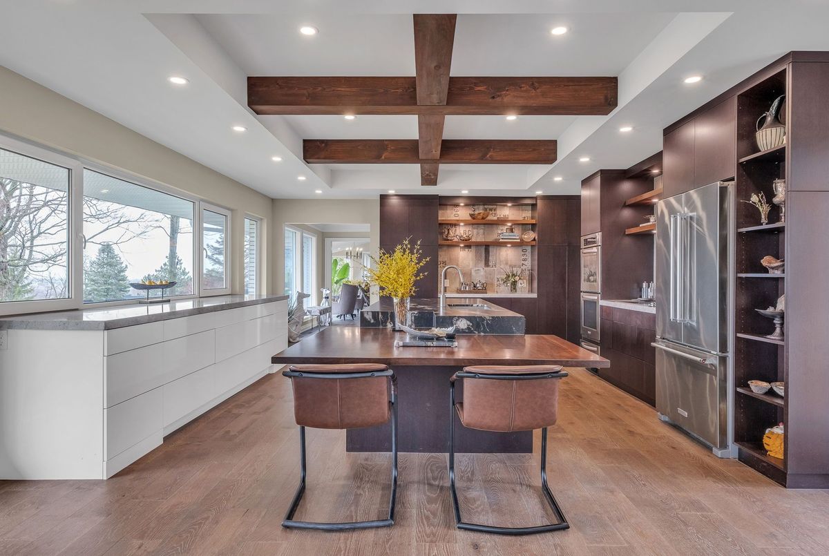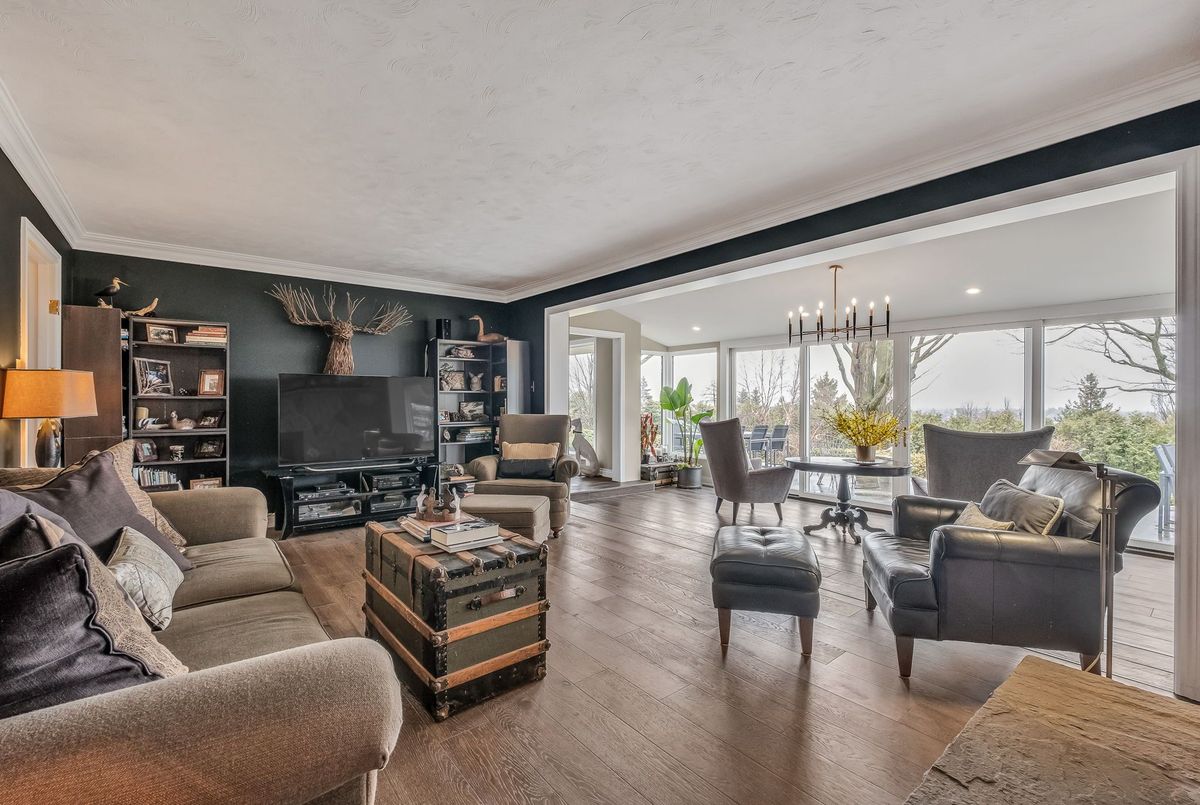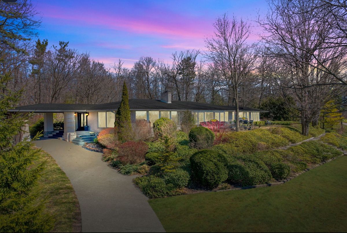 A Rare Mid-Century Retreat Tucked away on a tranquil 2-acre lot surrounded by towering mature trees, this classic mid-century bungalow offers a unique blend of timeless architecture and natural beauty. Every window provides a picturesque view of lush greenery, rolling terrain, and glimpses of the lake through the trees. The meticulously maintained gardens resemble a living arboretum, featuring rare native trees and perennial plantings that provide privacy and year-round low-maintenance charm.Originally built in 1969 on the historic Dungannon Estate, the home retains a piece of history with the original 1903 stone pillars gracing the porte-cochère at the end of a winding drive. Inside, an open-concept design bathed in natural light welcomes you, with floor-to-ceiling windows, hardwood floors, and a striking two-sided fireplace anchoring the main living area.The kitchen has been thoughtfully updated, blending modern functionality with sleek mid-century aesthetics. Warm wood accents clean architectural lines flow throughout, seamlessly connecting indoor and outdoor living. Multiple walkouts lead to expansive patios perfect for morning coffee or evening entertaining set against a backdrop of rolling hills and distant lake views.Since 2018, the home has undergone a custom-designed renovation featuring nearly 4,000 sq. ft. of refined main-floor living space. Highlights include radiant heated floors in the sunroom and primary bathroom, double furnaces, and a whole-home 22kW Generac generator for peace of mind.A private path winds through the trees to a charming guest houseideal as a visitor retreat, home office, or creative studio complete with heat, running water, and an attached double garage. The main residence also includes an oversized attached garage, providing ample storage and utility.Located just minutes from Highway 401, with convenient access to hospitals, shopping,, this property offers the rare combination of privacy, convenience, and architectural integrity. ...