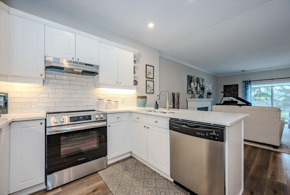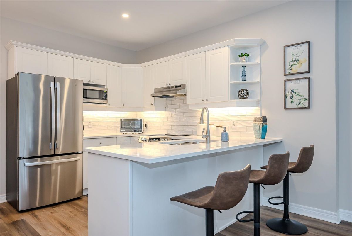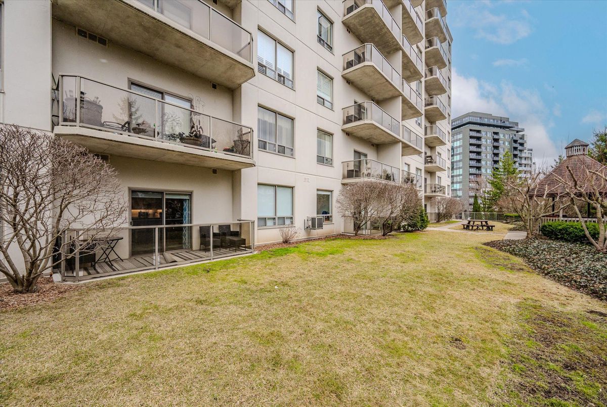 Experience the best of downtown convenience with a touch of nature in this exceptional 1200 sqft 2 Bedroom, 2 Bathroom Ground-Level Garden Suite. Located in a highly respected, well-managed building, this condo offers a rare blend of privacy, comfort, and effortless livingperfect for down sizers or professionals seeking a peaceful retreat with urban amenities at their doorstep. Step inside to discover a bright, open-concept layout, with luxury vinyl tile flooring throughout. The space has been tastefully updated and is well appointed with classic neutral finishes.The 2023 updated kitchen boasts Quartz Countertops, a stylish Backsplash, and Modern Appliances, making meal preparation a pleasure. The spacious living area extends seamlessly to an open Balcony overlooking beautifully Landscaped Gardens, creating the feel of a private backyard without the upkeep. Designed for ease and convenience, this suite Includes HEAT and WATER in the condo fees-along with secure Underground Parking. Amenities include an Exercise room, Community room and a Guest Suite can be booked for overnight company.Stroll through the garden or stop by the pergola to relax or use the community BBQ. The building is ideally situated within walking distance of the GO Train, public transit, shops, and dining, making it easy to stay connected while enjoying a low-maintenance lifestyle. Dont miss this rare opportunity to own a serene yet centrally located garden suite home. Book your private viewing today!