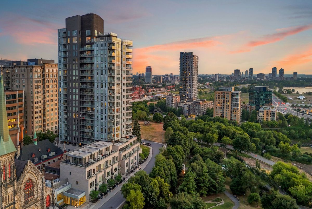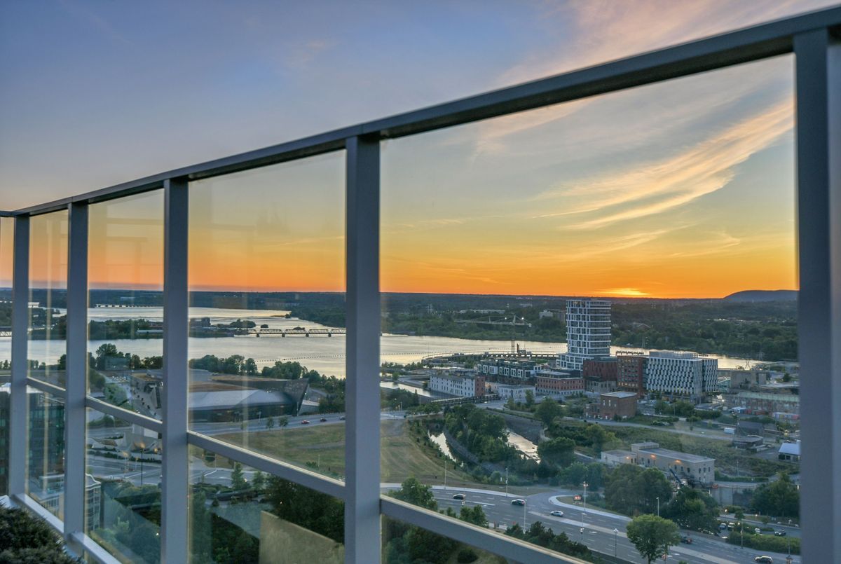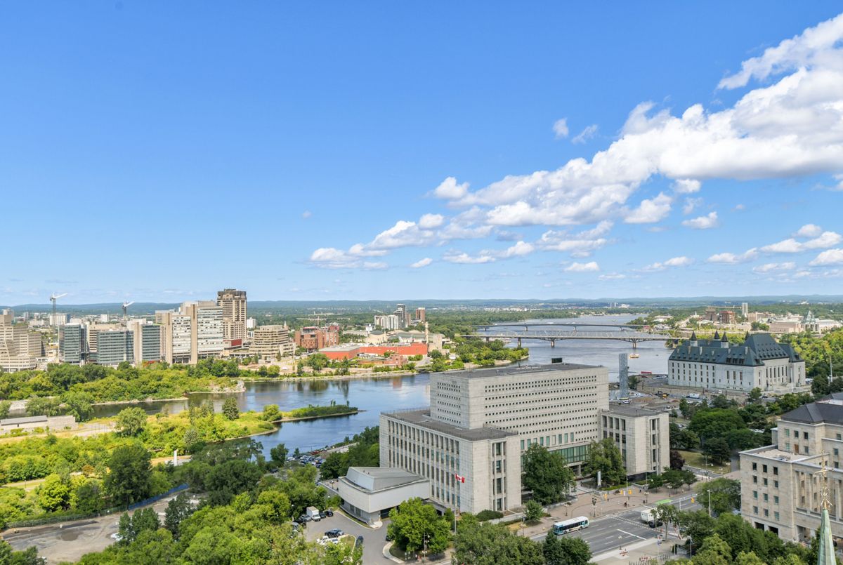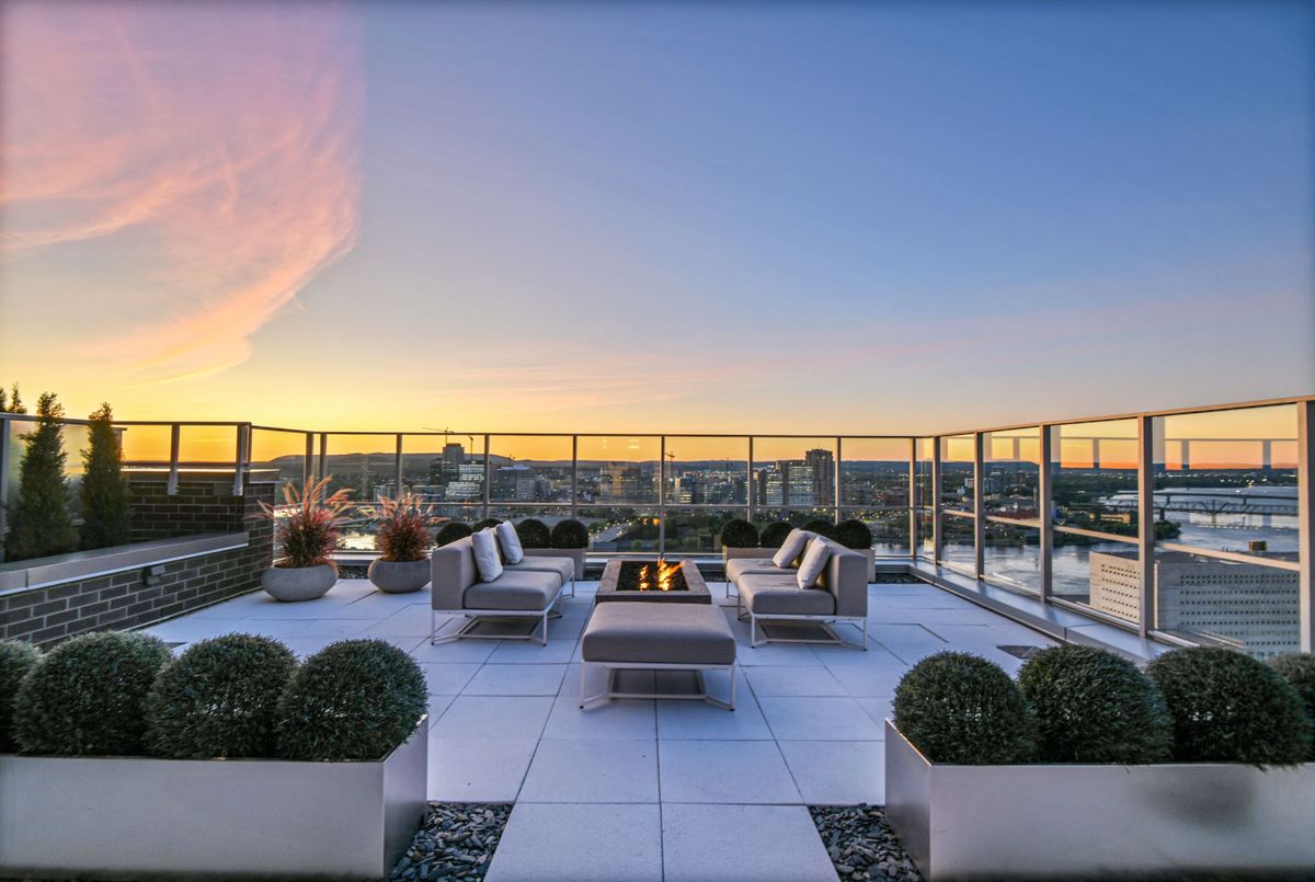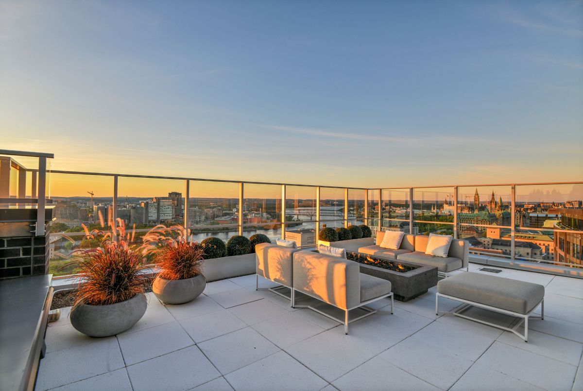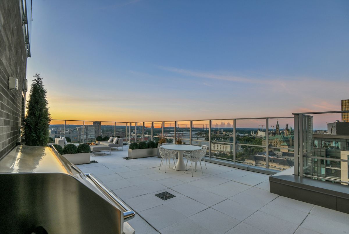 Perched high above the city with extensive private outdoor space, this one-of-a-kind condo with a phenomenal sky terrace offers panoramic views of the Ottawa River, Parliament Hill, the Supreme Court, and the Gatineau Hills. From golden sunsets to views of iconic Canadian architecture, the backdrop here is nothing short of extraordinary. The expansive terrace is designed for true outdoor living, complete with a built-in barbecue and separate dining and lounging areas. Thoughtful landscaping creates privacy, while framing sweeping vistas. Inside, the residence is equally remarkable. Sophisticated herringbone white oak wood floors, soaring 8-foot-high door frames, and custom walnut doors set an unmistakable tone of sophistication. The open living room flows seamlessly into the dining space and a jaw-dropping kitchen anchored by a 13-foot long centre island with marble counters and backsplash. High-end appliances including a full 24-inch refrigerator and separate freezer, induction cooktop and professional hood fan make this space a dream for both entertaining and everyday living. There is also a stunning feature built-in coffee bar with storage. The private quarters in this condo are just as refined. The primary suite features a wall of custom walnut closets, a second walk-in closet, and its own balcony. The ensuite bathroom is spa-like, with a soaking tub, walk-in glass shower, and double vanity. A second bedroom, with direct ensuite access to a convertible powder/full bathroom. With two parking spaces (both with EV chargers), two storage lockers - including one conveniently located near the unit - and only two residences on the floor, this condo offers both exclusivity and ease. Every detail has been meticulously designed for modern luxury living.