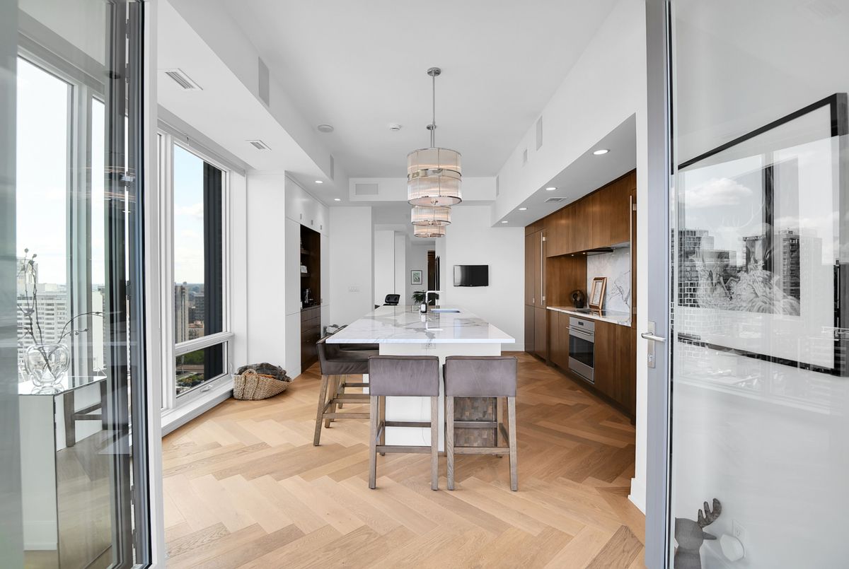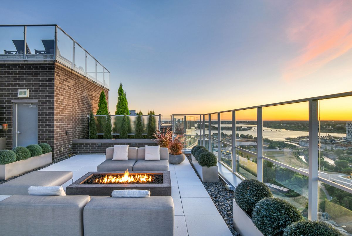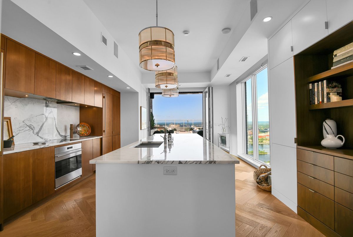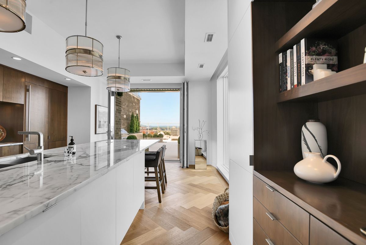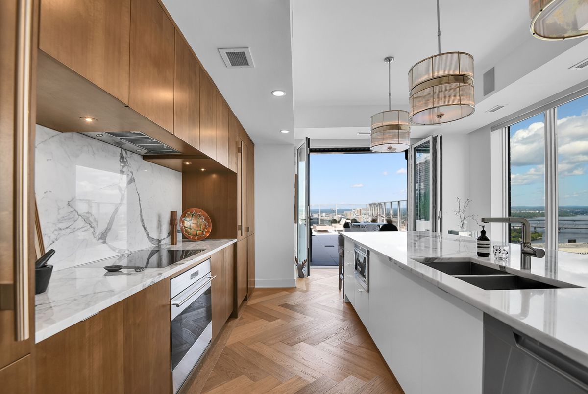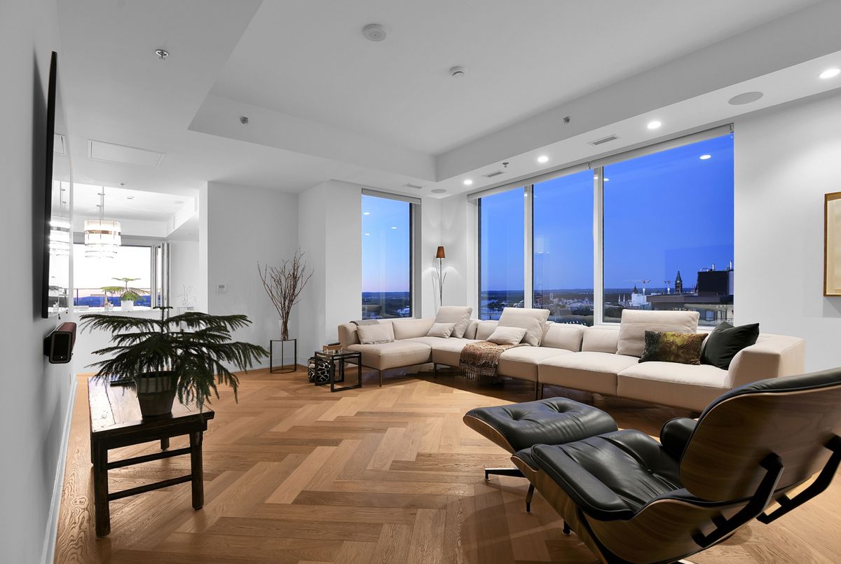 Perched high above the city with extensive private outdoor space, this one-of-a-kind condo with a phenomenal sky terrace offers panoramic views of the Ottawa River, Parliament Hill, the Supreme Court, and the Gatineau Hills. From golden sunsets to views of iconic Canadian architecture, the backdrop here is nothing short of extraordinary. The expansive terrace is designed for true outdoor living, complete with a built-in barbecue and separate dining and lounging areas. Thoughtful landscaping creates privacy, while framing sweeping vistas. Inside, the residence is equally remarkable. Sophisticated herringbone white oak wood floors, soaring 8-foot-high door frames, and custom walnut doors set an unmistakable tone of sophistication. The open living room flows seamlessly into the dining space and a jaw-dropping kitchen anchored by a 13-foot long centre island with marble counters and backsplash. High-end appliances including a full 24-inch refrigerator and separate freezer, induction cooktop and professional hood fan make this space a dream for both entertaining and everyday living. There is also a stunning feature built-in coffee bar with storage. The private quarters in this condo are just as refined. The primary suite features a wall of custom walnut closets, a second walk-in closet, and its own balcony. The ensuite bathroom is spa-like, with a soaking tub, walk-in glass shower, and double vanity. A second bedroom, with direct ensuite access to a convertible powder/full bathroom. With two parking spaces (both with EV chargers), two storage lockers - including one conveniently located near the unit - and only two residences on the floor, this condo offers both exclusivity and ease. Every detail has been meticulously designed for modern luxury living.