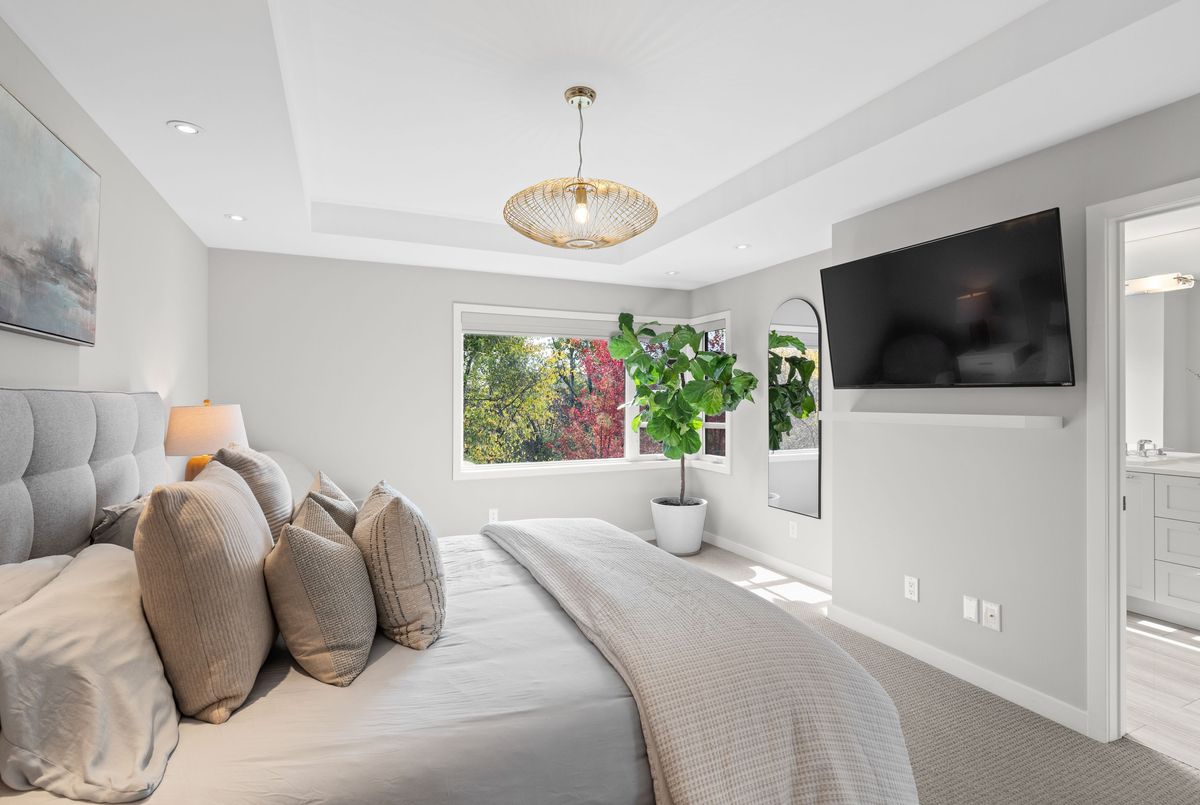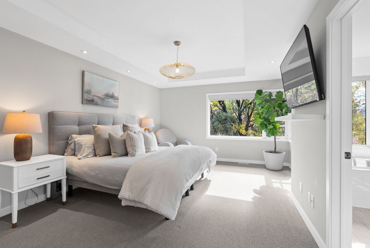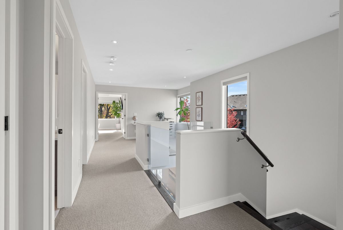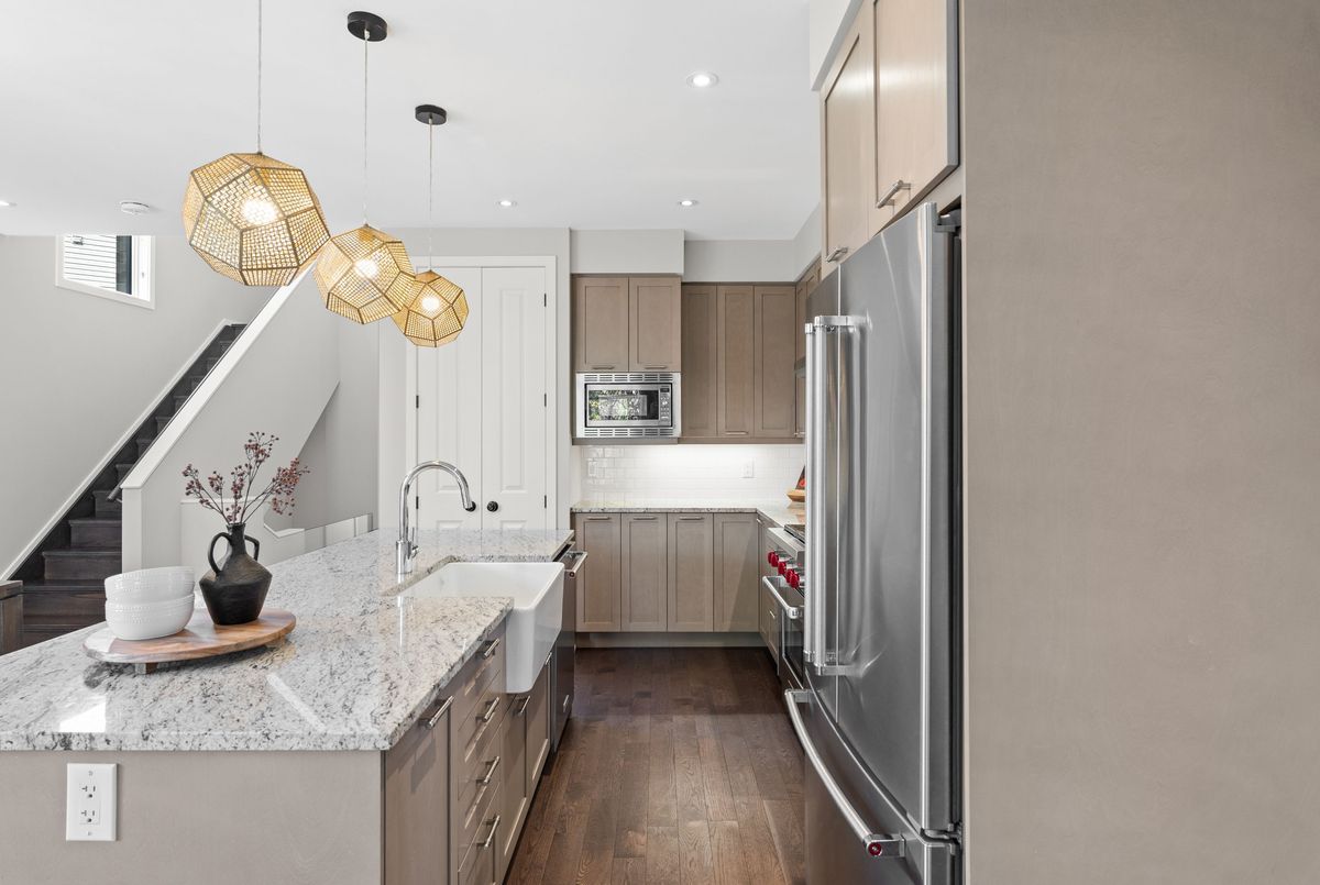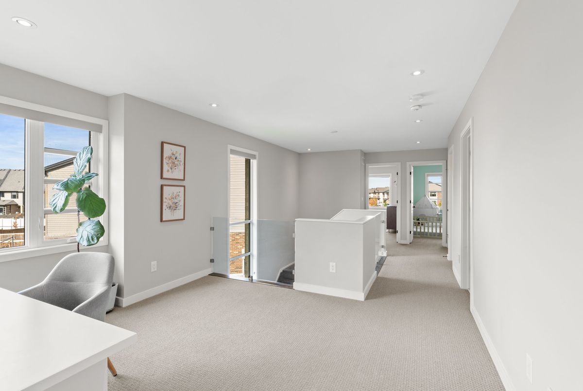 Stunning end unit townhome with one of Riverside South's largest yards, townhomes and singles alike. This showpiece Parkway End Model by HN Homes offers a spacious, smartly designed layout with over 2,500 sq. ft. of finished living space. Situated on a premium pie-shaped corner lot (valued at over 50K), the home features a fully fenced, landscaped backyard, oversized composite deck, 6-zone irrigation system, shed, and gas BBQ hookup, all backing onto mature trees with no direct rear neighbours. Welcomed by an extended wrap-around porch, step inside to the spacious tiled foyer with garage entry and a sleek powder room. The open-concept main floor impresses with 9' smooth ceilings, floor-to-ceiling windows, wire brushed oak hardwood flooring, modern glass railings, and a cozy gas fireplace. A thoughtfully designed main floor den is ideal for a home office, study nook, or play area. The chef-inspired kitchen boasts high-end stainless steel appliances including a 30" Wolf Range, granite counters, ceiling-height soft-close cabinetry, large pantry, and an 8' island seating four. The dining area fits a table for 10 and provides direct access to the backyard. Upstairs features upgraded Berber carpet with premium underpad, a second den/flex space, laundry room with built-ins, and 3 generously sized bedrooms with custom window treatments. The primary suite includes a walk-in closet with organizers and a spa-like ensuite with soaker tub, upgraded glass shower, and extended vanity. The finished basement adds excellent flexibility with in-law suite potential, rec room, ready to finish 4th bedroom, full 4-pc bath, and ample storage. Notable features: Smart thermostat & lighting, custom blinds, upgraded flooring, smooth ceilings, A/C, gas fireplace, and extended driveway for 3-car parking. Every inch of this residence has been upgraded with luxurious finishes and bespoke details, creating a refined living experience beyond compare, this is not your average townhome!