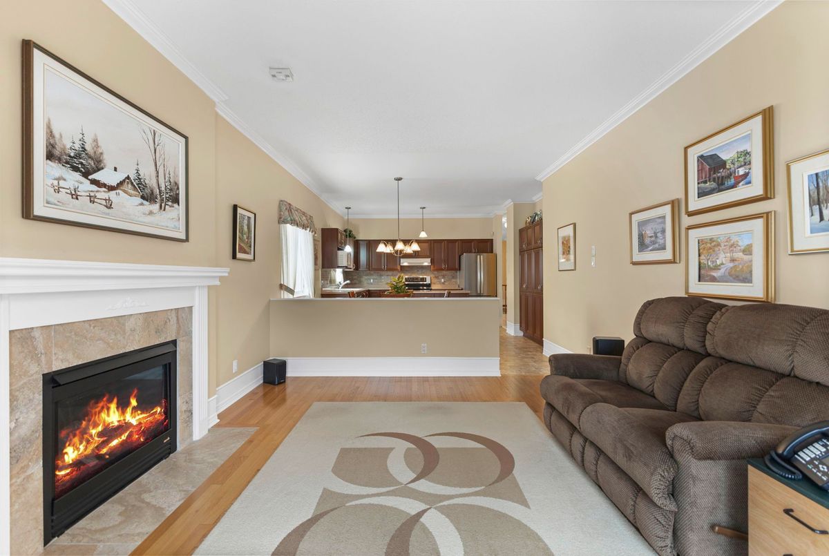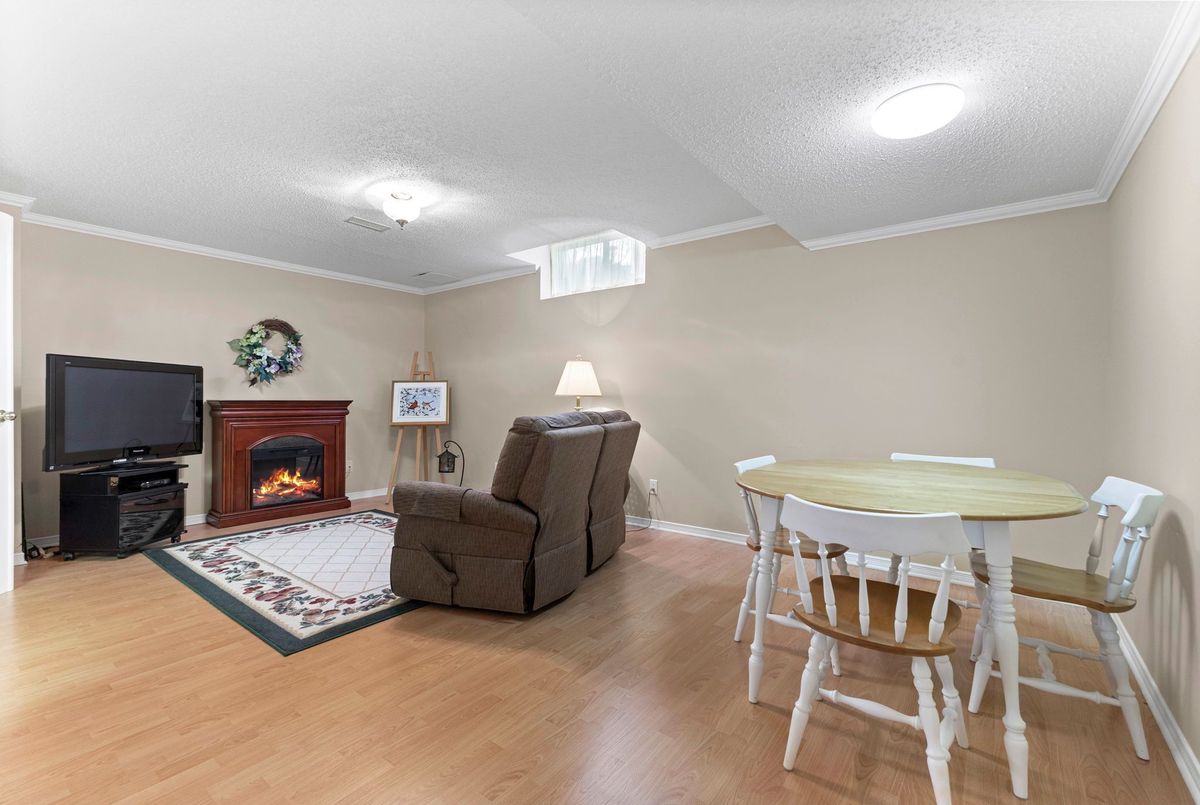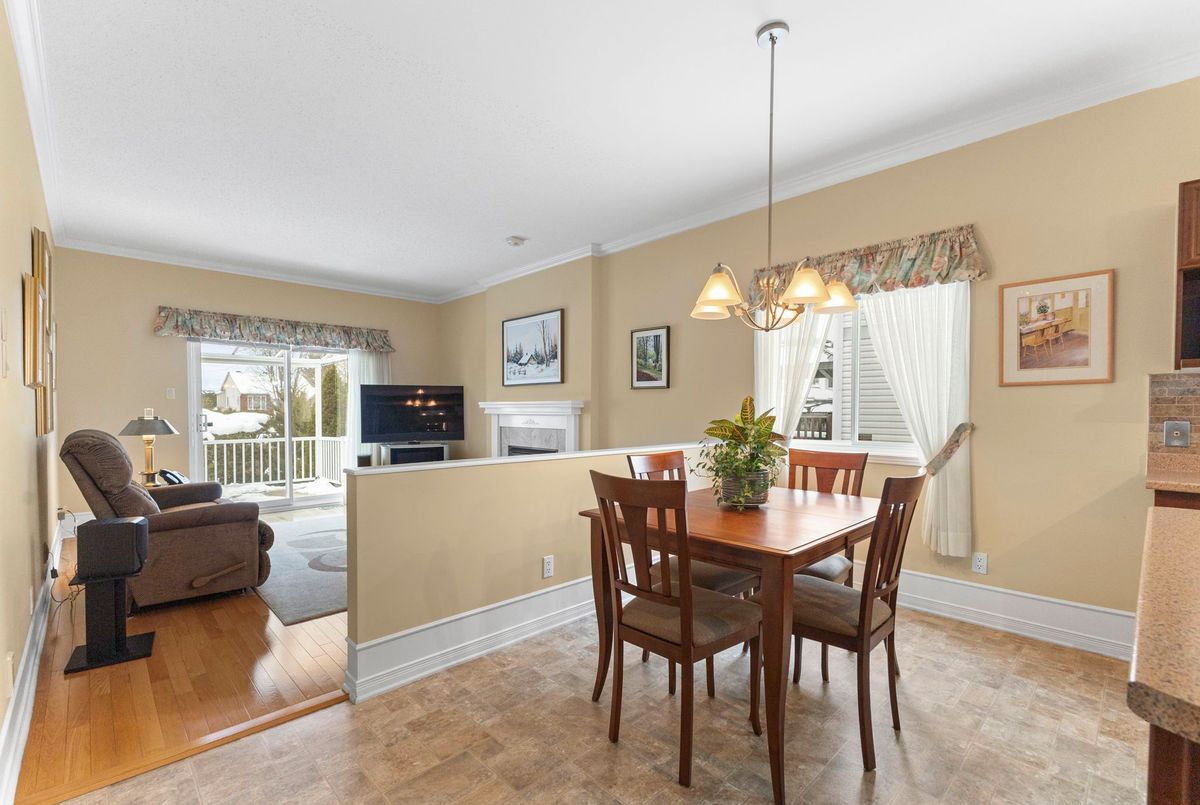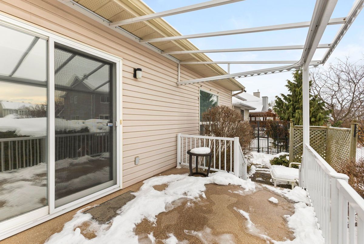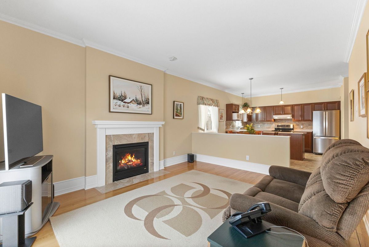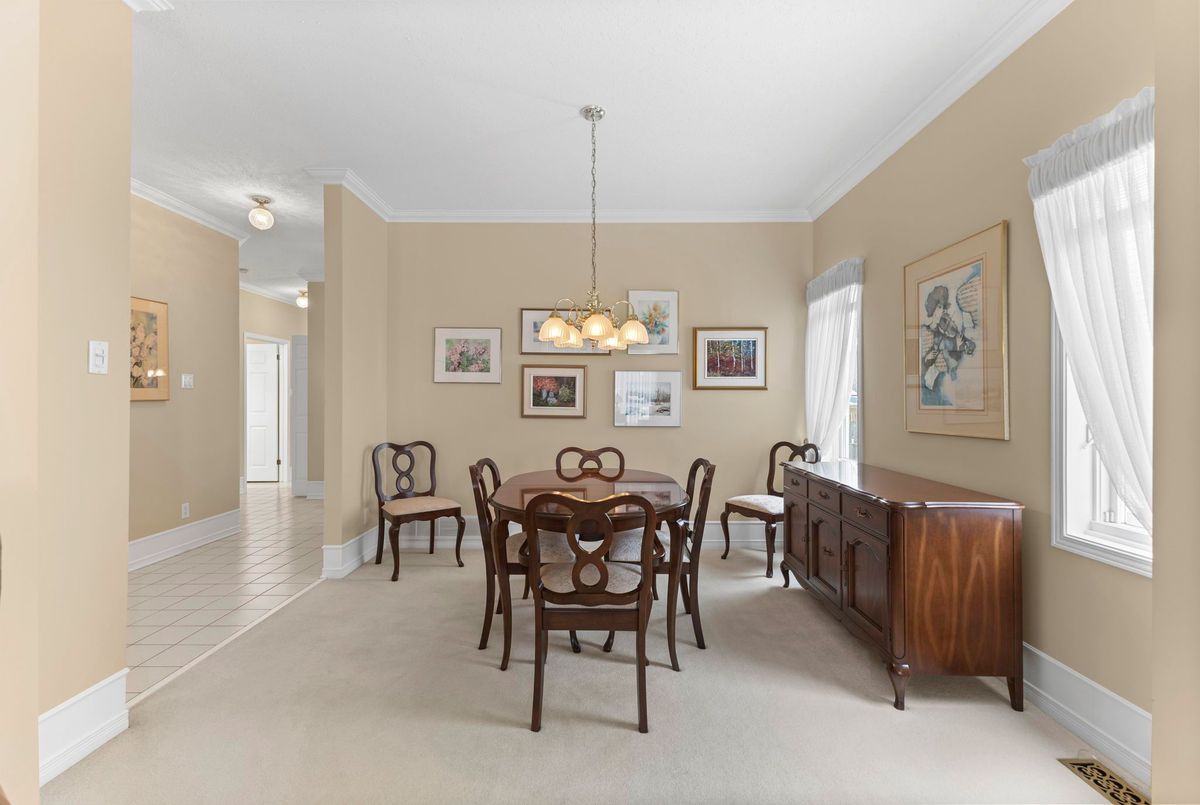Tucked away on a quiet crescent in the highly sought-after community of Chapel Hill, this very lightly lived-in bungalow offers a rare combination of comfort, privacy, and turnkey living. The crescent itself is surrounded by mature wooded space, creating a peaceful setting with minimal through traffic and a strong sense of privacy throughout the street. Proudly owned and meticulously maintained by the original owners, the home is exceptionally clean and move-in ready. The main floor features 9-foot ceilings throughout, abundant natural light, and large windows that create a bright, welcoming atmosphere. The kitchen is both functional and well appointed with quality cabinetry, an extended pantry, and a convenient eat-in area. The family room showcases hardwood flooring, a cozy gas fireplace, and large patio doors that lead to a fiberglass deck, perfect for enjoying the outdoors. A well-placed, well-lit dining room and a sun-filled living room with a large window offer comfortable spaces for entertaining or relaxing, while the inviting foyer includes a built-in closet. Two bedrooms and two full bathrooms complete the main level, along with access to an oversized single-car garage. The lower level is impressively bright thanks to larger windows and offers three versatile flex spaces, including a rec room, TV room, and an additional recreation area, along with a furnace room providing extra storage and a separate full bathroom.A thoughtfully designed and beautifully maintained bungalow in an exceptional Chapel Hill location.