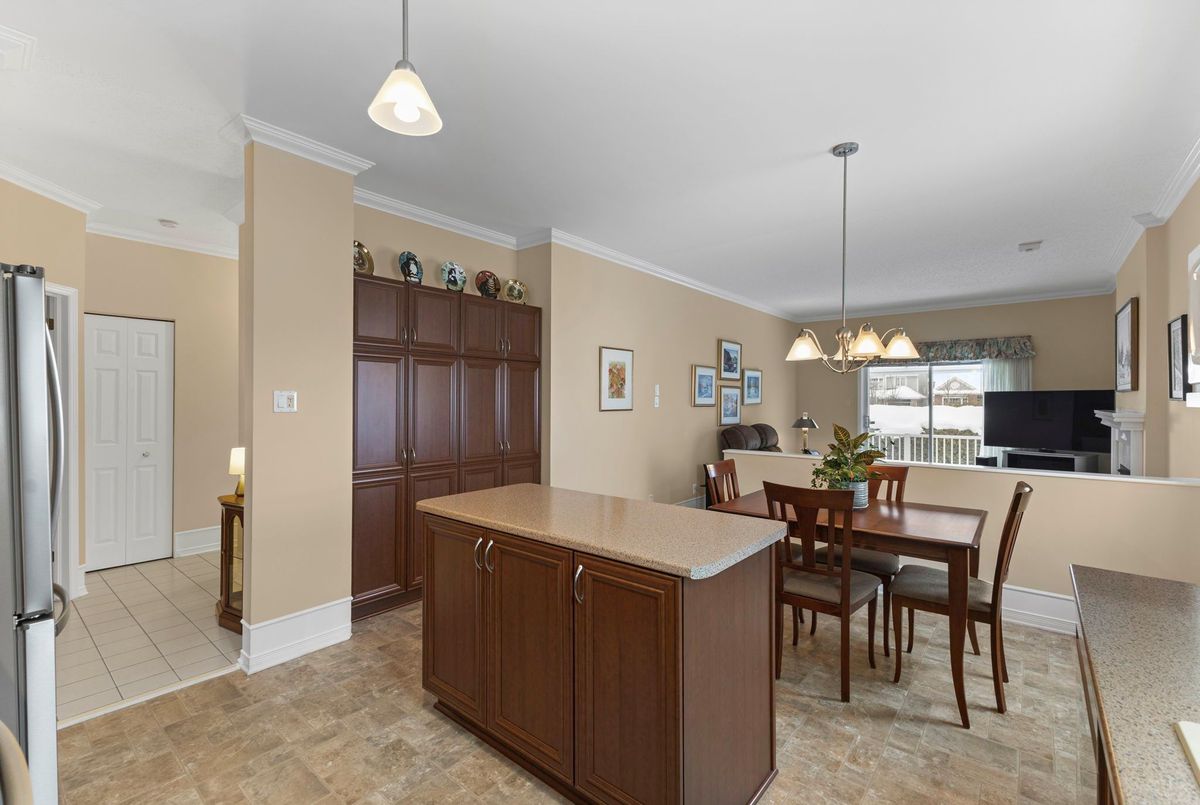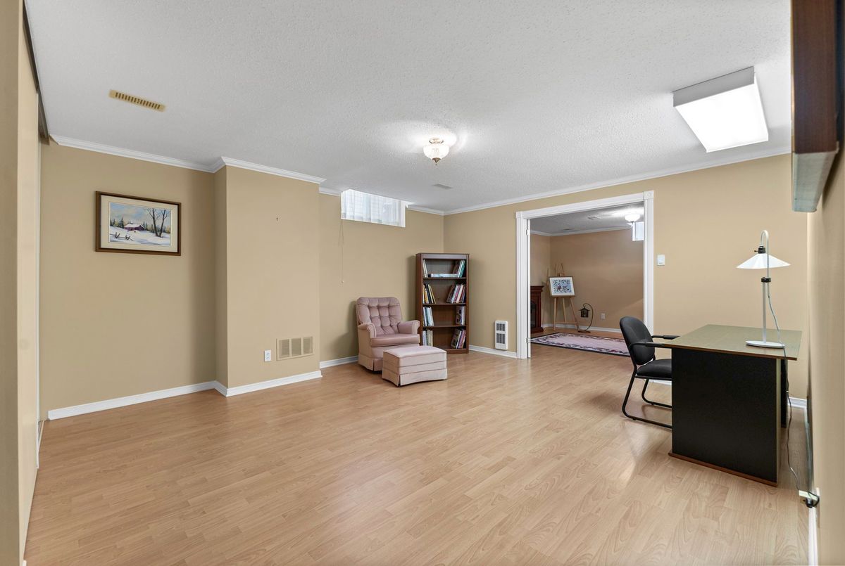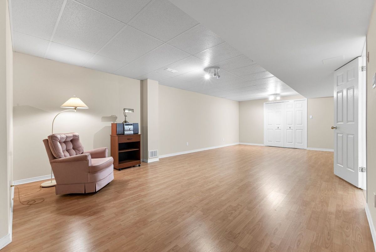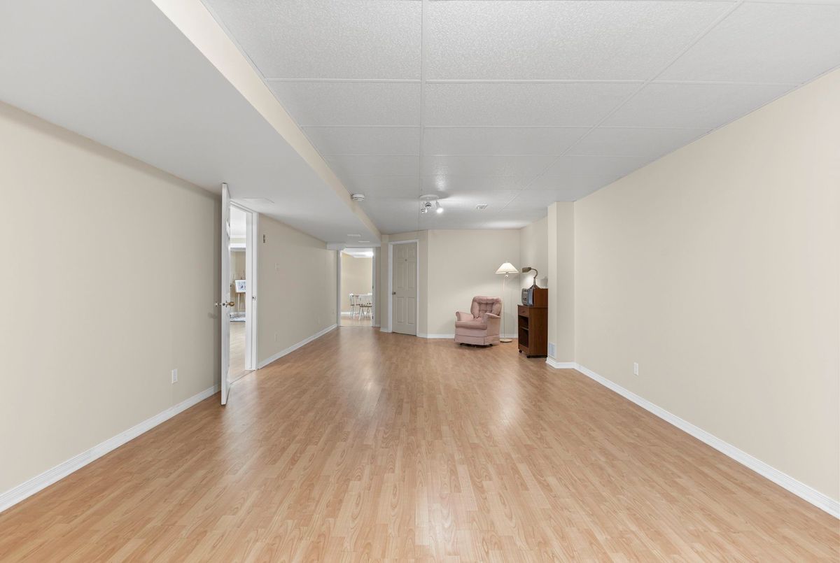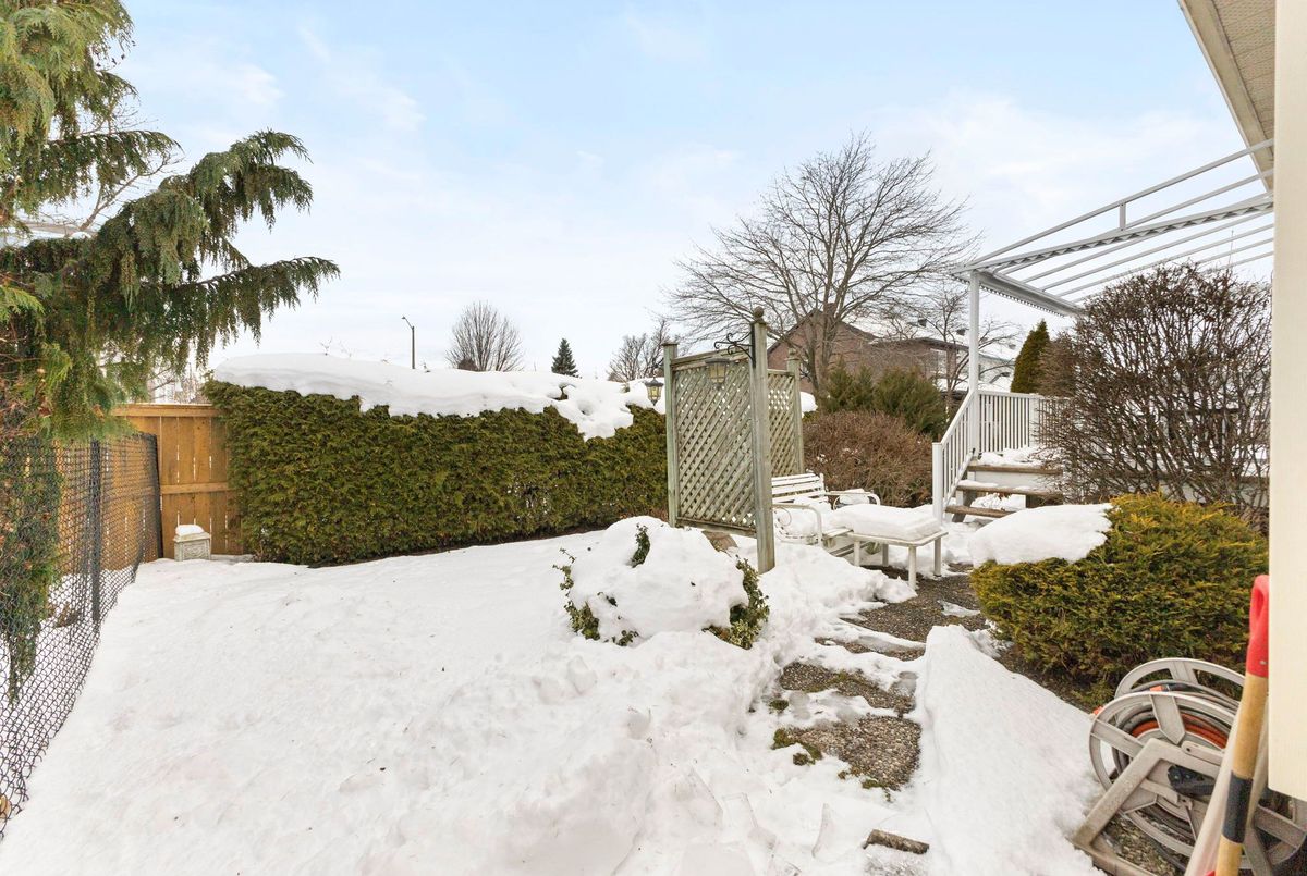 Tucked away on a quiet crescent in the highly sought-after community of Chapel Hill, this very lightly lived-in bungalow offers a rare combination of comfort, privacy, and turnkey living. The crescent itself is surrounded by mature wooded space, creating a peaceful setting with minimal through traffic and a strong sense of privacy throughout the street. Proudly owned and meticulously maintained by the original owners, the home is exceptionally clean and move-in ready. The main floor features 9-foot ceilings throughout, abundant natural light, and large windows that create a bright, welcoming atmosphere. The kitchen is both functional and well appointed with quality cabinetry, an extended pantry, and a convenient eat-in area. The family room showcases hardwood flooring, a cozy gas fireplace, and large patio doors that lead to a fiberglass deck, perfect for enjoying the outdoors. A well-placed, well-lit dining room and a sun-filled living room with a large window offer comfortable spaces for entertaining or relaxing, while the inviting foyer includes a built-in closet. Two bedrooms and two full bathrooms complete the main level, along with access to an oversized single-car garage. The lower level is impressively bright thanks to larger windows and offers three versatile flex spaces, including a rec room, TV room, and an additional recreation area, along with a furnace room providing extra storage and a separate full bathroom.A thoughtfully designed and beautifully maintained bungalow in an exceptional Chapel Hill location.