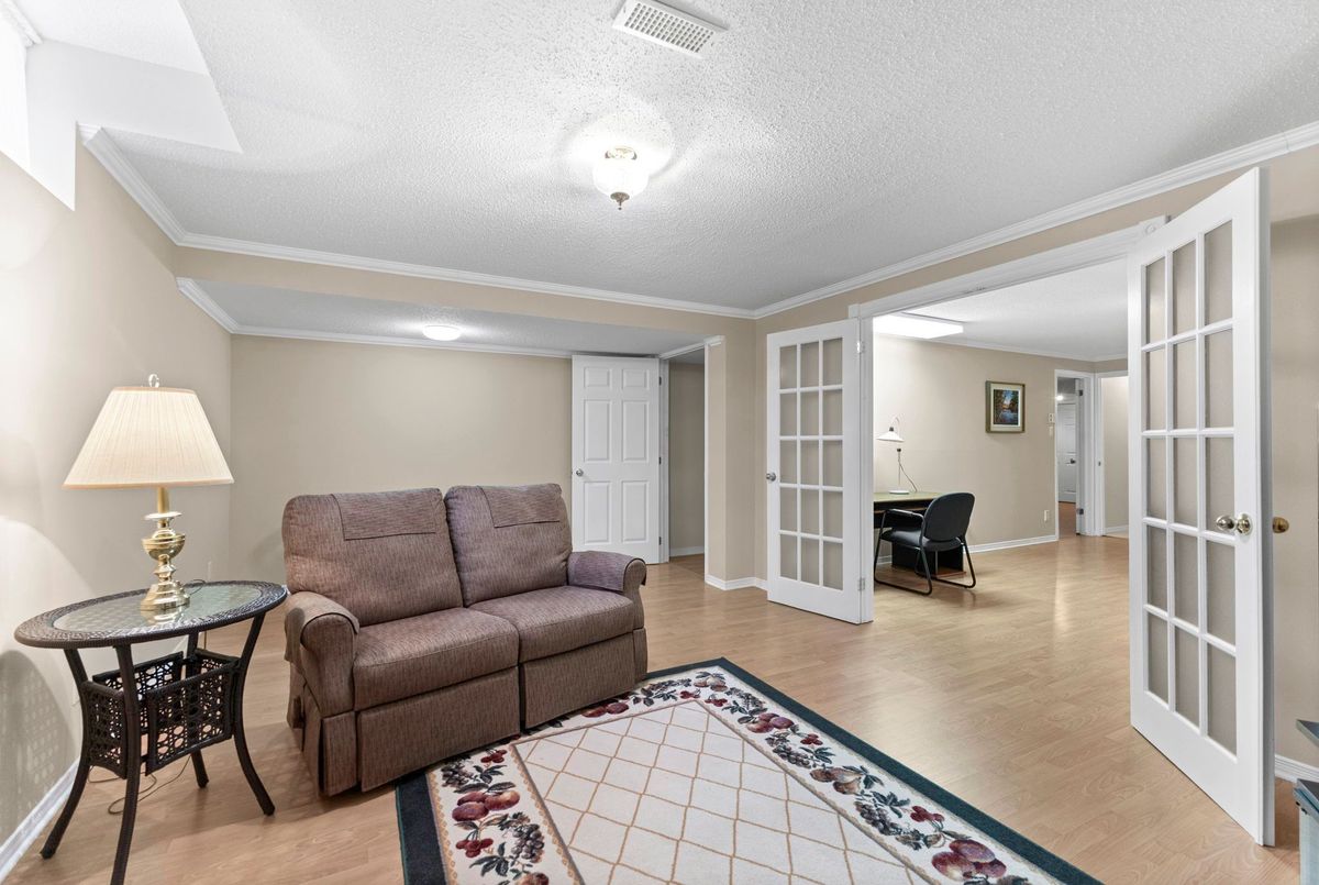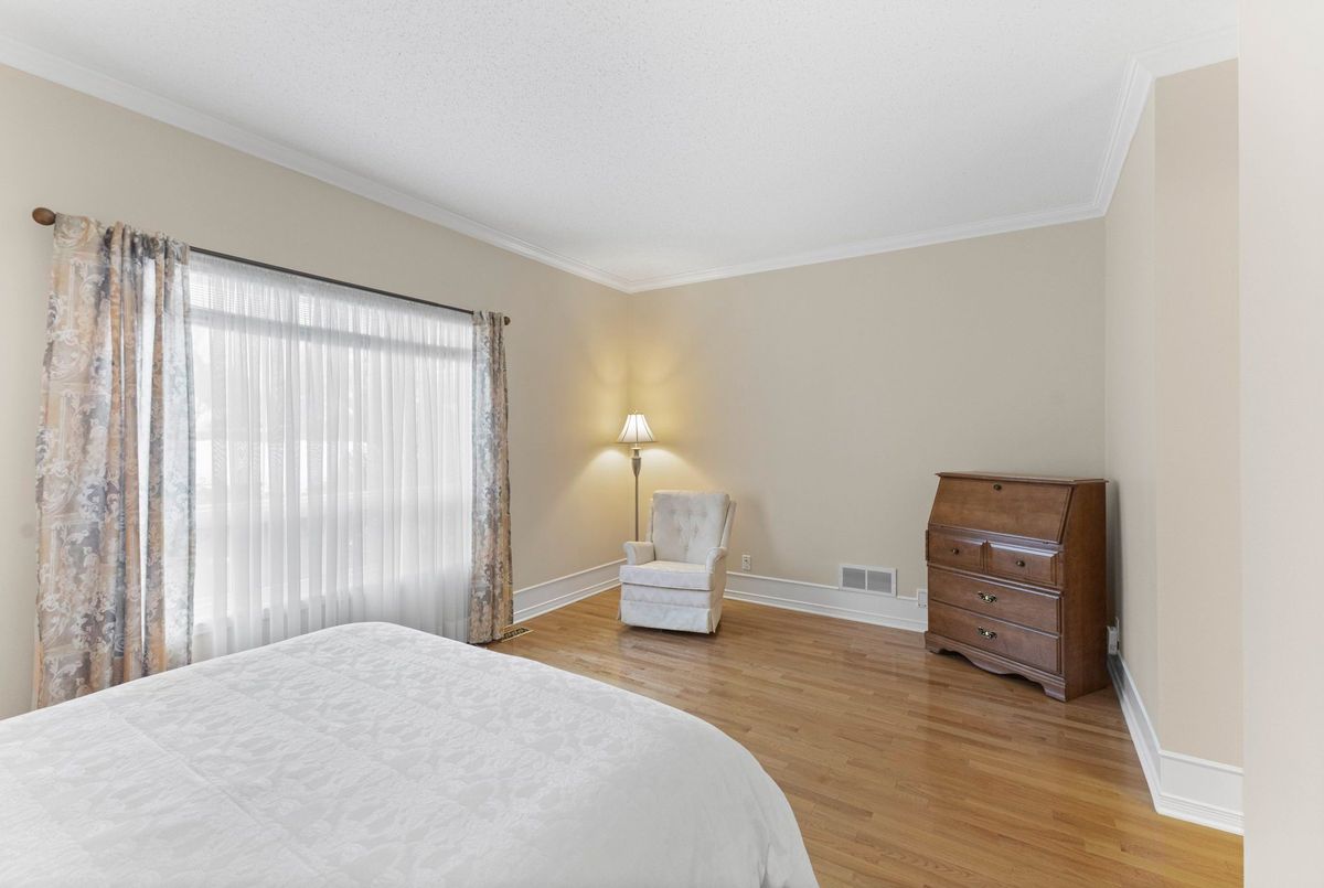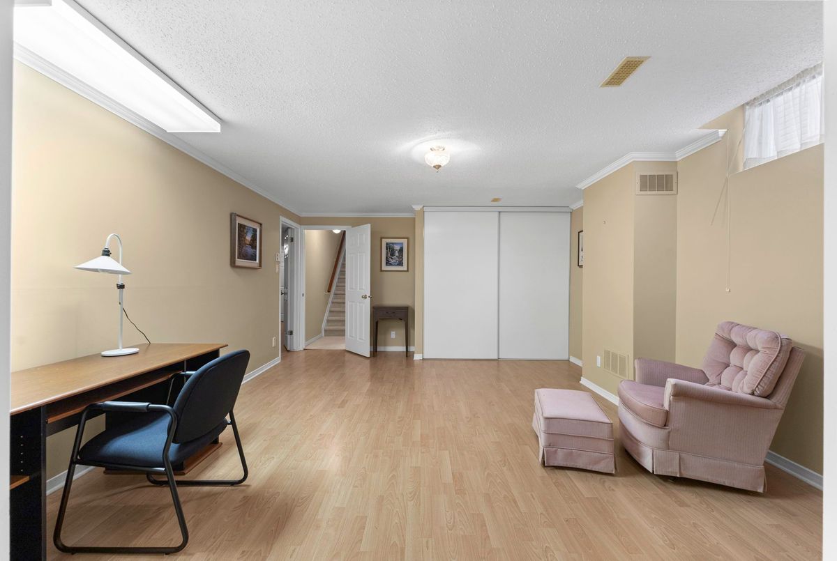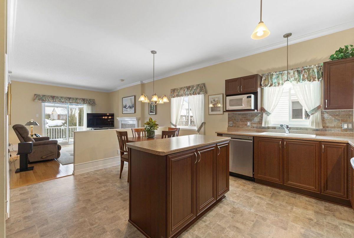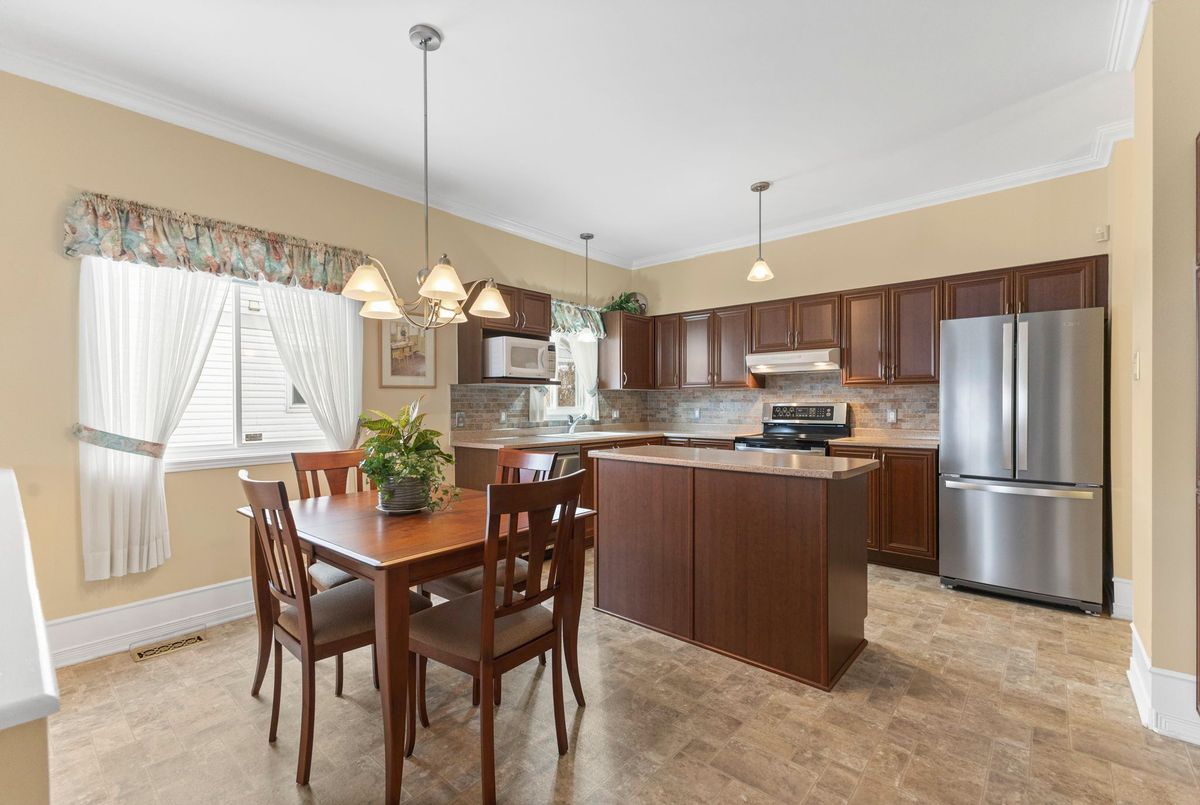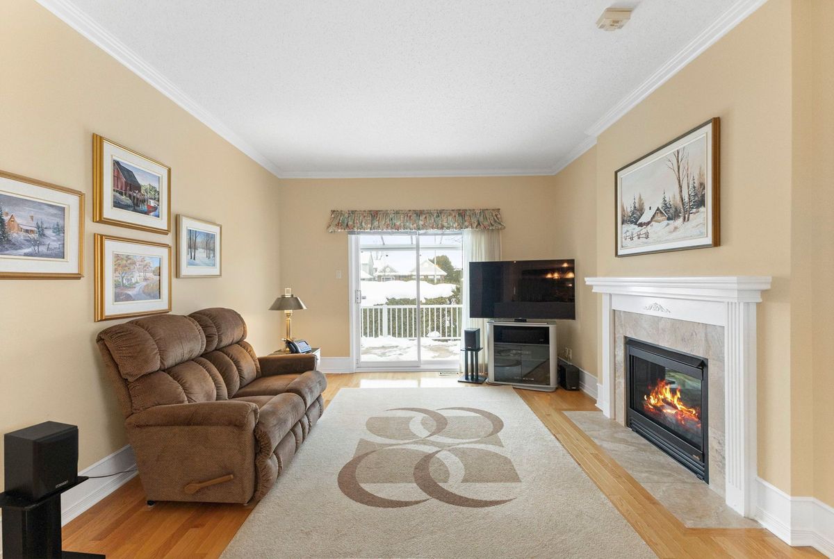 Tucked away on a quiet crescent in the highly sought-after community of Chapel Hill, this very lightly lived-in bungalow offers a rare combination of comfort, privacy, and turnkey living. The crescent itself is surrounded by mature wooded space, creating a peaceful setting with minimal through traffic and a strong sense of privacy throughout the street. Proudly owned and meticulously maintained by the original owners, the home is exceptionally clean and move-in ready. The main floor features 9-foot ceilings throughout, abundant natural light, and large windows that create a bright, welcoming atmosphere. The kitchen is both functional and well appointed with quality cabinetry, an extended pantry, and a convenient eat-in area. The family room showcases hardwood flooring, a cozy gas fireplace, and large patio doors that lead to a fiberglass deck, perfect for enjoying the outdoors. A well-placed, well-lit dining room and a sun-filled living room with a large window offer comfortable spaces for entertaining or relaxing, while the inviting foyer includes a built-in closet. Two bedrooms and two full bathrooms complete the main level, along with access to an oversized single-car garage. The lower level is impressively bright thanks to larger windows and offers three versatile flex spaces, including a rec room, TV room, and an additional recreation area, along with a furnace room providing extra storage and a separate full bathroom.A thoughtfully designed and beautifully maintained bungalow in an exceptional Chapel Hill location.