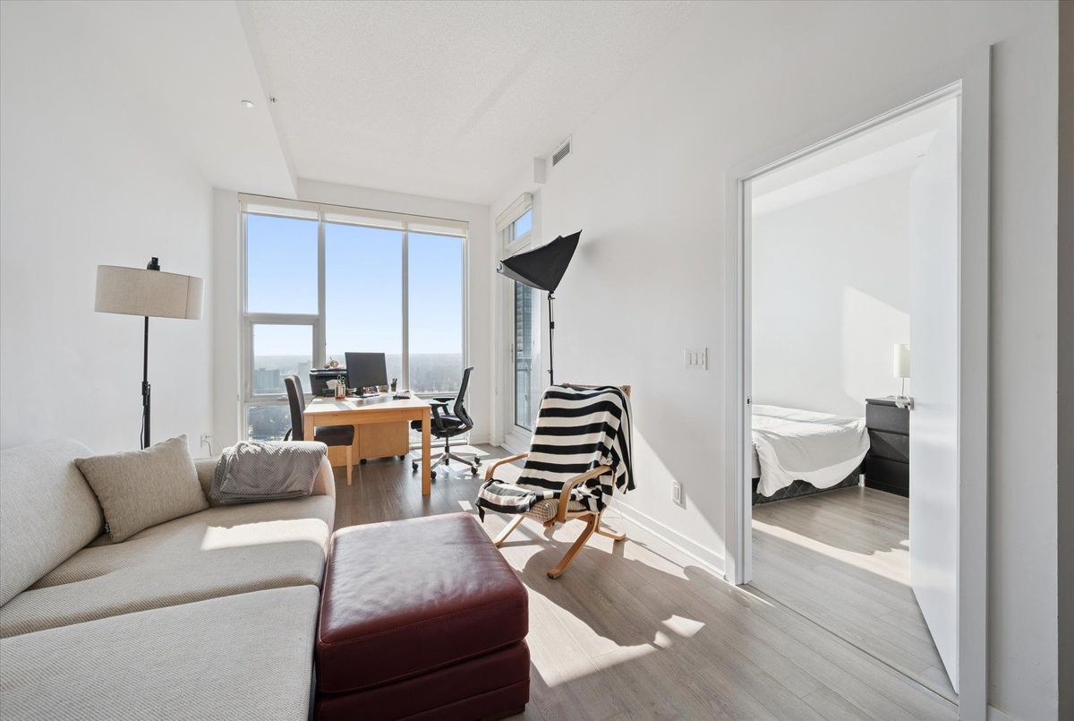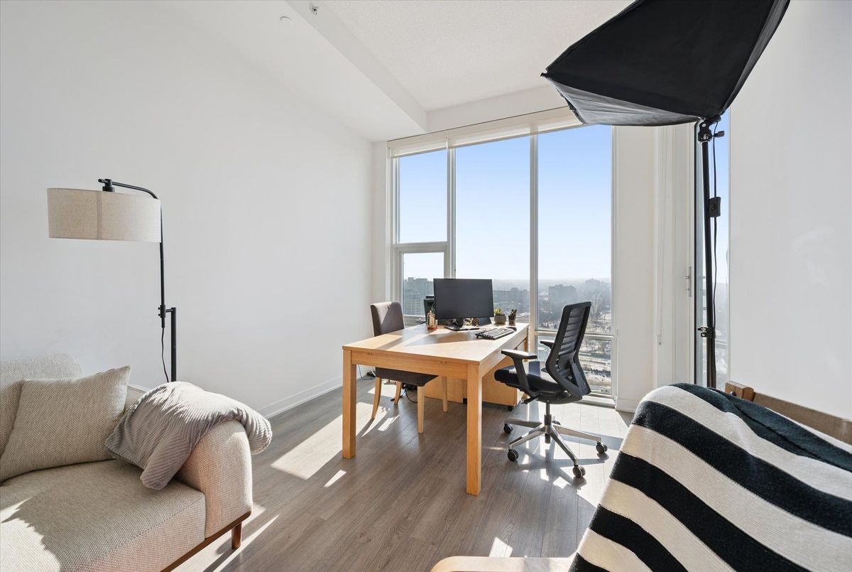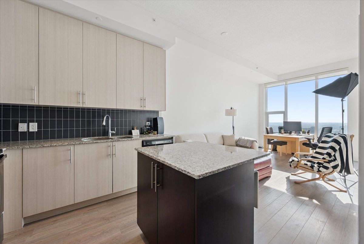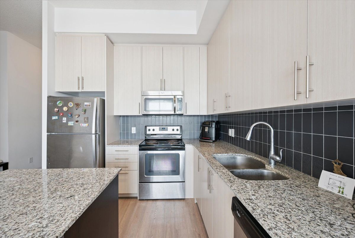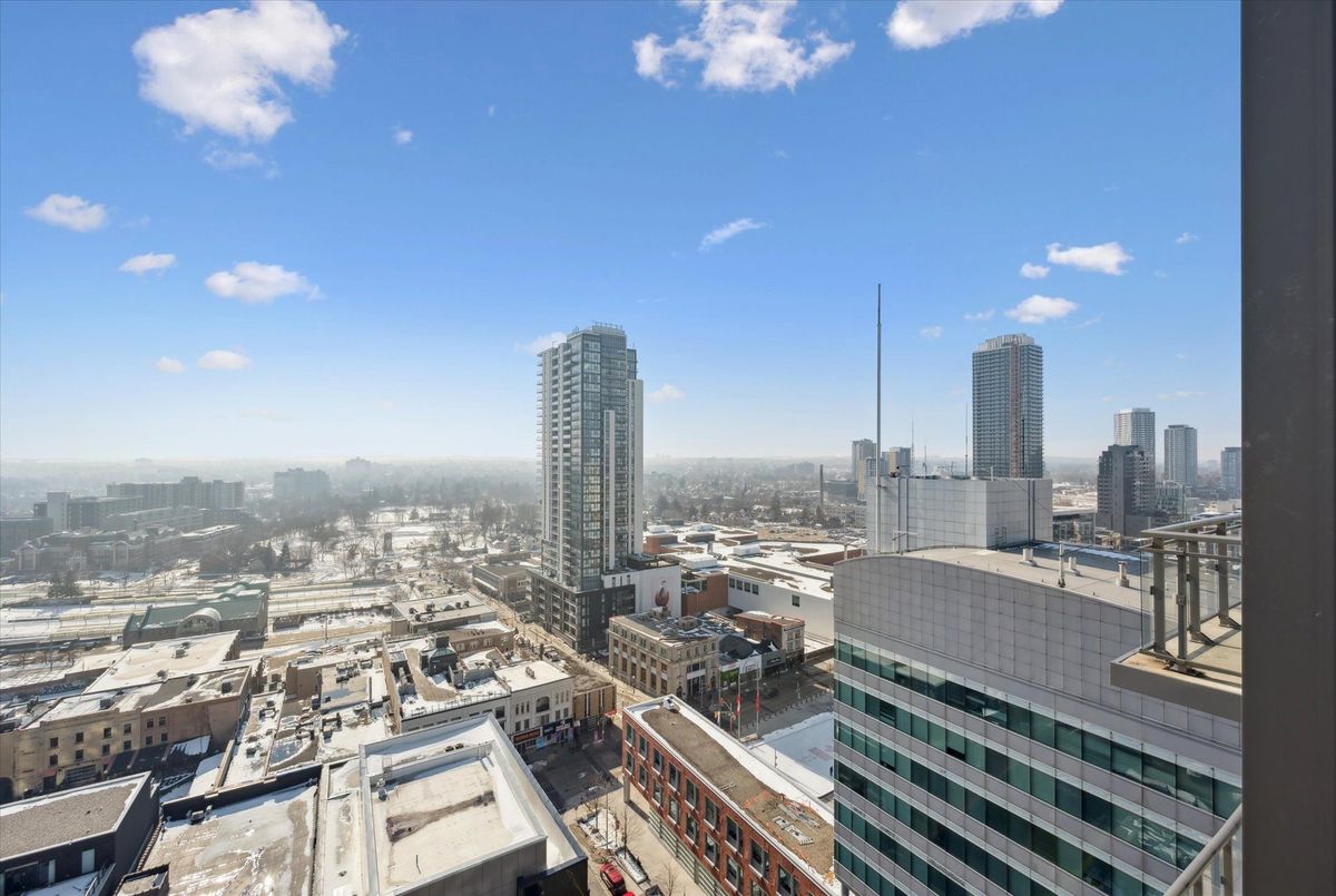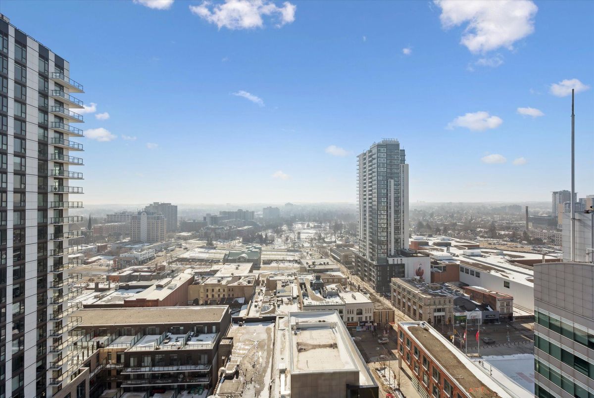 Welcome to the top. Perched above the city at 85 Duke Street West, this 1 Bedroom + Den penthouse suite delivers elevated living in the heart of Downtown Kitchener. Step inside and immediately feel the difference - soaring ceiling heights create an airy, expansive atmosphere rarely found in condo living. Natural light pours through oversized windows, highlighting the clean lines and modern finishes throughout. The kitchen is thoughtfully designed with extended upper cabinetry, offering valuable additional storage while maintaining a sleek, contemporary aesthetic. Whether you're entertaining guests or enjoying a quiet night in, the open-concept layout provides effortless flow between kitchen, dining, and living spaces. The spacious primary bedroom offers comfort and privacy, while the versatile den is perfect for a home office, guest space, or creative studio - ideal for today's flexible lifestyle. Step out and unwind with west-facing views, where you'll enjoy stunning sunsets and warm afternoon light - a true penthouse perk. Unit Highlights: Penthouse level with elevated privacy, Impressive ceiling heights, Larger upper kitchen cabinets for added storage, Functional 1 Bed + Den layout, West-facing exposure with sunset views, Located in the vibrant Downtown Kitchener core, Just steps to the LRT, restaurants, tech hubs, and Victoria Park, this is urban living at its finest.