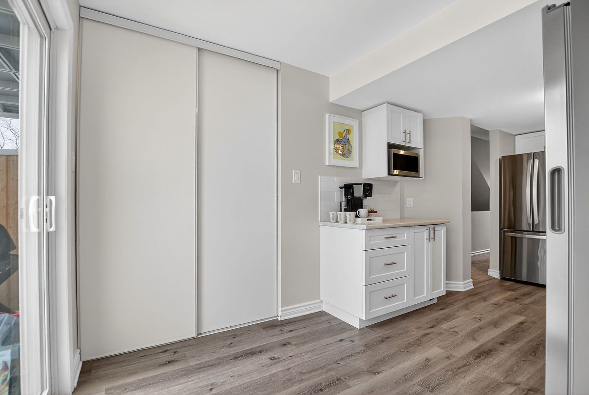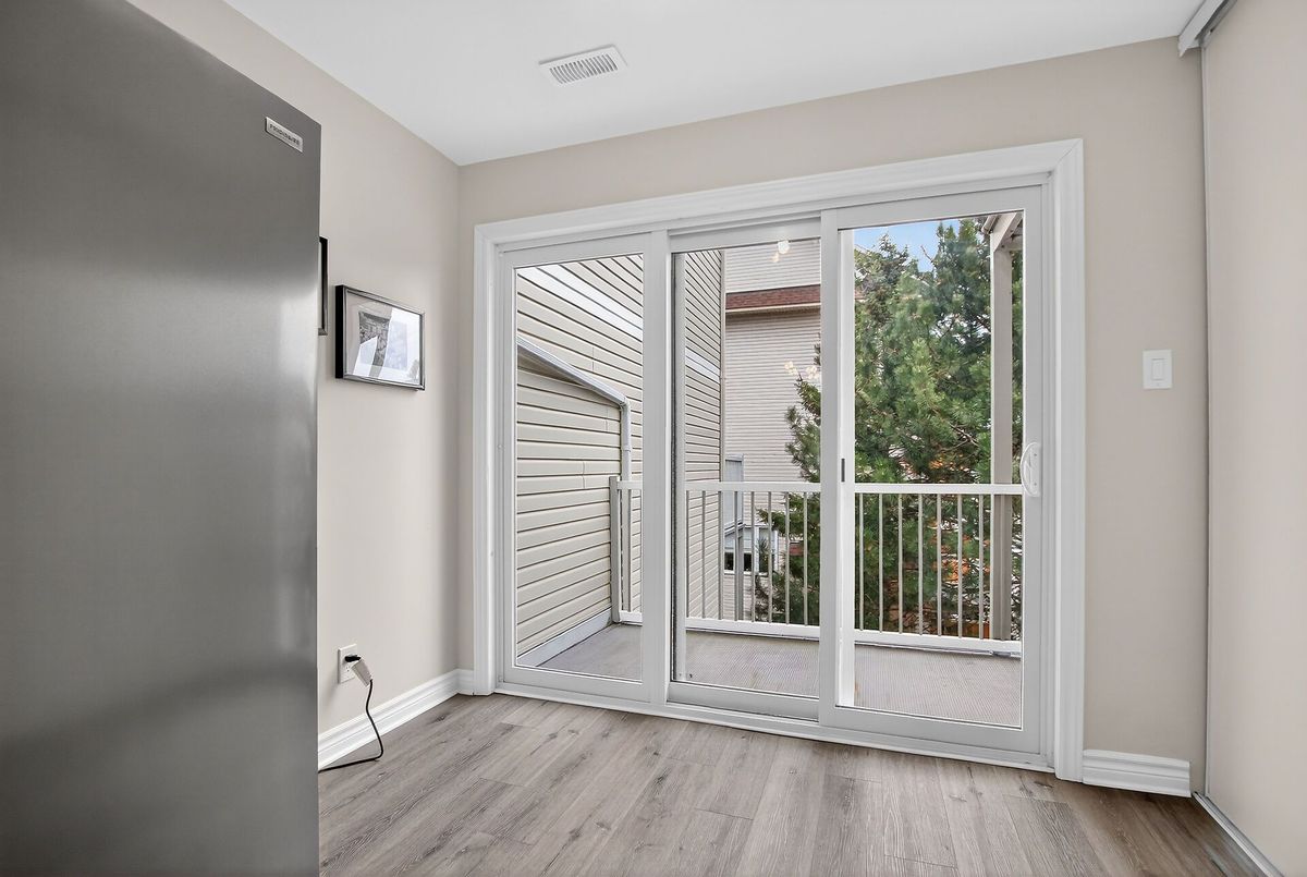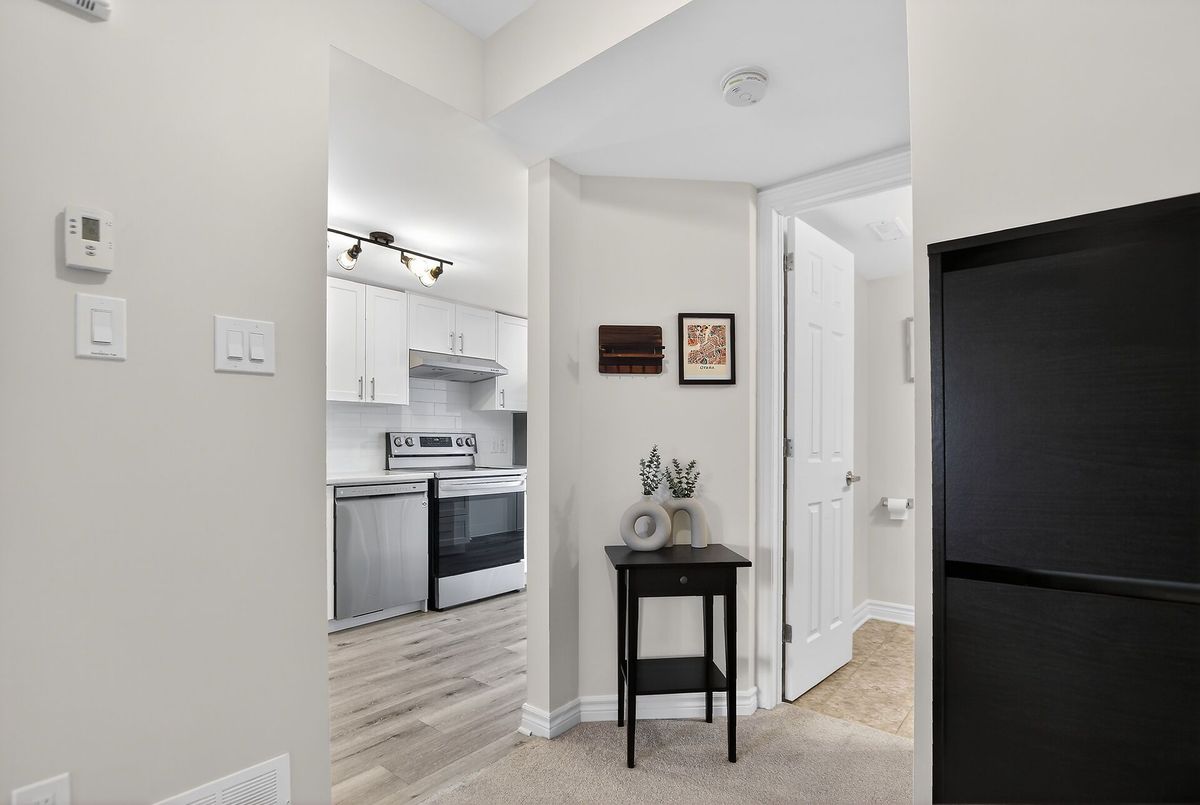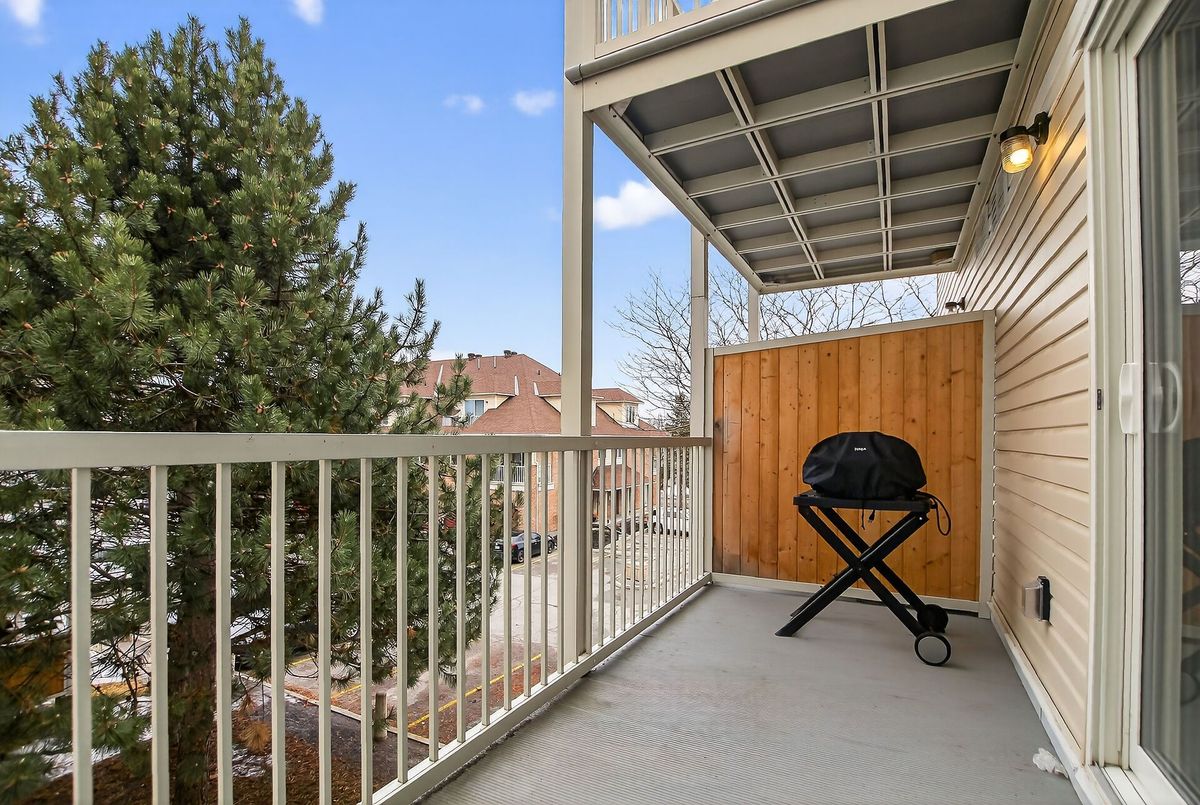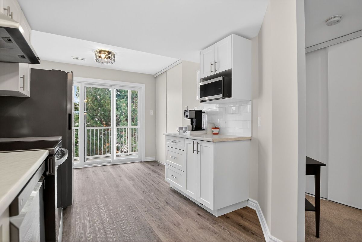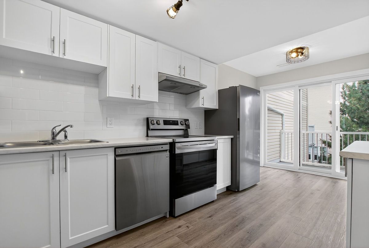 Why rent when you can own? This affordable stacked townhome, with low monthly costs, is a smart step into homeownership and a powerful way to start building equity. And what's even better? It's completely renovated with beautiful updates from top to bottom. The open concept main level flows seamlessly from the light-filled living room into the dining area. A stylish kitchen anchors the space with white cabinetry, a generous walk-in pantry for small appliances and dry goods, a dedicated coffee bar, and a casual eating area perfect for starting the day. A balcony extends the living space, offering a spot for summer grilling or enjoying coffee beside a mature tree that provides natural privacy. Upstairs, the spacious primary bedroom features its own private balcony, a full wall of closets, and access to a cheater ensuite. A bright second bedroom offers flexibility for guests, children, or a home office. A large laundry room also provides excellent storage. Major updates completed in 2023 include a new furnace, air conditioning, flooring, rear windows, and patio door. Close to shops, cafés, gyms, transit, and commuting routes. Don't wait to book a visit!!