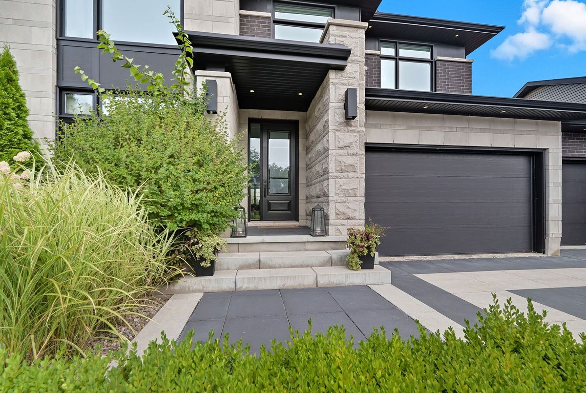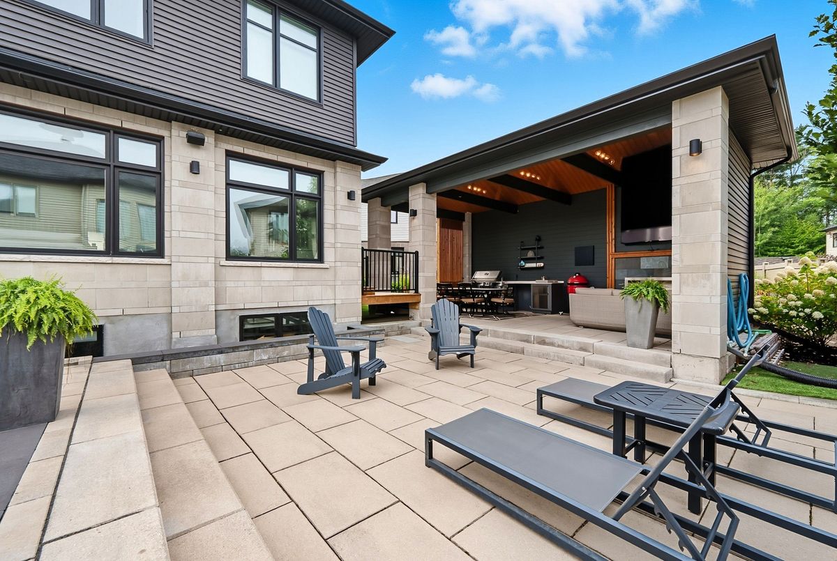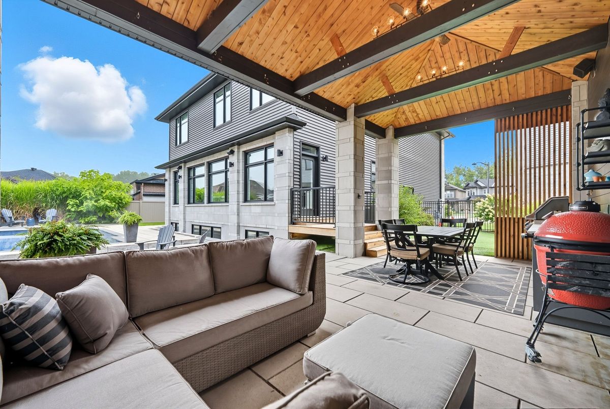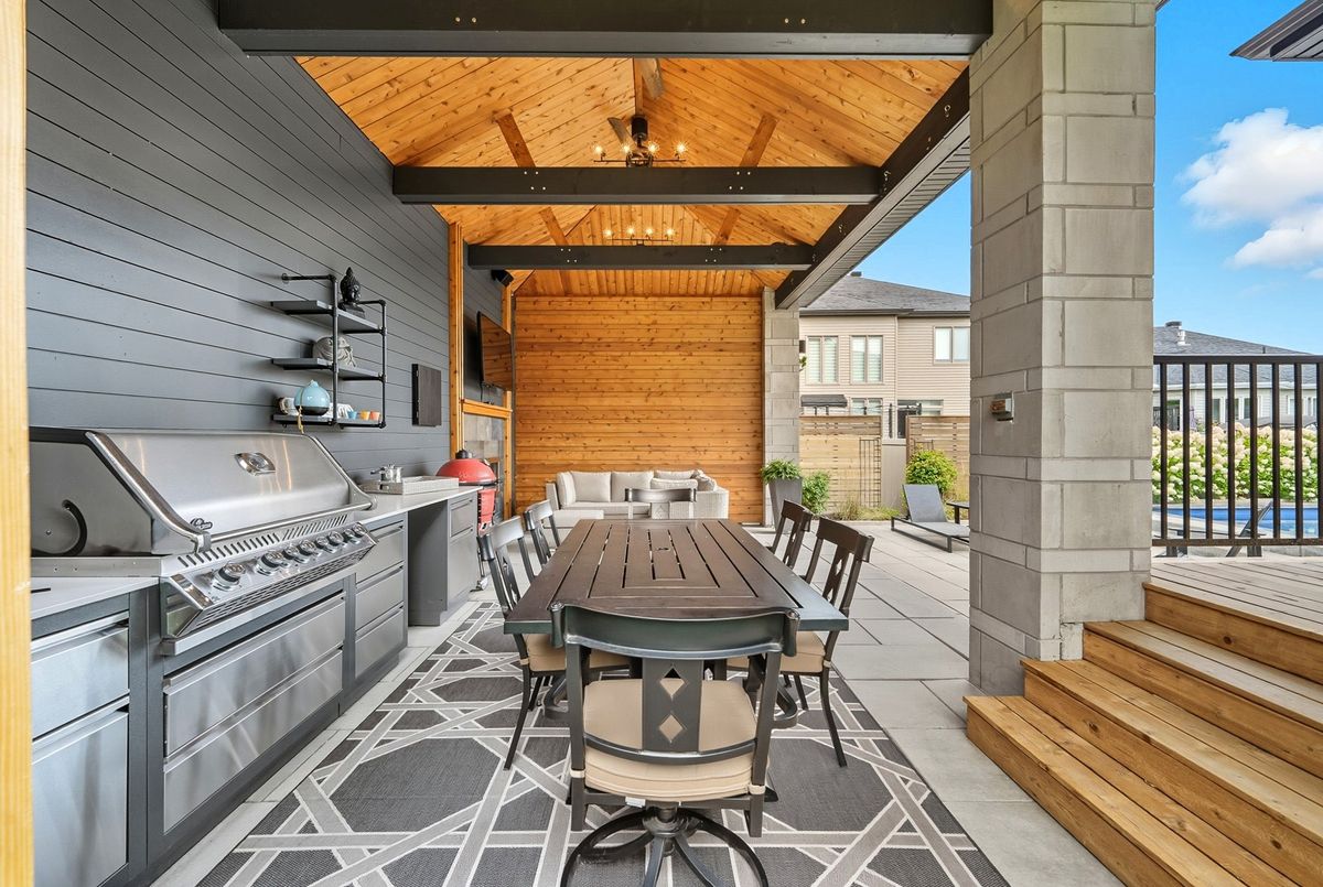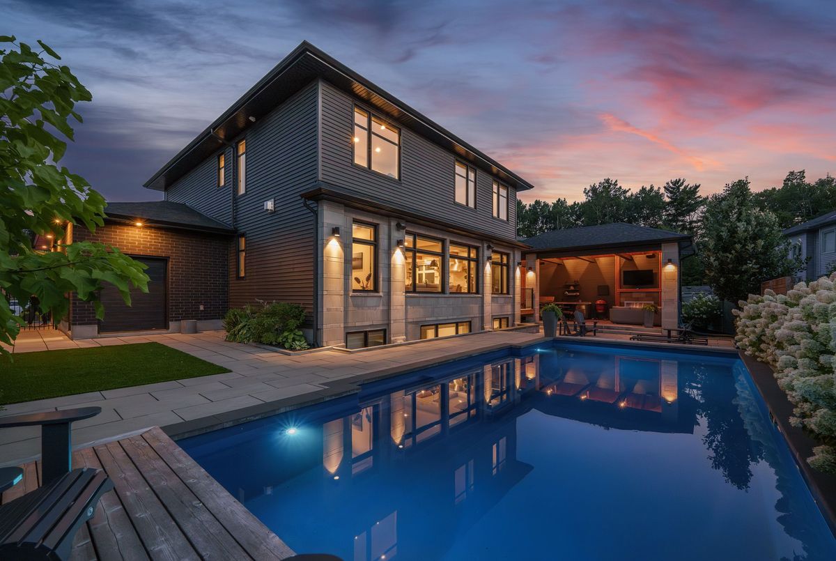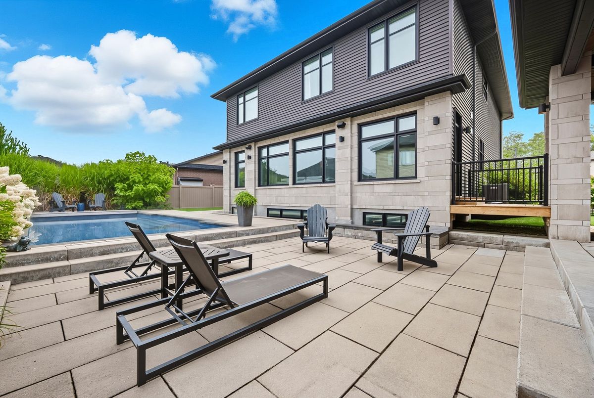 This stunning 5 bedroom home blends architectural sophistication with modern comfort, set in one of Orleans' most prestigious communities of Trails Edge. Its striking stone-and-brick exterior, modern landscaping and triple-car garage make an unforgettable first impression. Step outside to your backyard oasis - an entertainer's paradise featuring an inground pool, sleek stone patio, and a rustic-style covered pavilion with exposed beams, built-in gas BBQ, gas fireplace, TV area, and ample space to dine or lounge in style. Professionally landscaped for elegance and low maintenance, this outdoor retreat is perfect for summer gatherings and entertaining. Inside, rich hardwood flows throughout, complemented by pot lights and expansive windows that flood the home with natural light. The main level features a living room with gas fireplace, a private office with built-ins, and a chef's kitchen designed to impress - high-end appliances, gas stove, oversized island with seating for six, custom drawers, accent wood beams, and a convenient butler style service kitchen with two mini fridges, perfect for coffee, cocktails, or entertaining guests. Upstairs, the lavish primary suite boasts a boutique-style walk-in closet with island and a spa-inspired 5-piece ensuite with soaking tub, glass shower with rain head, and floating dual-sink vanity. Each secondary bedroom offers a walk-in closet and ensuite bath, while a generous laundry room with built-in storage completes the upper level. The finished lower level expands living space with a recreation area, wet bar, two bedrooms, a full bath, and abundant storage, creating an ideal retreat for family and guests. Combining modern elegance, sophisticated living, and exceptional walking access to top elementary and secondary schools, parks, and amenities, this home delivers the ultimate in comfort and style. ...