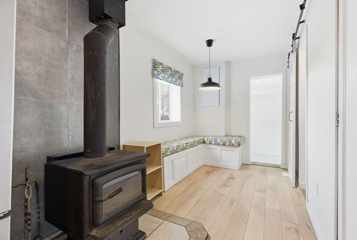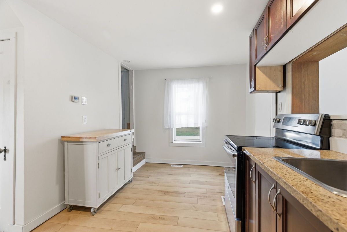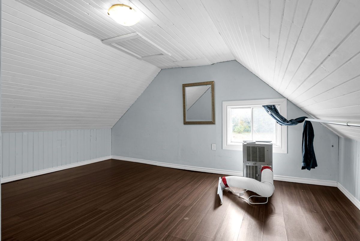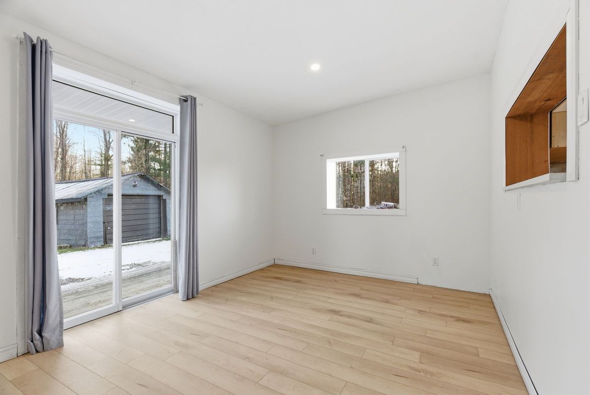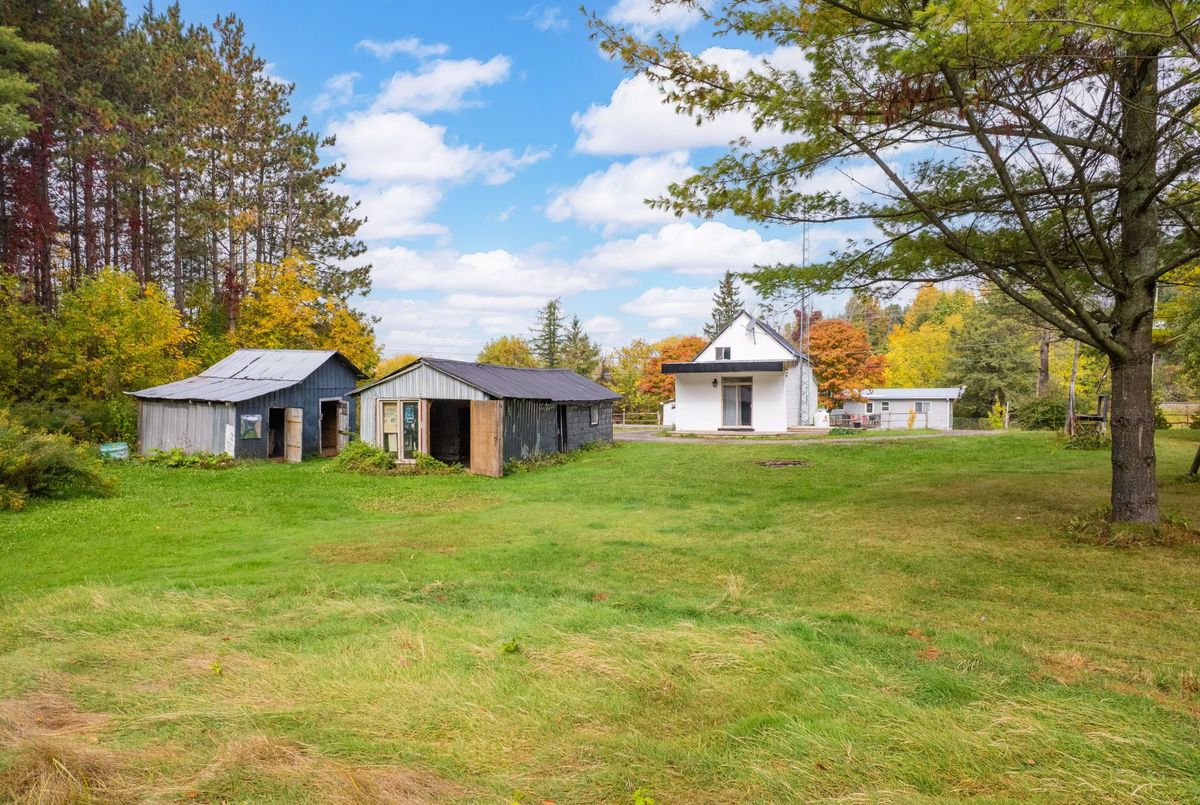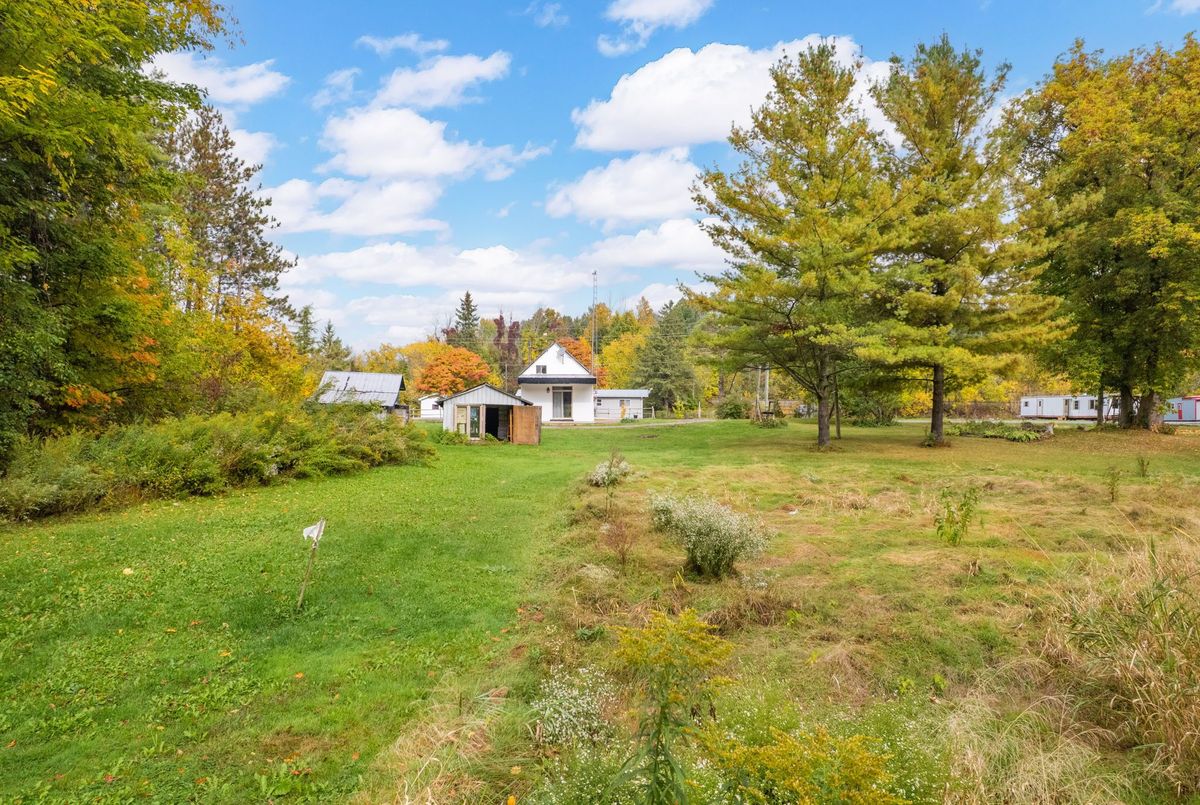 Charming farm style residence boasting a crisp white exterior with contrasting black roof in the quiet village of Mountain, North Dundas. Set on a sprawling 0.98-acre south-facing lot surrounded by nature, the grounds offer plenty of cleared space for gardening or recreation and the soaring trees provide a picturesque backdrop. Bonus detached garage is perfect for the hobbyist! Step inside and be greeted by your foyer and main floor laundry, followed by the eating area. The L- shaped kitchen features granite counters, ceramic backsplash, and plenty of cabinetry for storage. At the back of the home a spacious family room is a great space for entertainment and leads directly to your wood patio overlooking the backyard. Modern 4pc main bathroom with decorative panelled wall, tile floor, vanity with matte black hardware, and tub/shower with white tile surround. Upstairs is the primary bedroom and 2nd bedroom. Fresh cosmetic improvements in November 2025 include painting and wide plank laminate floors on the main level.