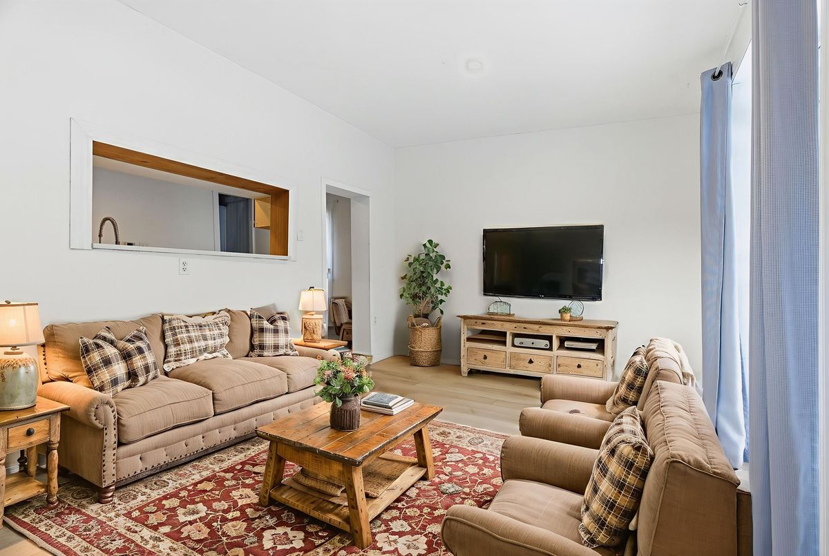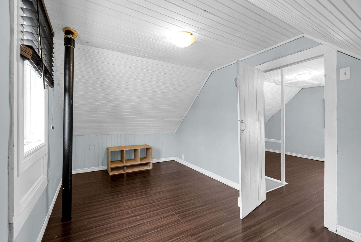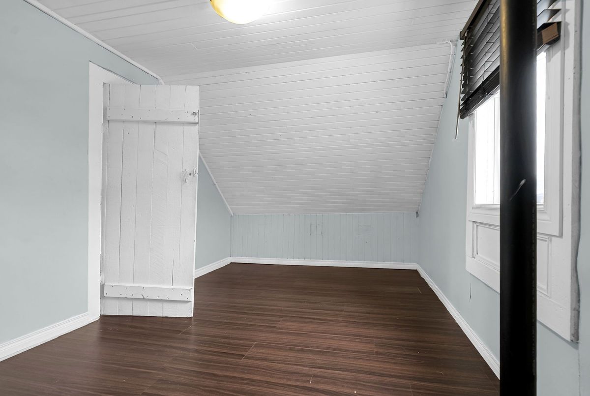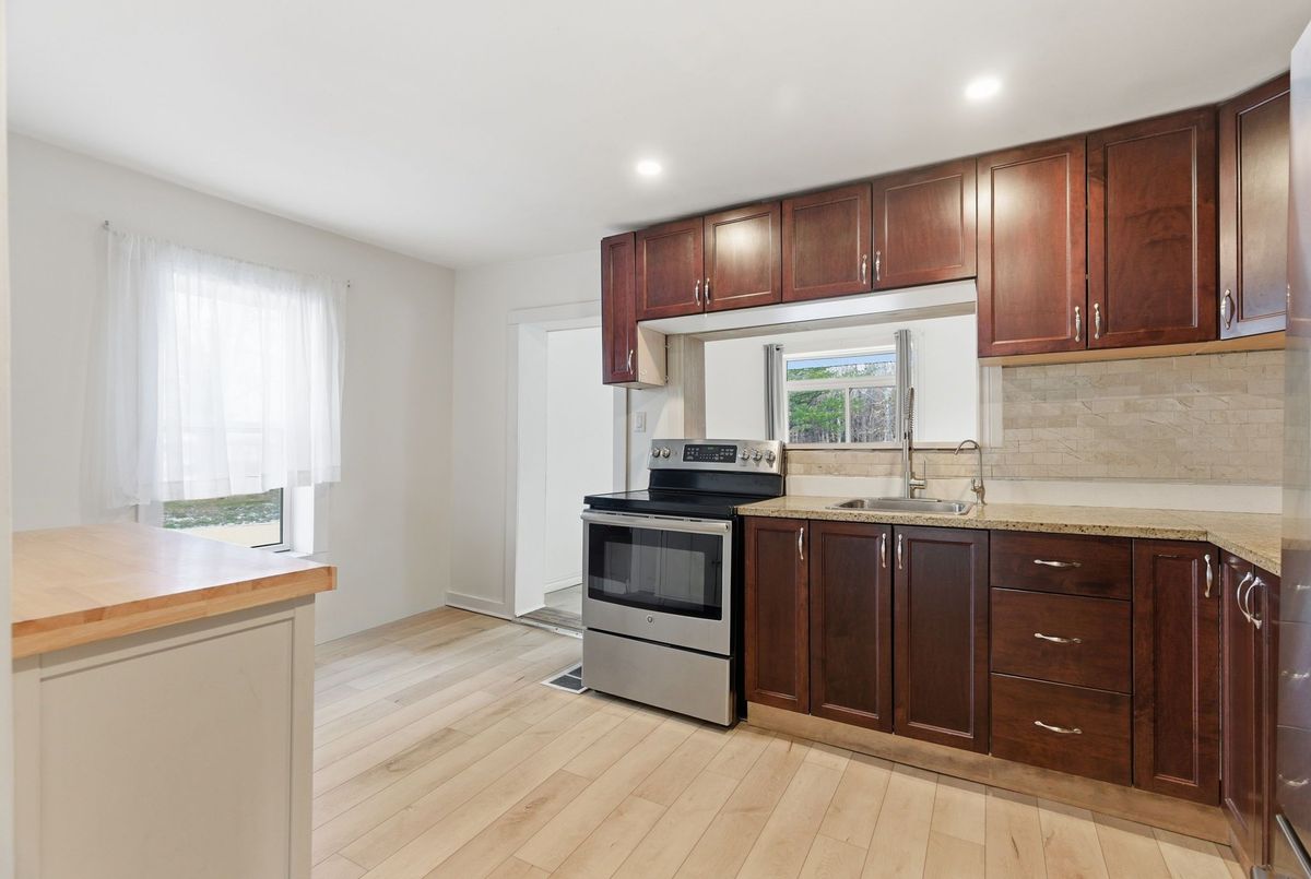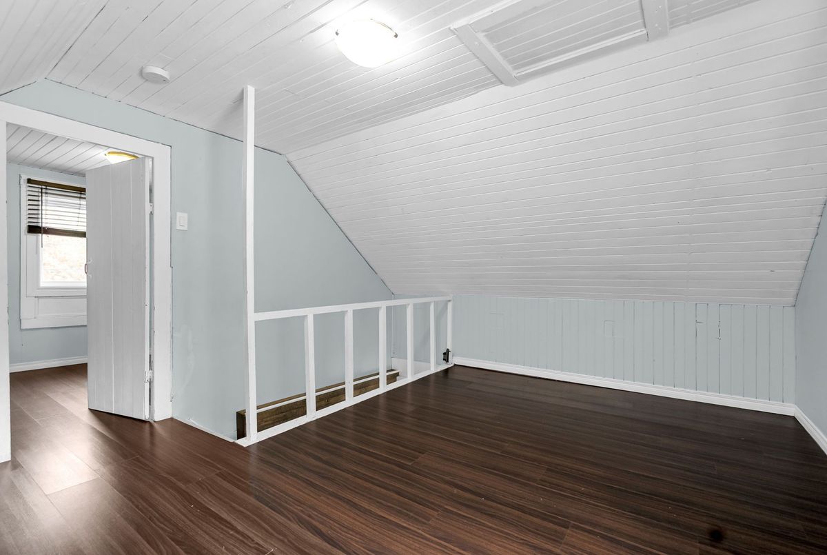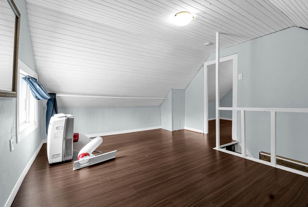 Charming farm style residence boasting a crisp white exterior with contrasting black roof in the quiet village of Mountain, North Dundas. Set on a sprawling 0.98-acre south-facing lot surrounded by nature, the grounds offer plenty of cleared space for gardening or recreation and the soaring trees provide a picturesque backdrop. Bonus detached garage is perfect for the hobbyist! Step inside and be greeted by your foyer and main floor laundry, followed by the eating area. The L- shaped kitchen features granite counters, ceramic backsplash, and plenty of cabinetry for storage. At the back of the home a spacious family room is a great space for entertainment and leads directly to your wood patio overlooking the backyard. Modern 4pc main bathroom with decorative panelled wall, tile floor, vanity with matte black hardware, and tub/shower with white tile surround. Upstairs is the primary bedroom and 2nd bedroom. Fresh cosmetic improvements in November 2025 include painting and wide plank laminate floors on the main level.